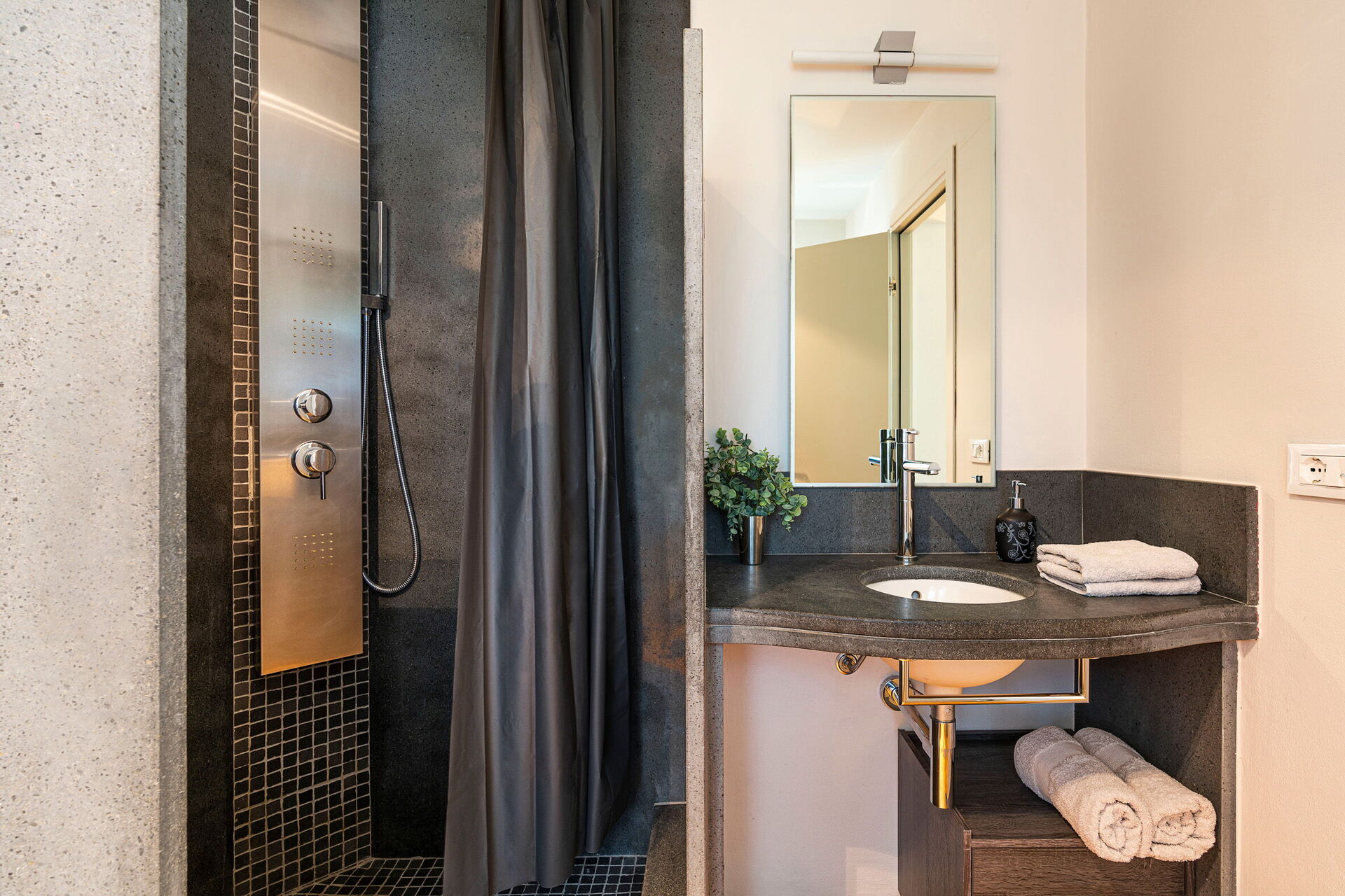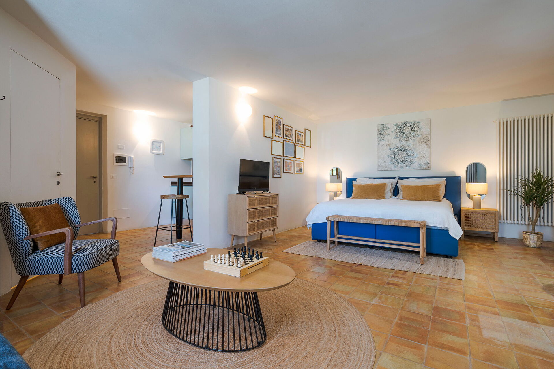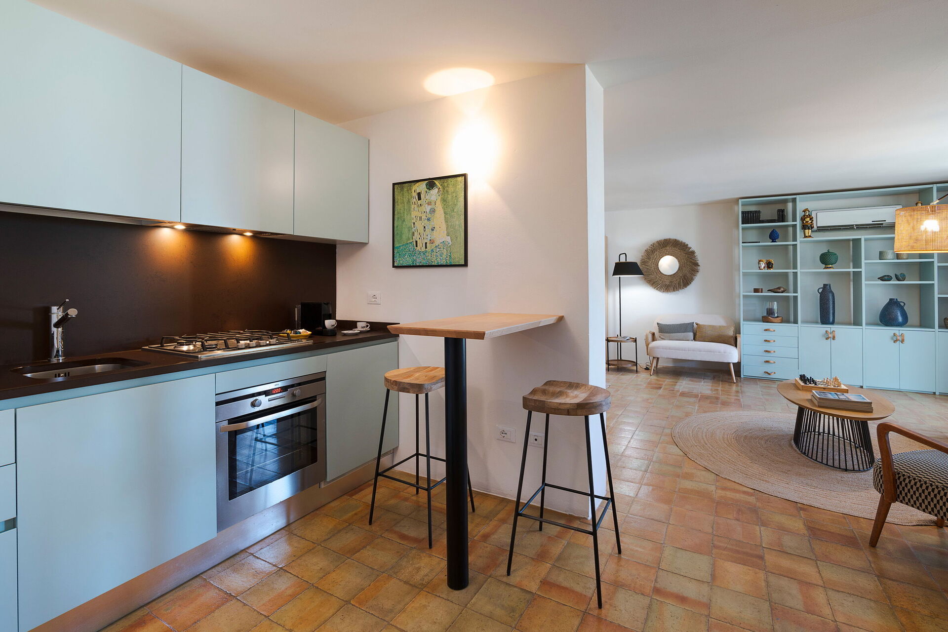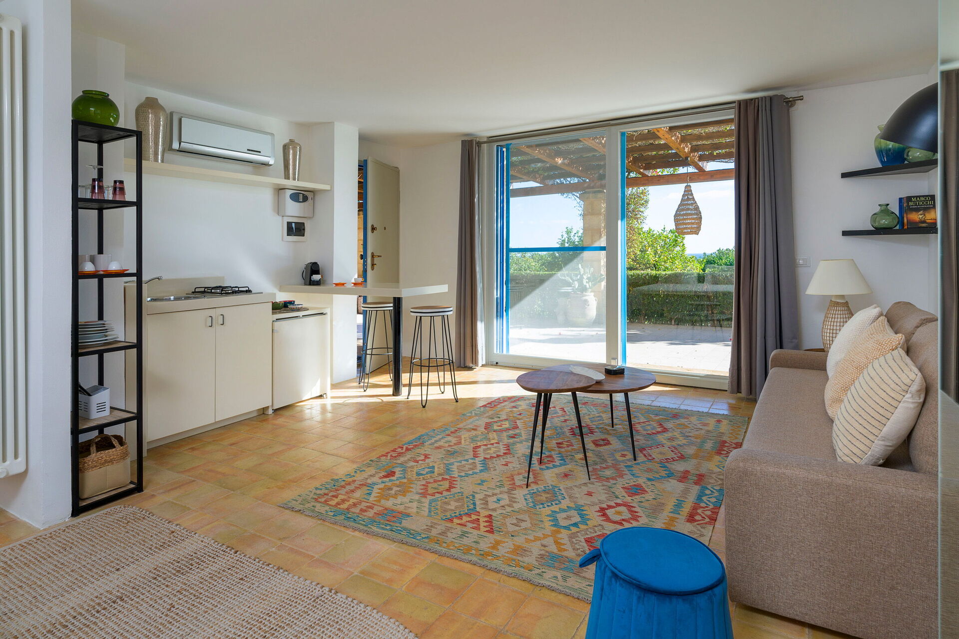 Ground floor (accessible from outside the villa): open space with double bed (air-conditioning) with single sofa bed and kitchenette (hob, fridge) and bathroom with shower.