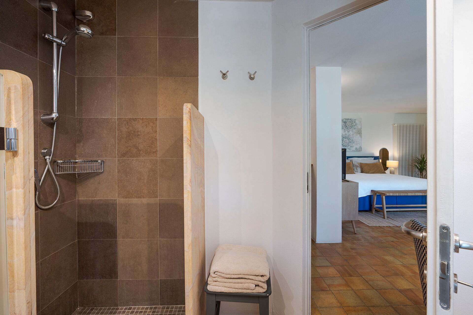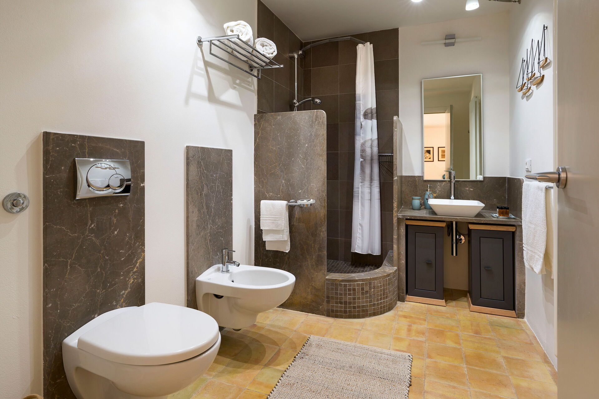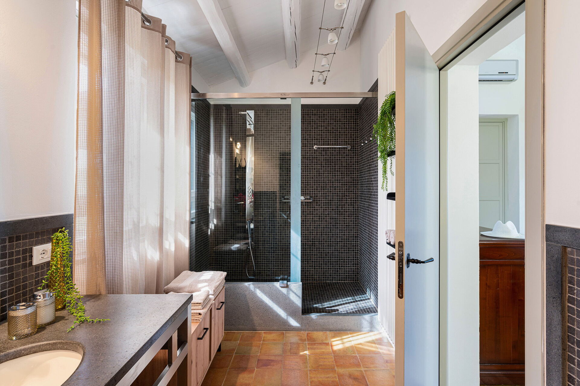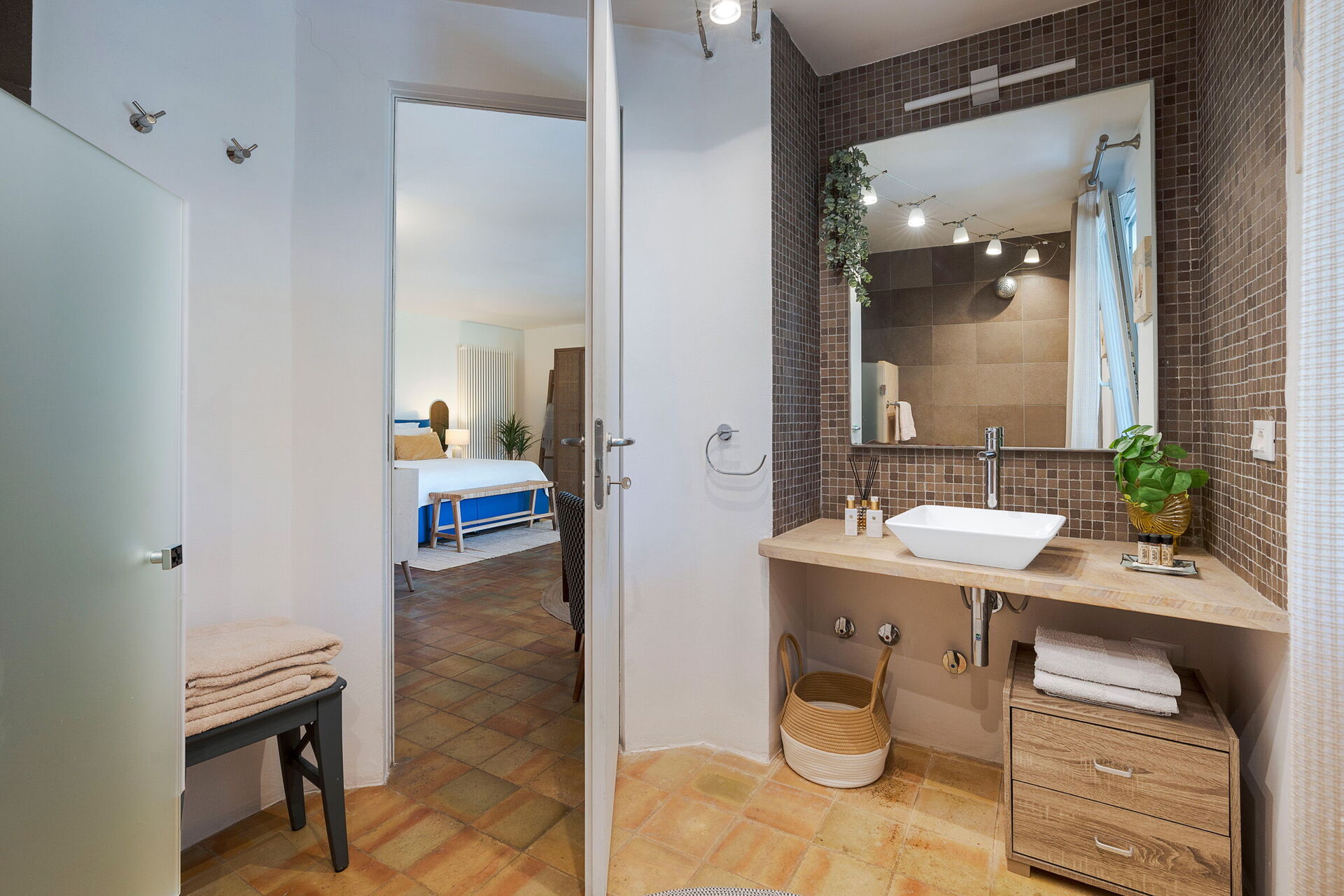 Ground floor (accessible from outside the villa): open space with double bed (air-conditioning) with single sofa bed and kitchenette (hob, fridge) and bathroom with shower.