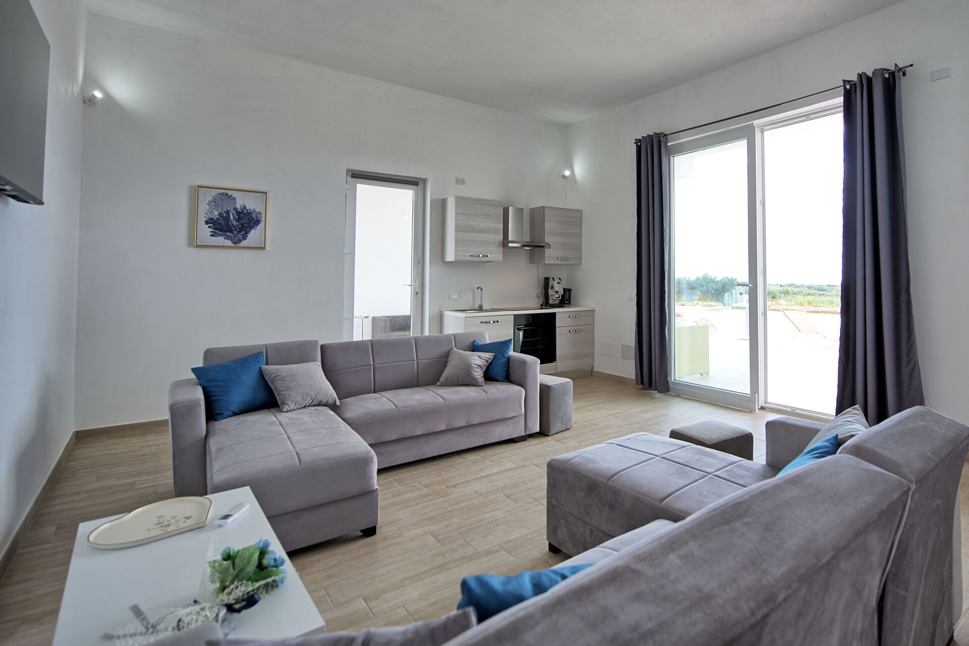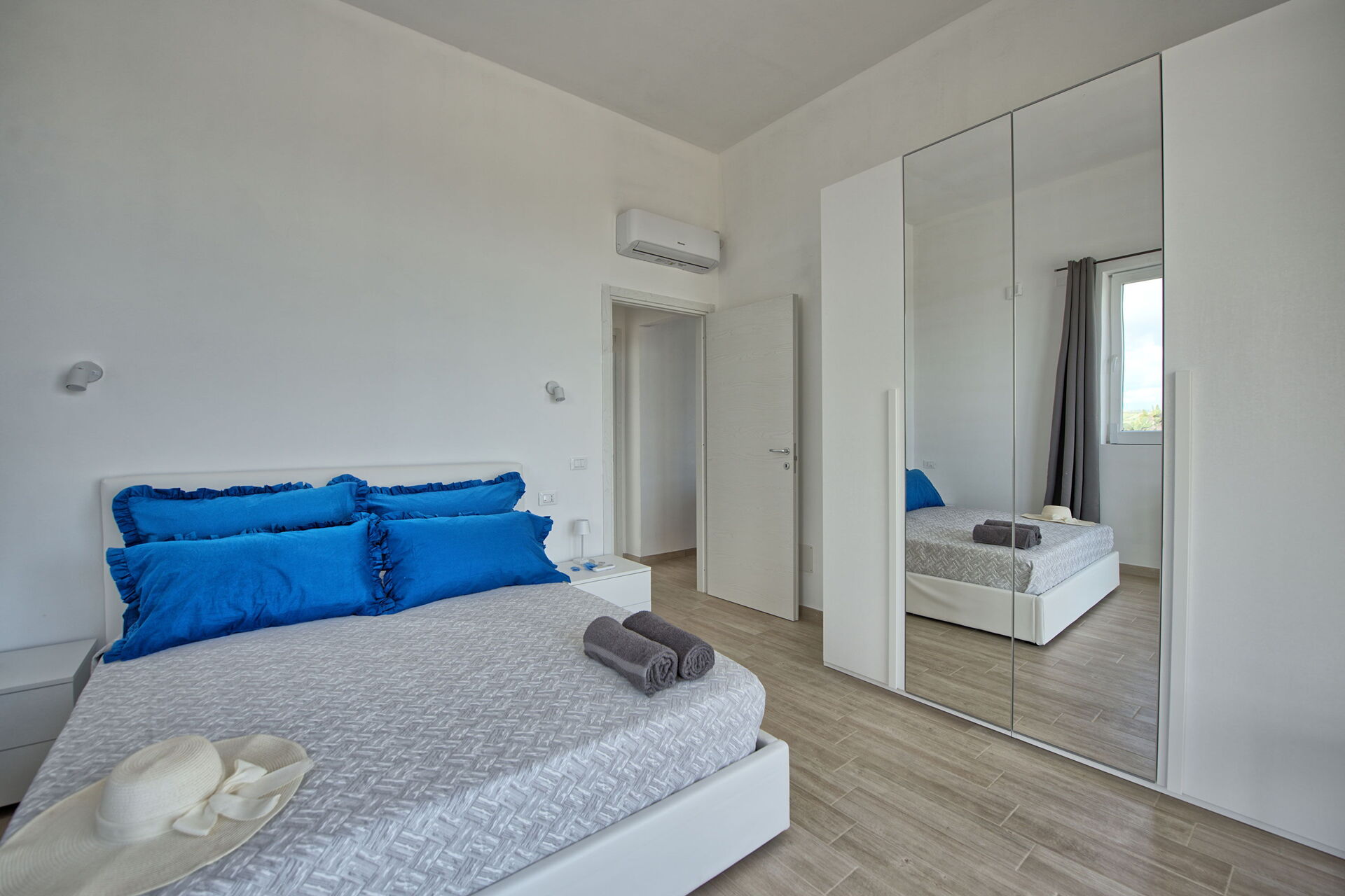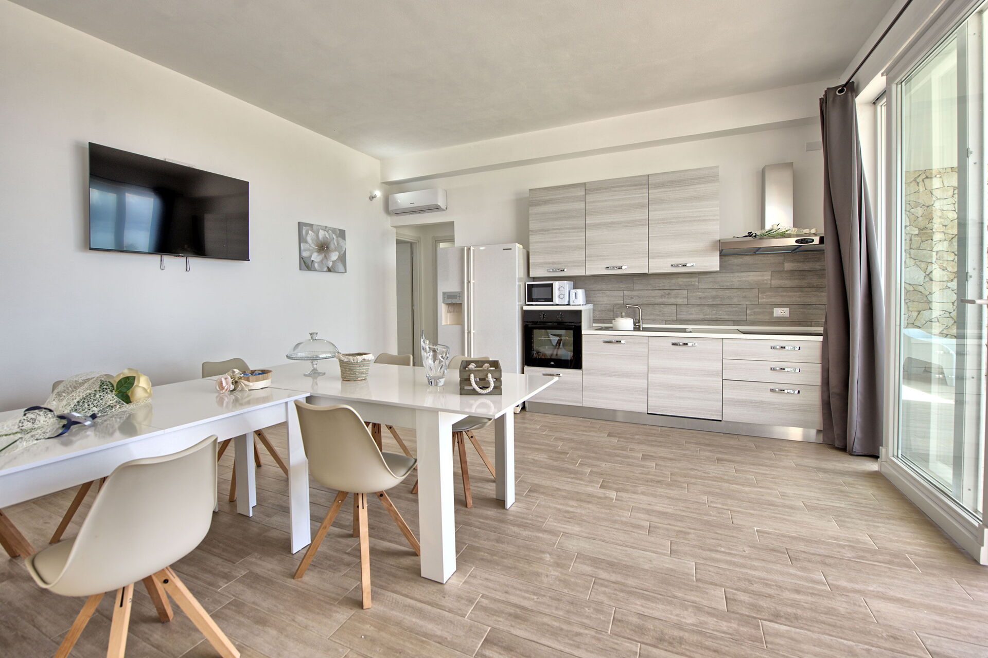 Ground floor: kitchen (cooktop, oven, refrigerator, freezer, dishwasher, microwave, toaster, espresso coffee maker) with dining area, double bedroom (air conditioning) with direct outdoor access, bathroom with shower, bedroom with 2 single beds (air conditioning).