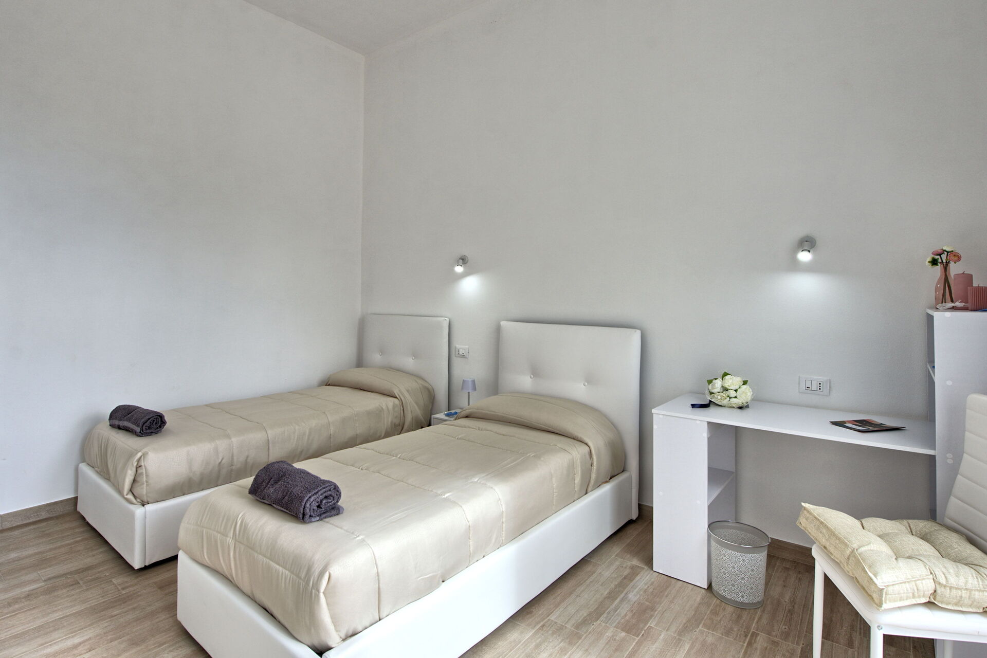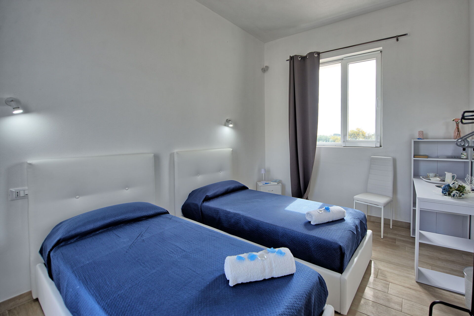 Ground floor (accessible from the outside only, and not connected inside to the rest of the villa): >: entrance and living room with kitchen corner (oven, refrigerator, espresso coffee maker), double bedroom (air conditioning) with direct outdoor access, bathroom with shower, bedroom with 2 single beds (air conditioning).