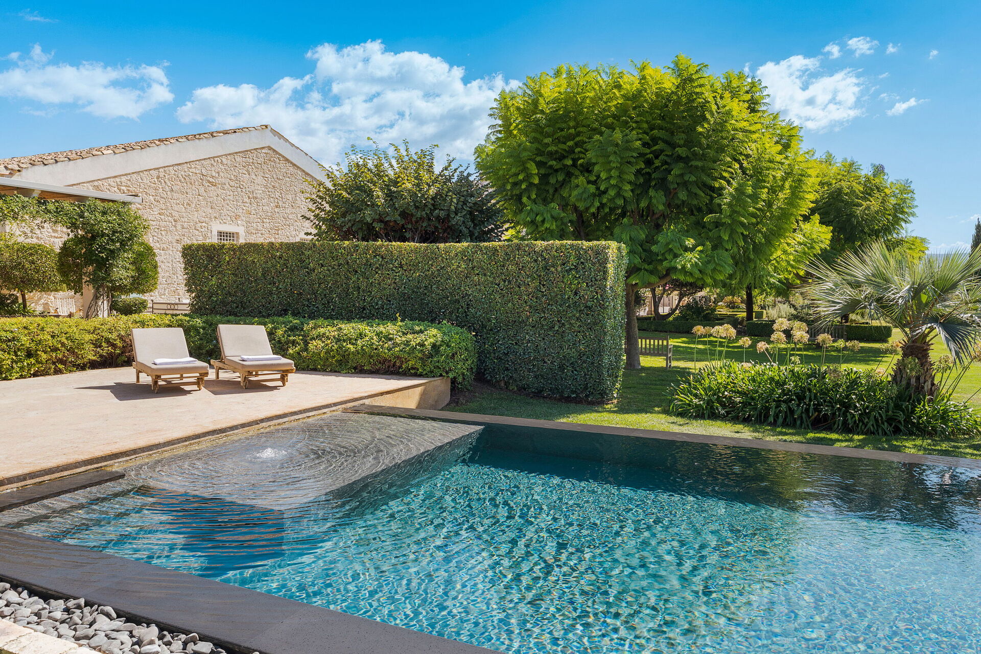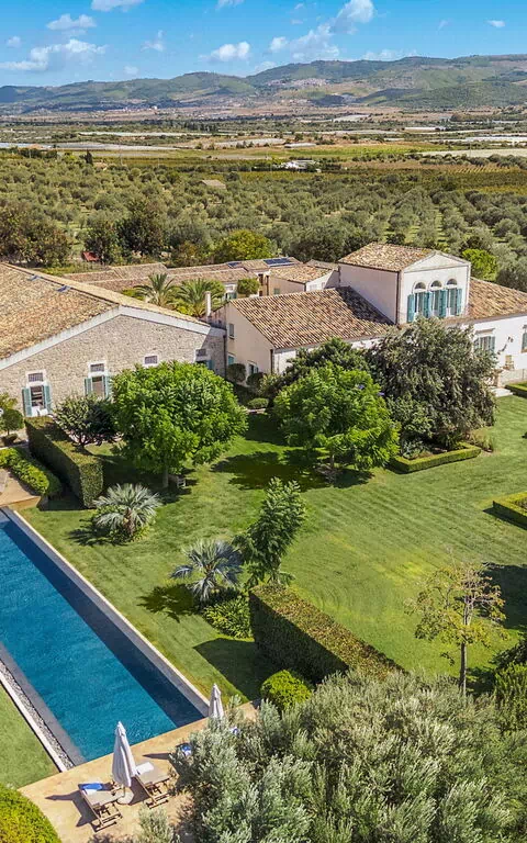 Large, luxurious vacation property rental with a private pool in Sicily: it is located in a tranquil, sunny spot framed by olive groves.
