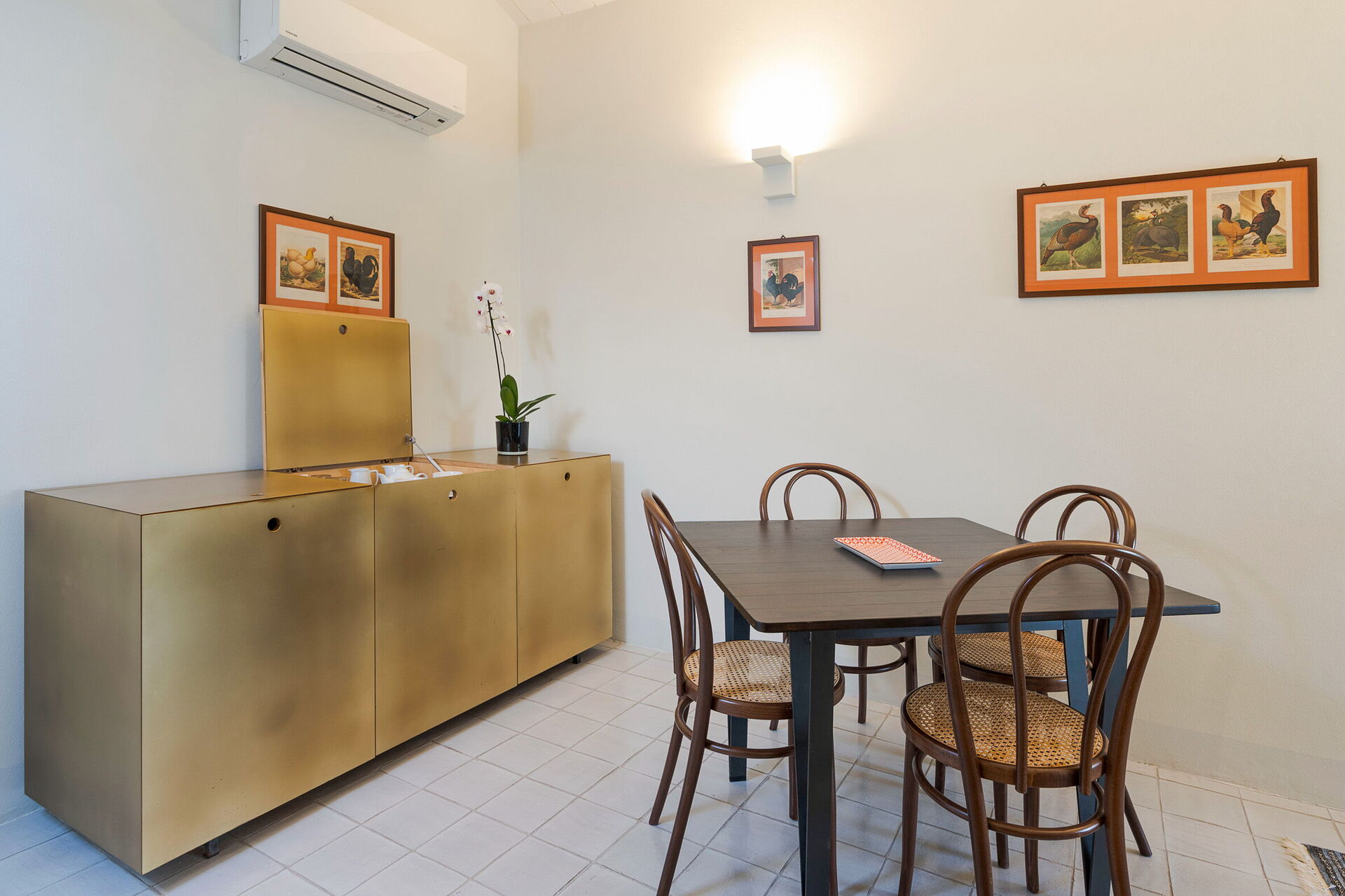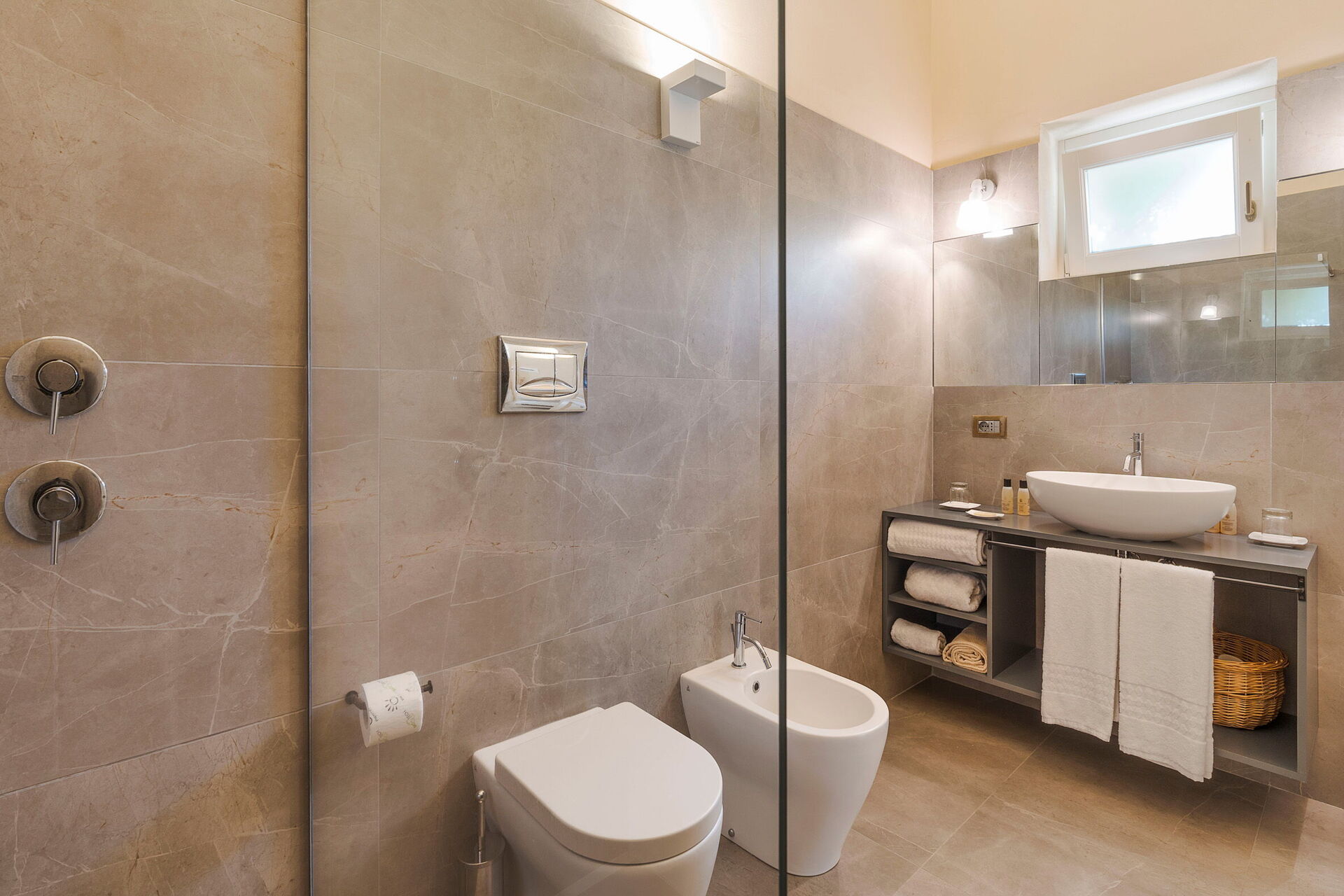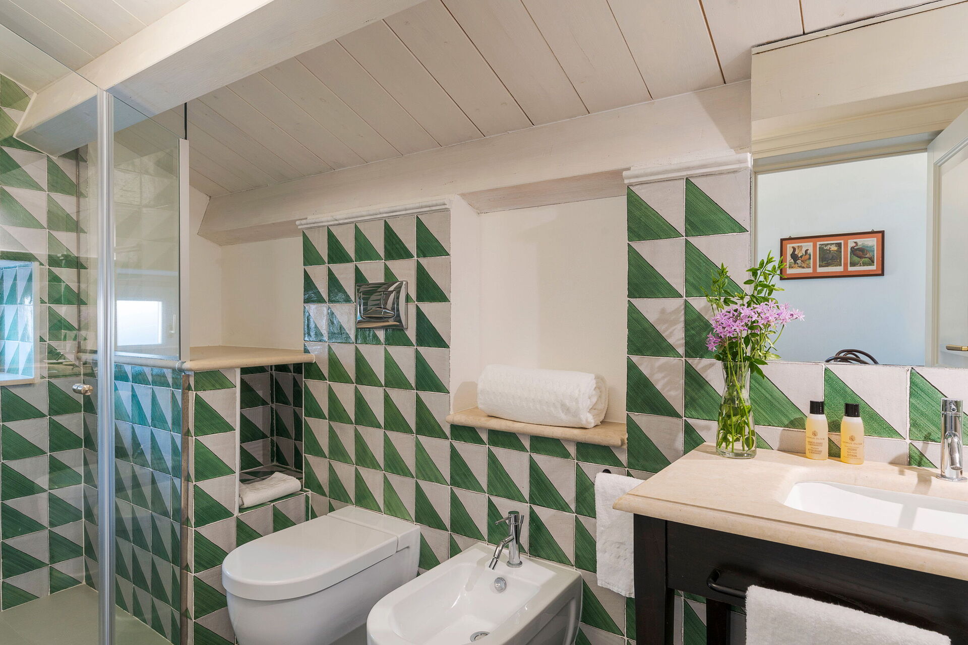 Ground floor (accessible only from the outdoor courtyard, and not connected to the rest of the villa on the inside): bedroom with double bed (can be converted to 2 single beds upon request, bed dimensions: 200/100 x 200 cm) with kitchen corner and small refrigerator, and with private bathroom with shower.