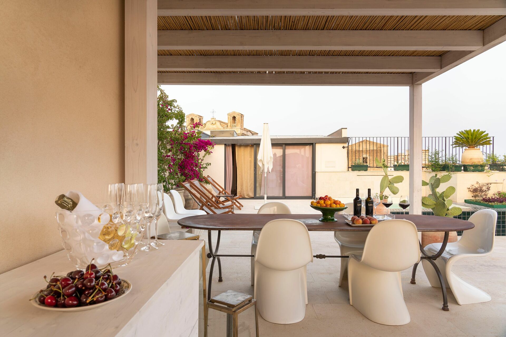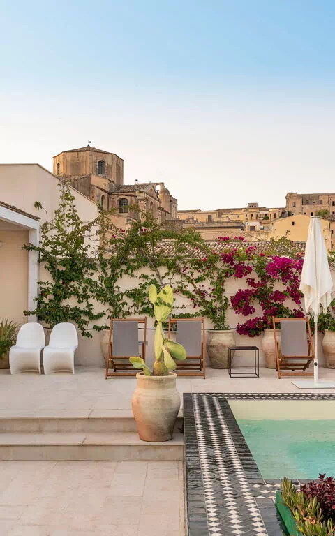 Located on the second and third floors of a prestigious elevator building, this exclusive vacation apartment rental in Sicily offers a large terrace with mini pool and a splendid view of the old city center rooftops.