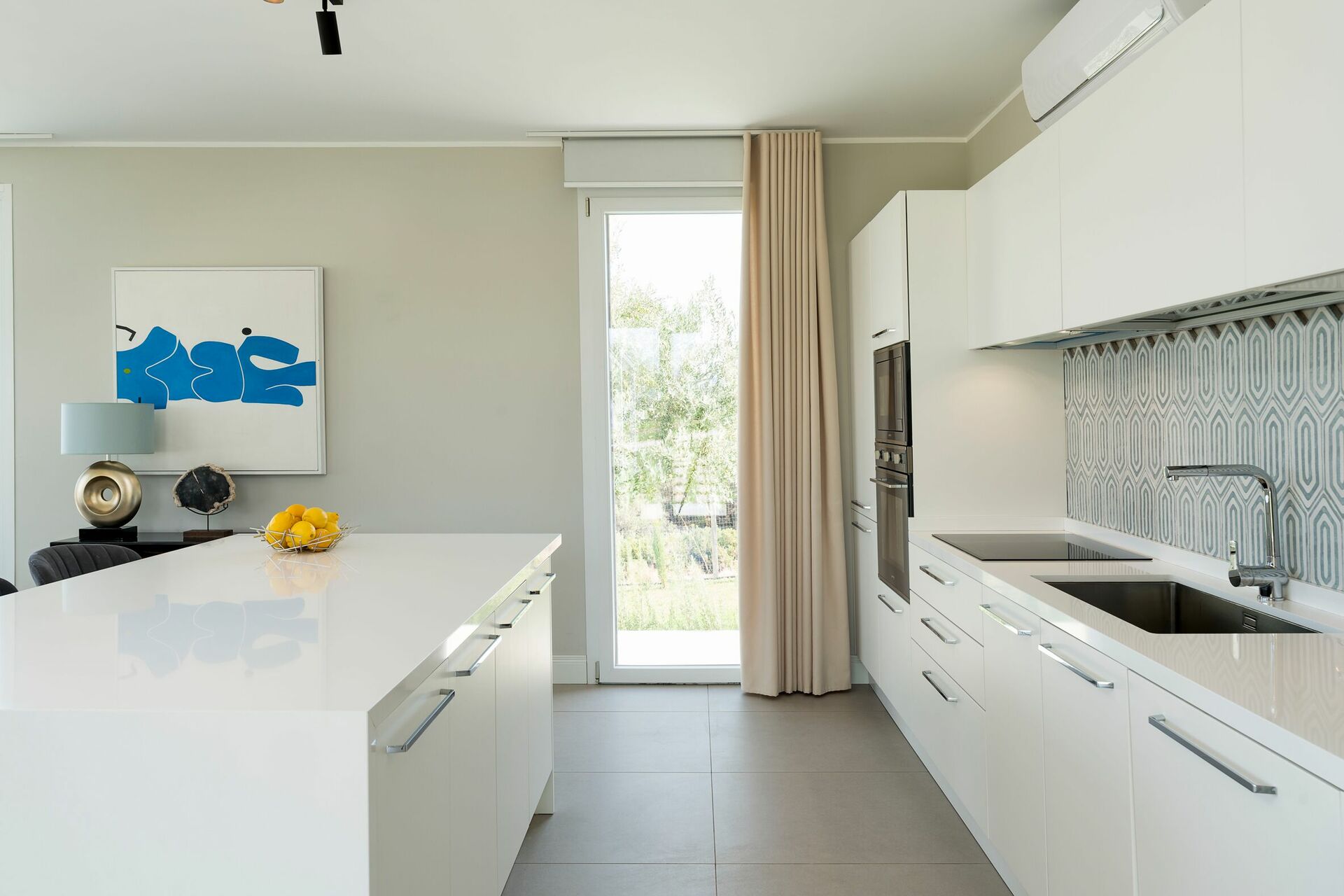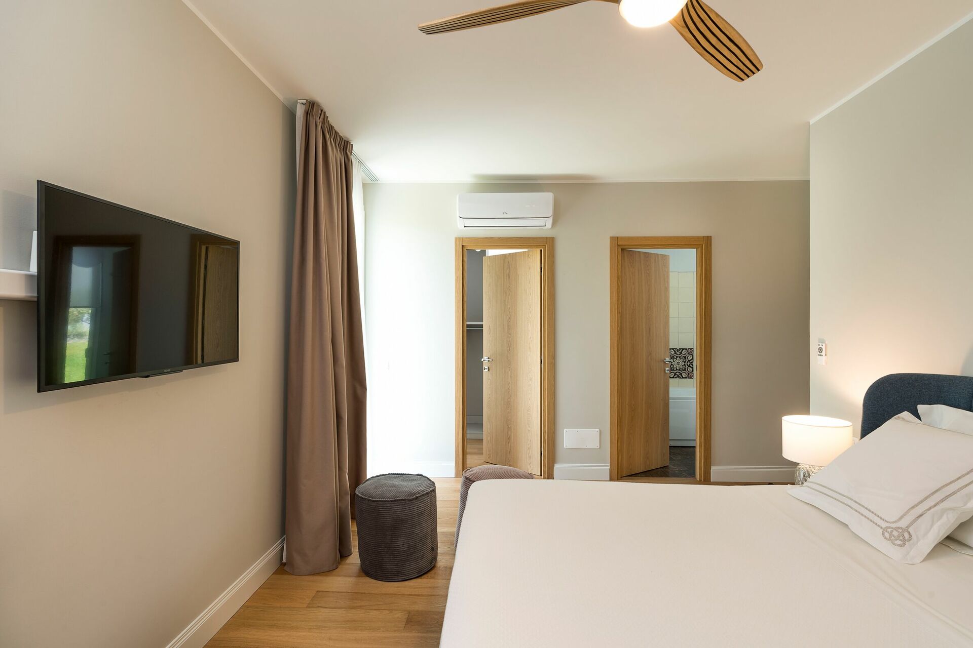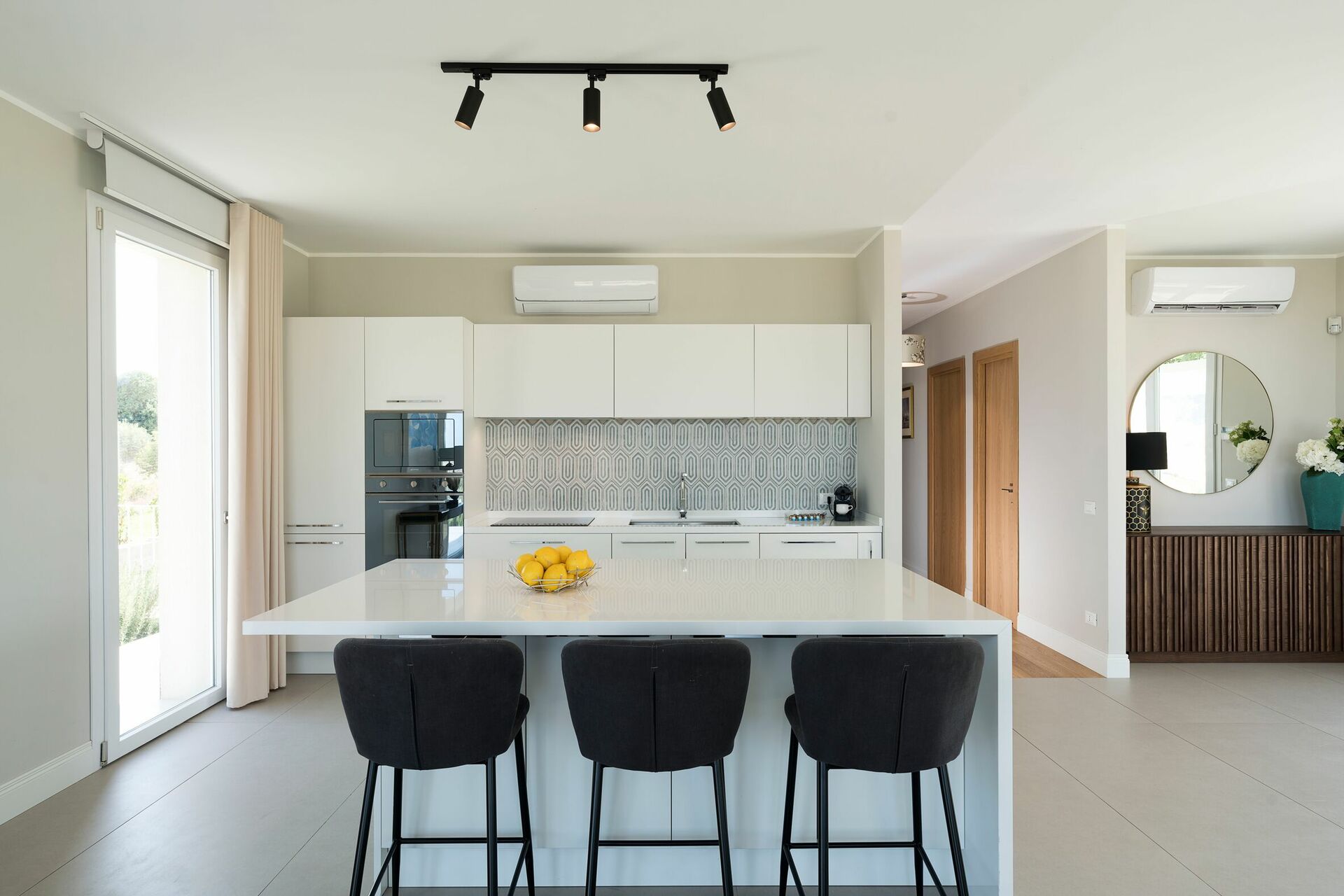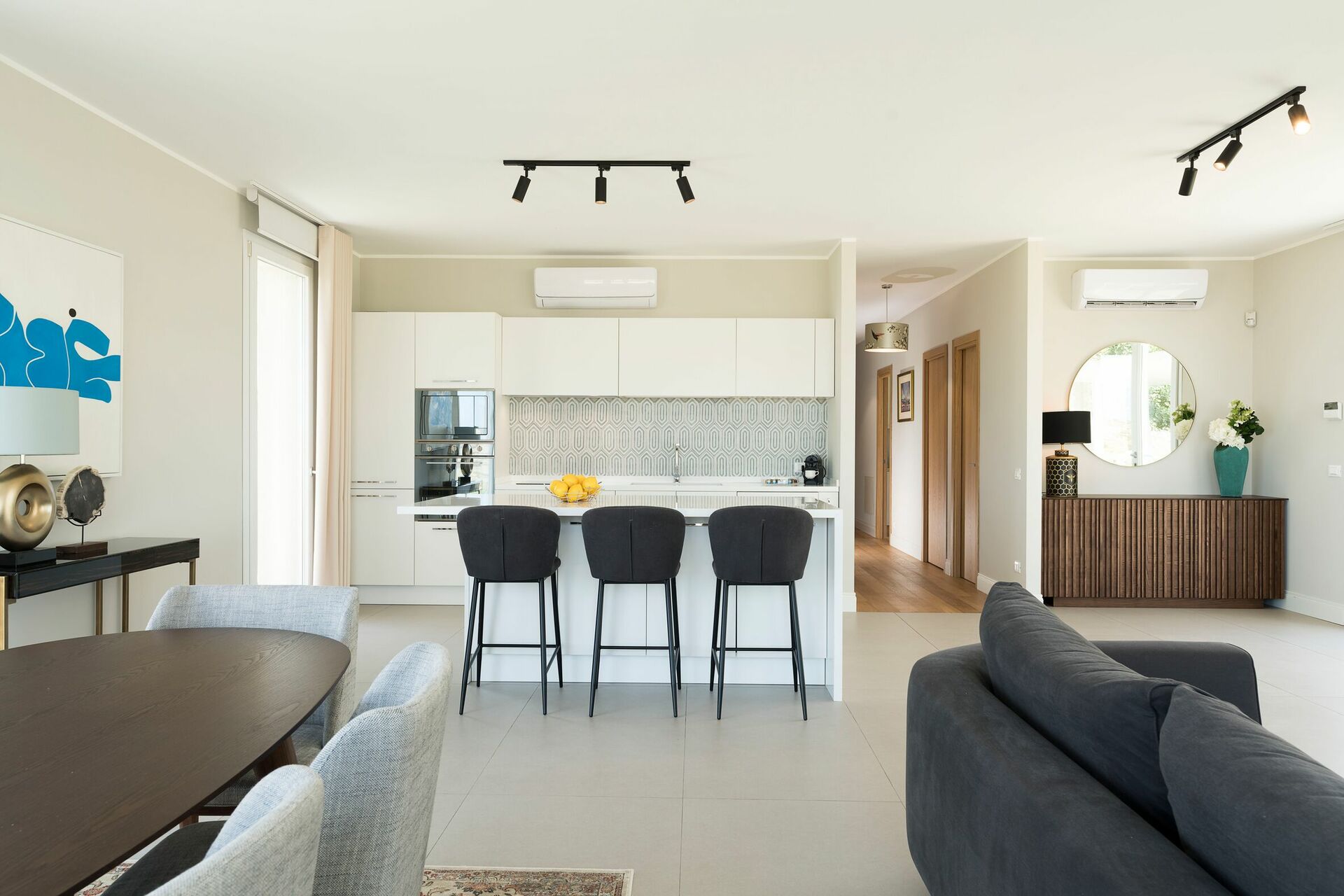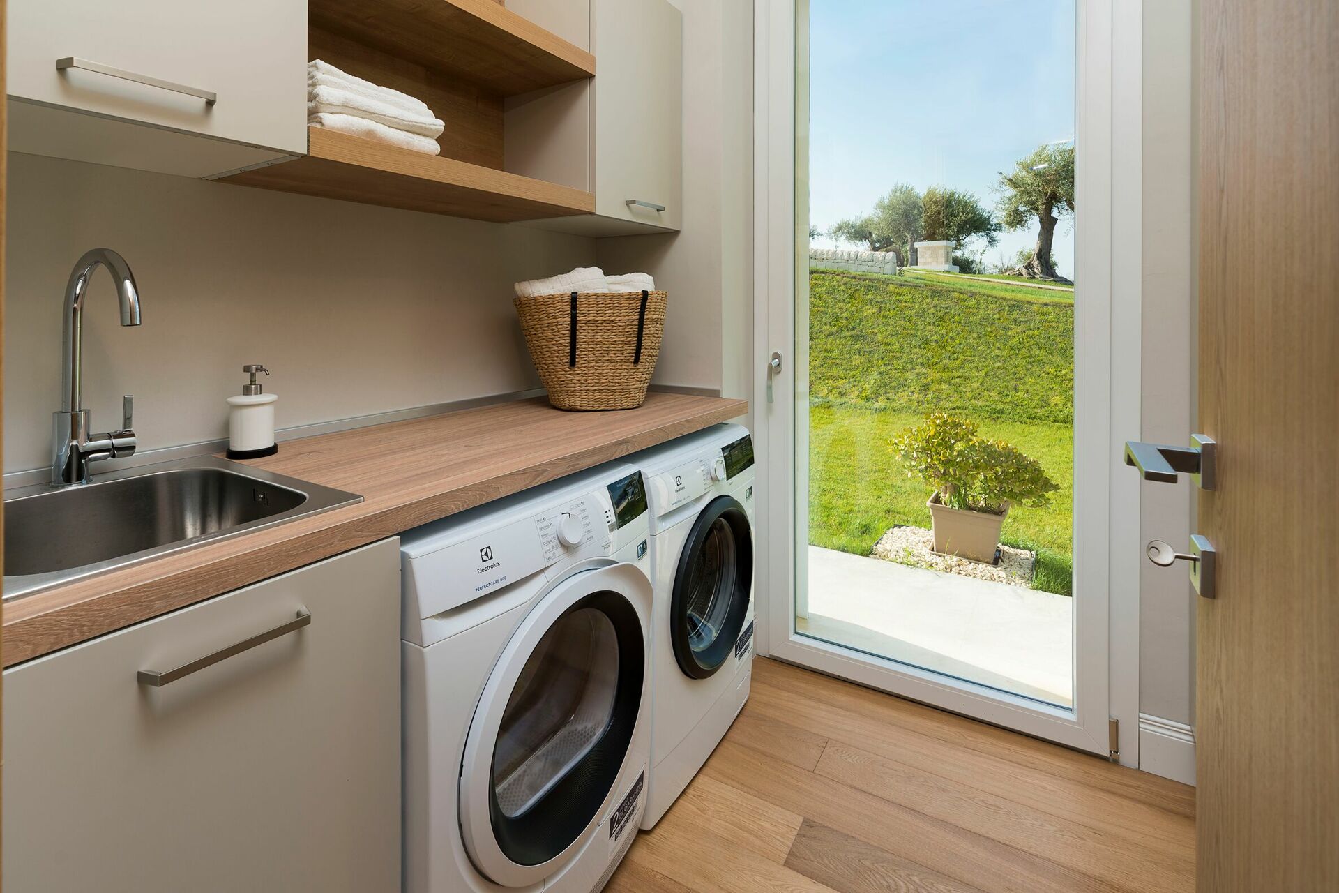 Ground floor: living room with dining area and kitchen (oven, freezer, microwave, cofee machines, dishwasher), laundry room, 1 bathroom (sink and toilet), 1 double bedroom (king size bed) with private bathroom with bathtub, 2 double bedrooms each with private bathroom with shower.