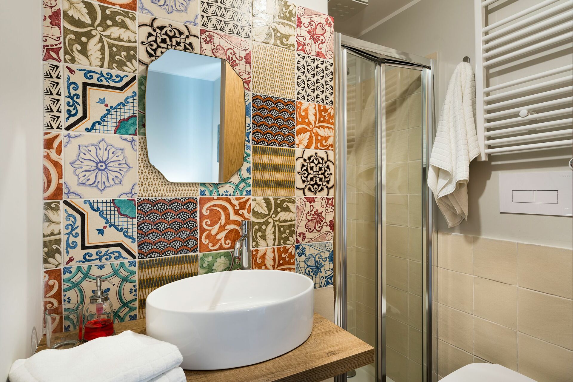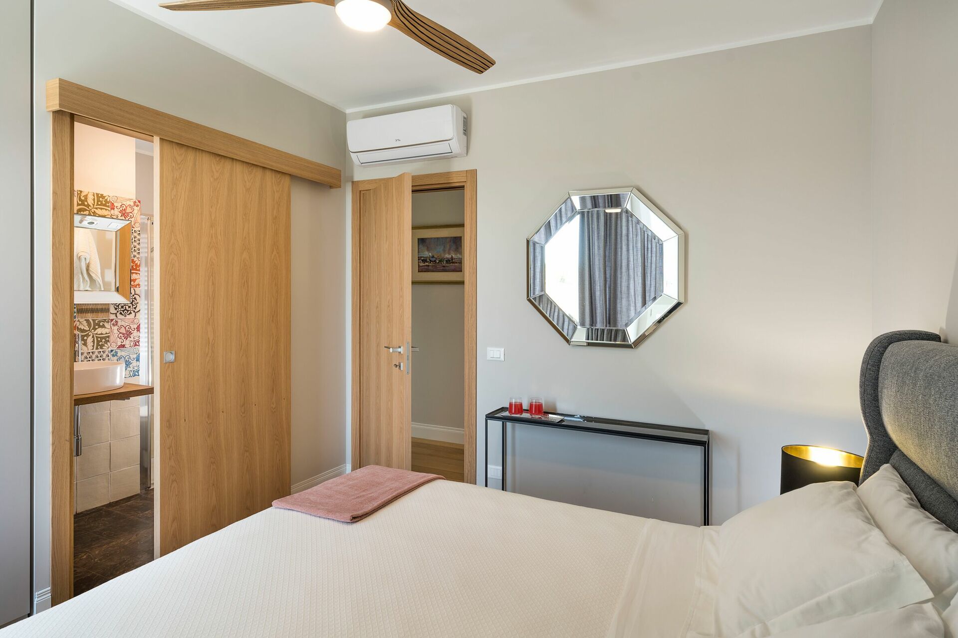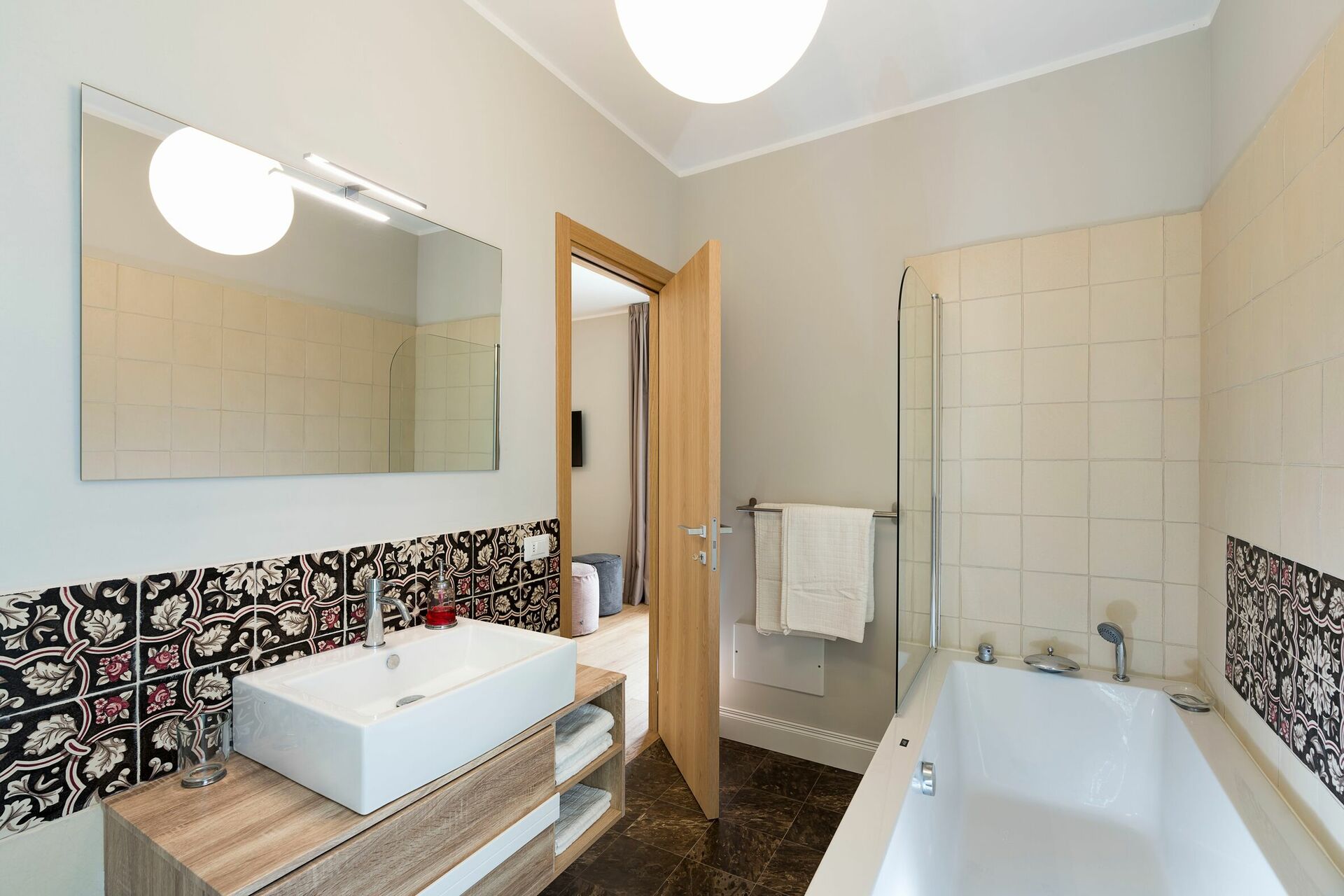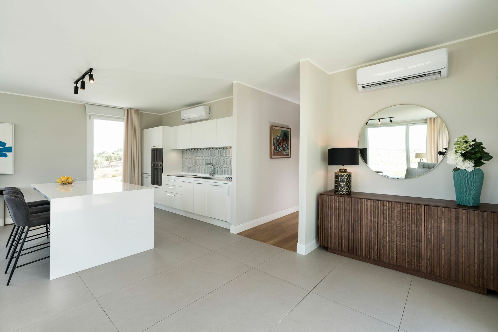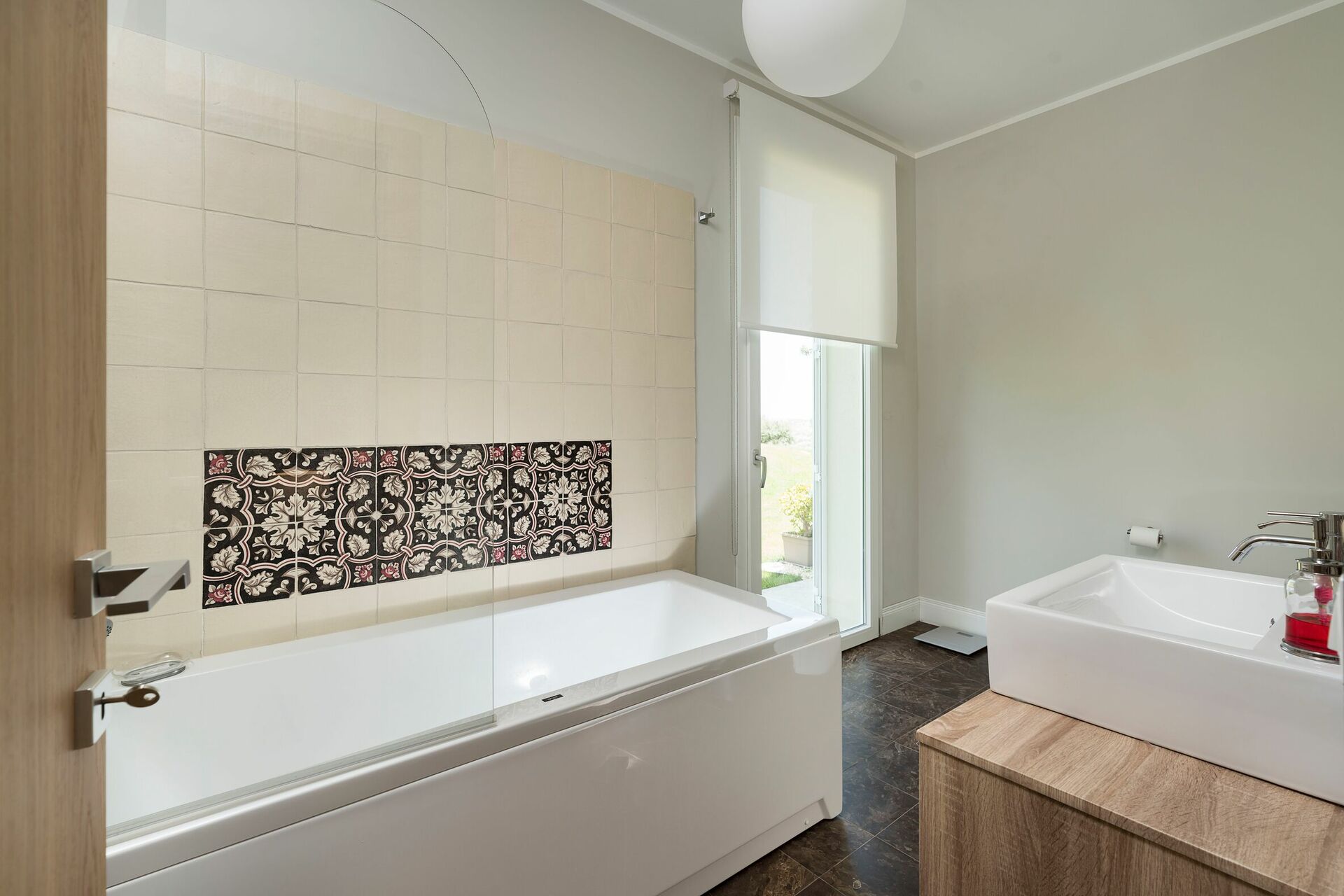 Ground floor: living room with dining area and kitchen (oven, freezer, microwave, cofee machines, dishwasher), laundry room, 1 bathroom (sink and toilet), 1 double bedroom (king size bed) with private bathroom with bathtub, 2 double bedrooms each with private bathroom with shower.