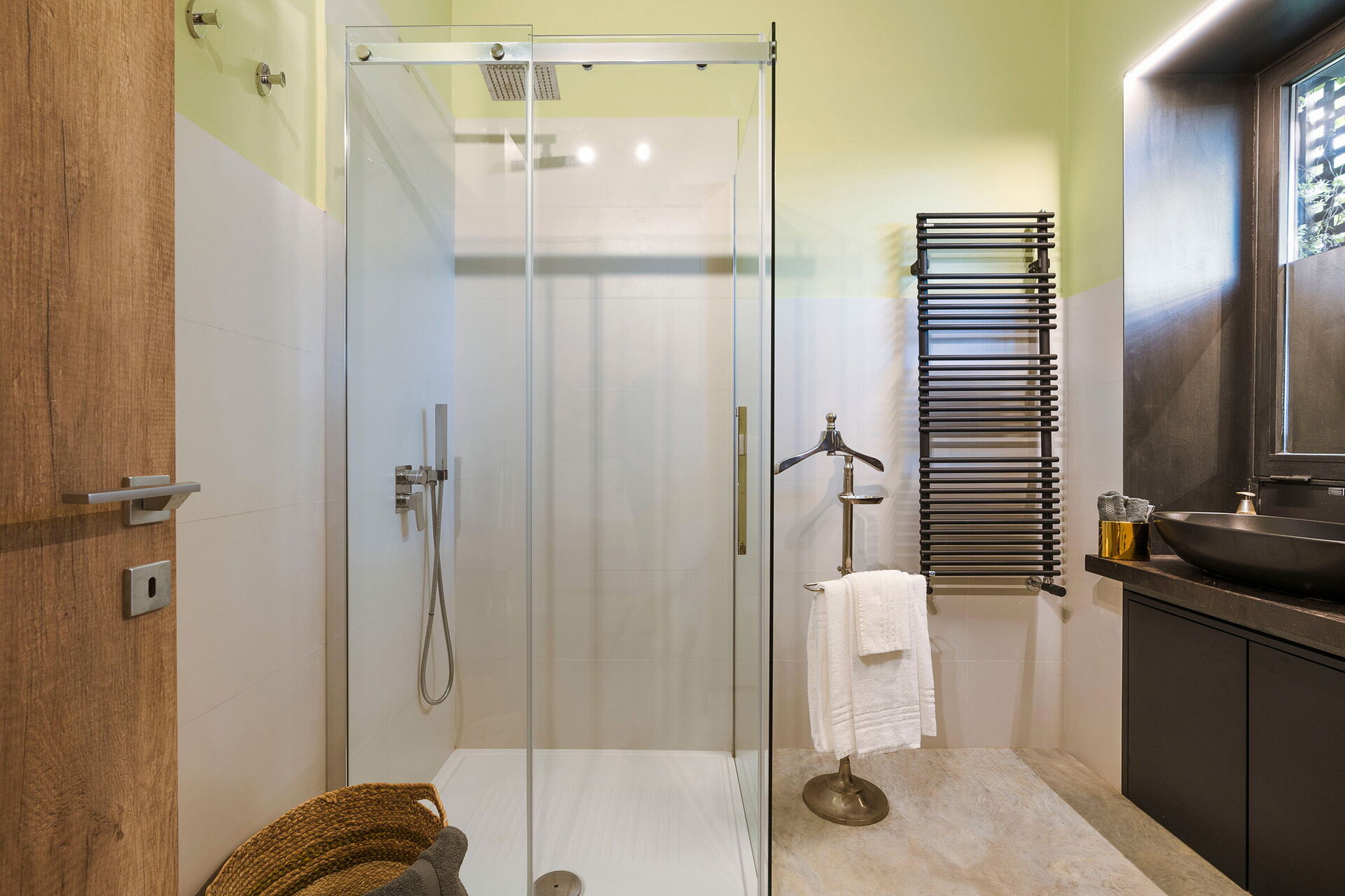 Ground floor: living room (TV), kitchen (cooktop, oven, freezer, refrigerator, dishwasher, espresso coffee maker, American coffee maker, microwave, toaster) with access to the veranda with a lovely dining area, laundry room, wc, 3 double bedrooms each with a private bathroom with shower, 1 bedroom with small double bed, bathroom with shower.