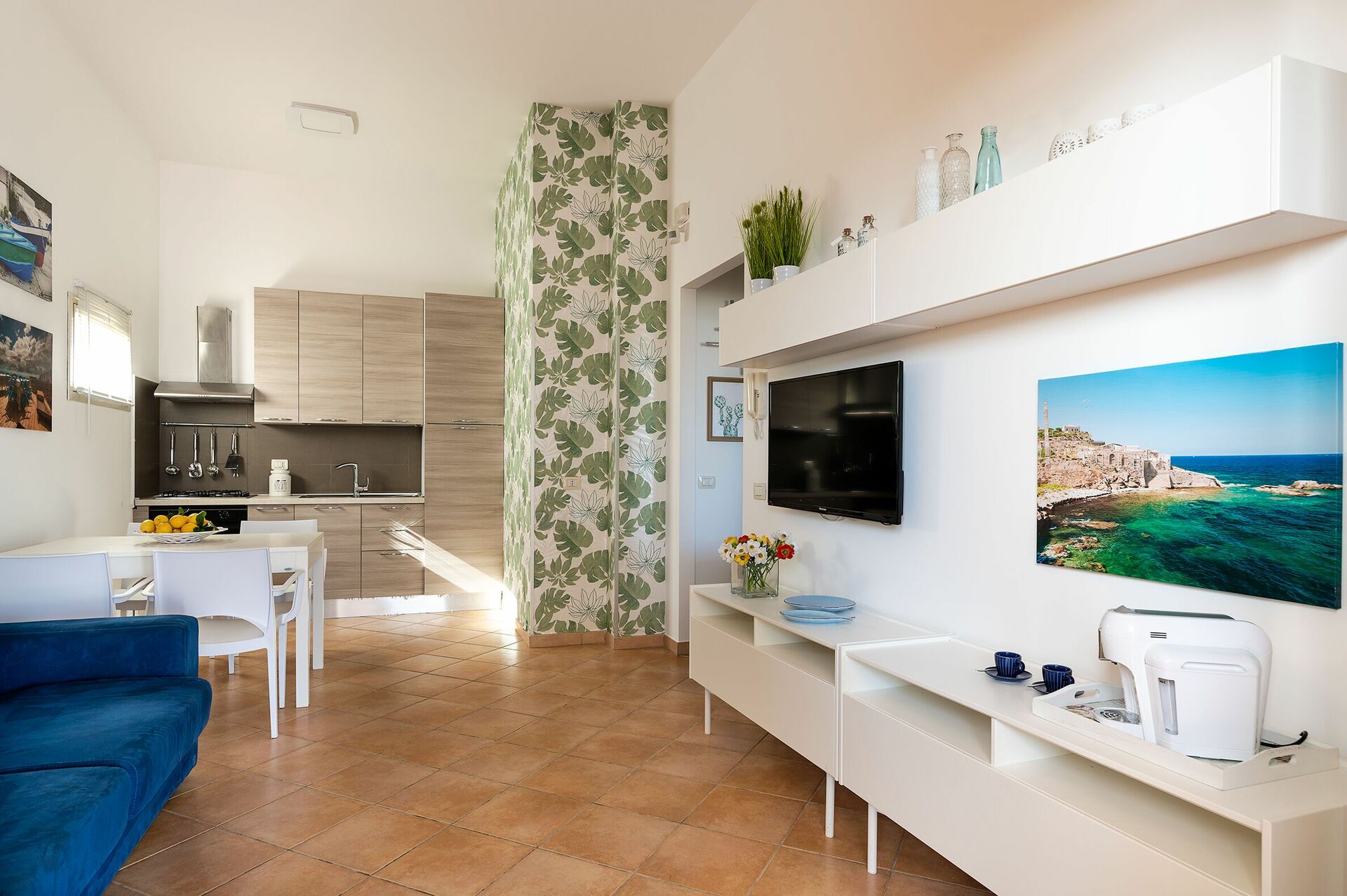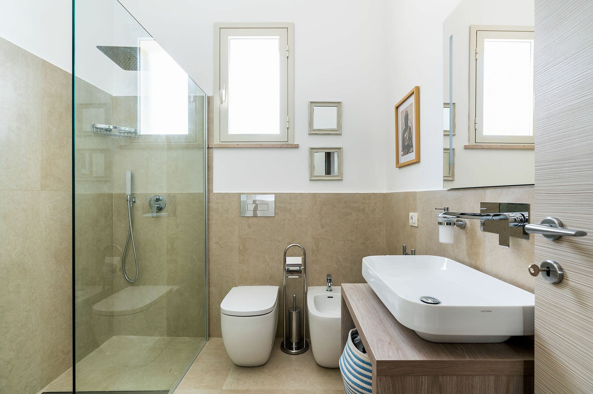Ground floor: living room-kitchen with single sofa bed; 1 double bedroom with private bathroom with shower; 1 double bedroom; 1 bathroom with shower.