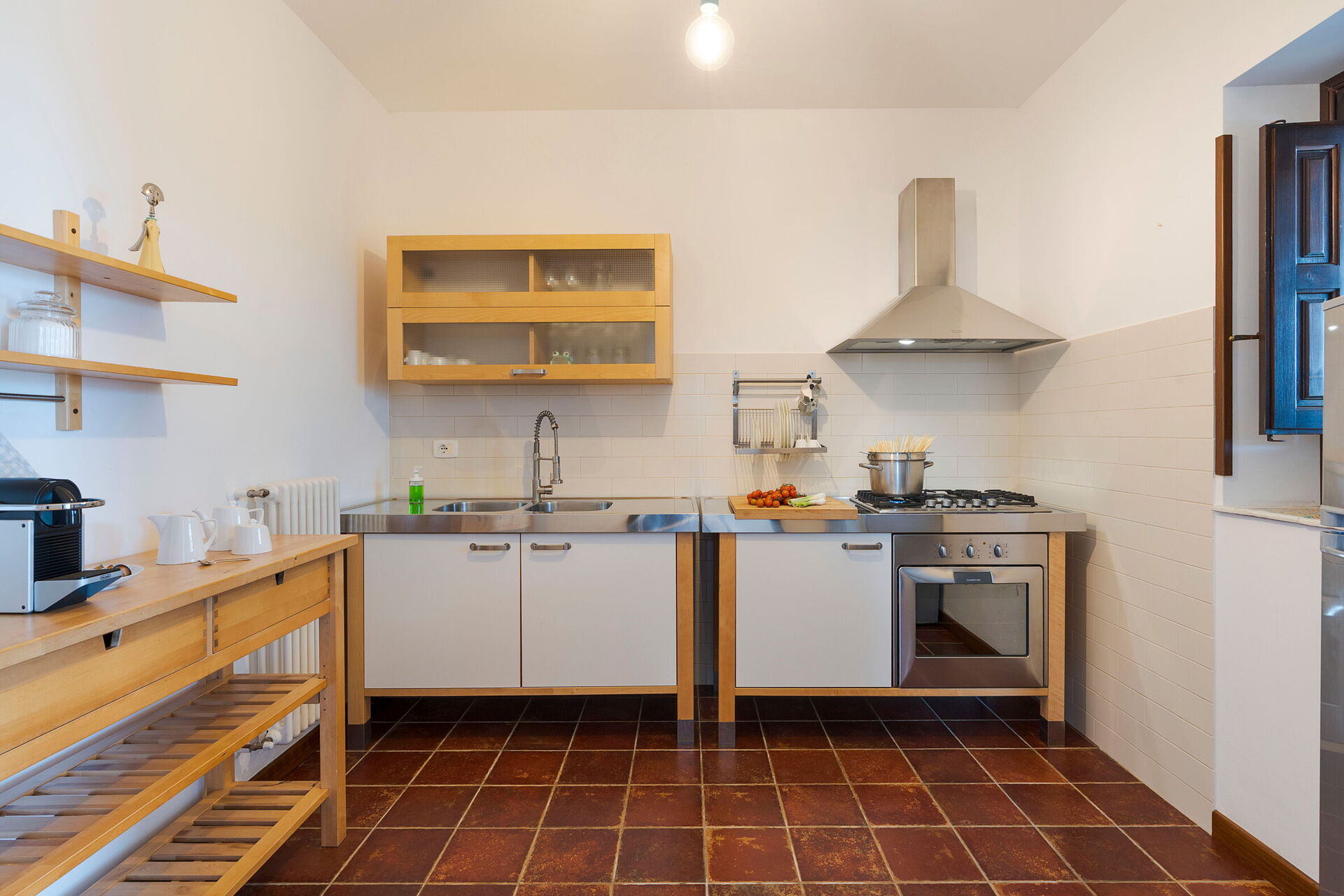Ground floor: small living room with access to the pergola-covered veranda furnished for outdoor dining, kitchen (cooktop, oven, freezer, refrigerator, microwave, coffee maker, toaster), double bedroom (bed dimensions: 160 x 200 cm) with a private bathroom with shower.