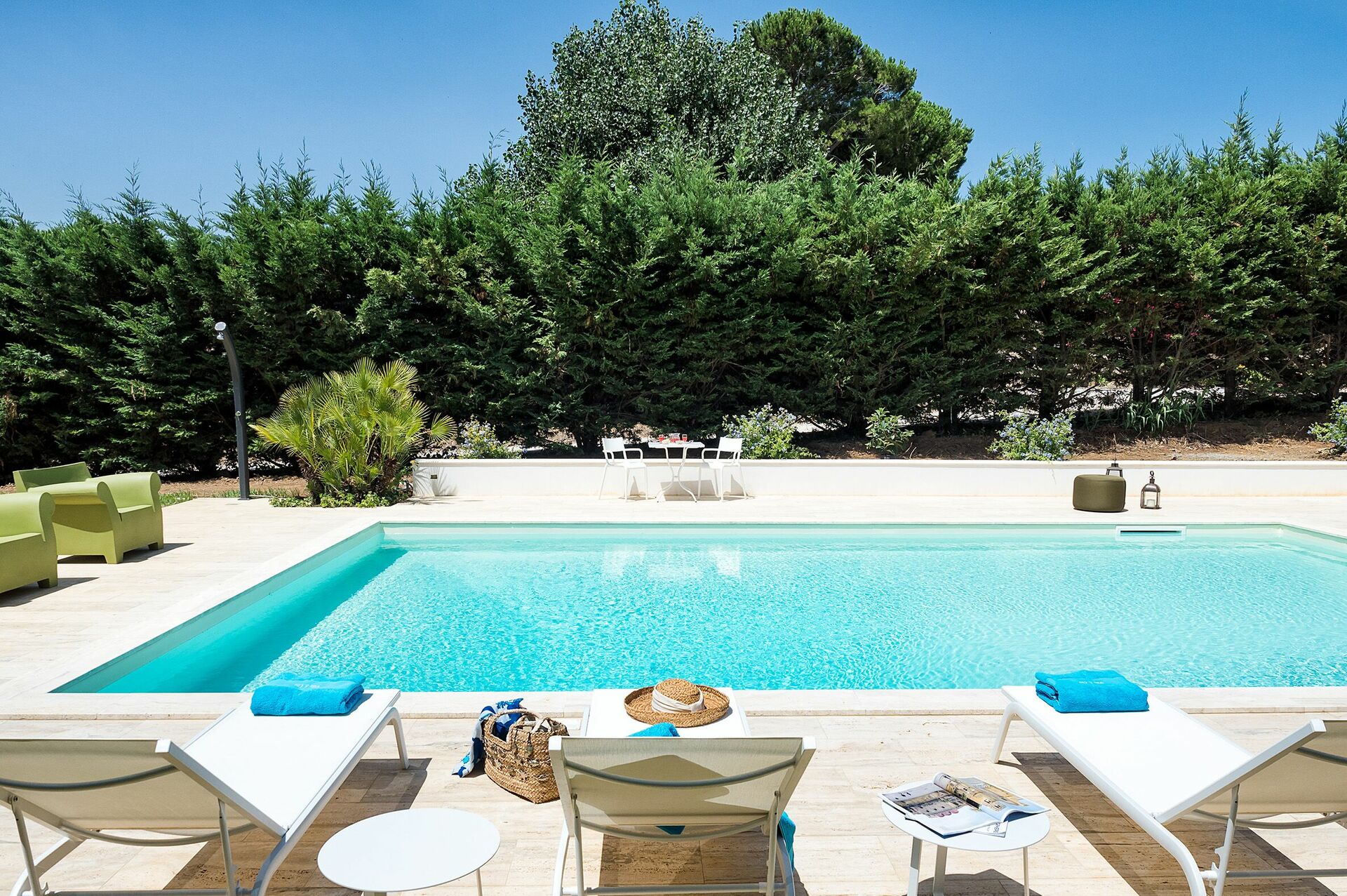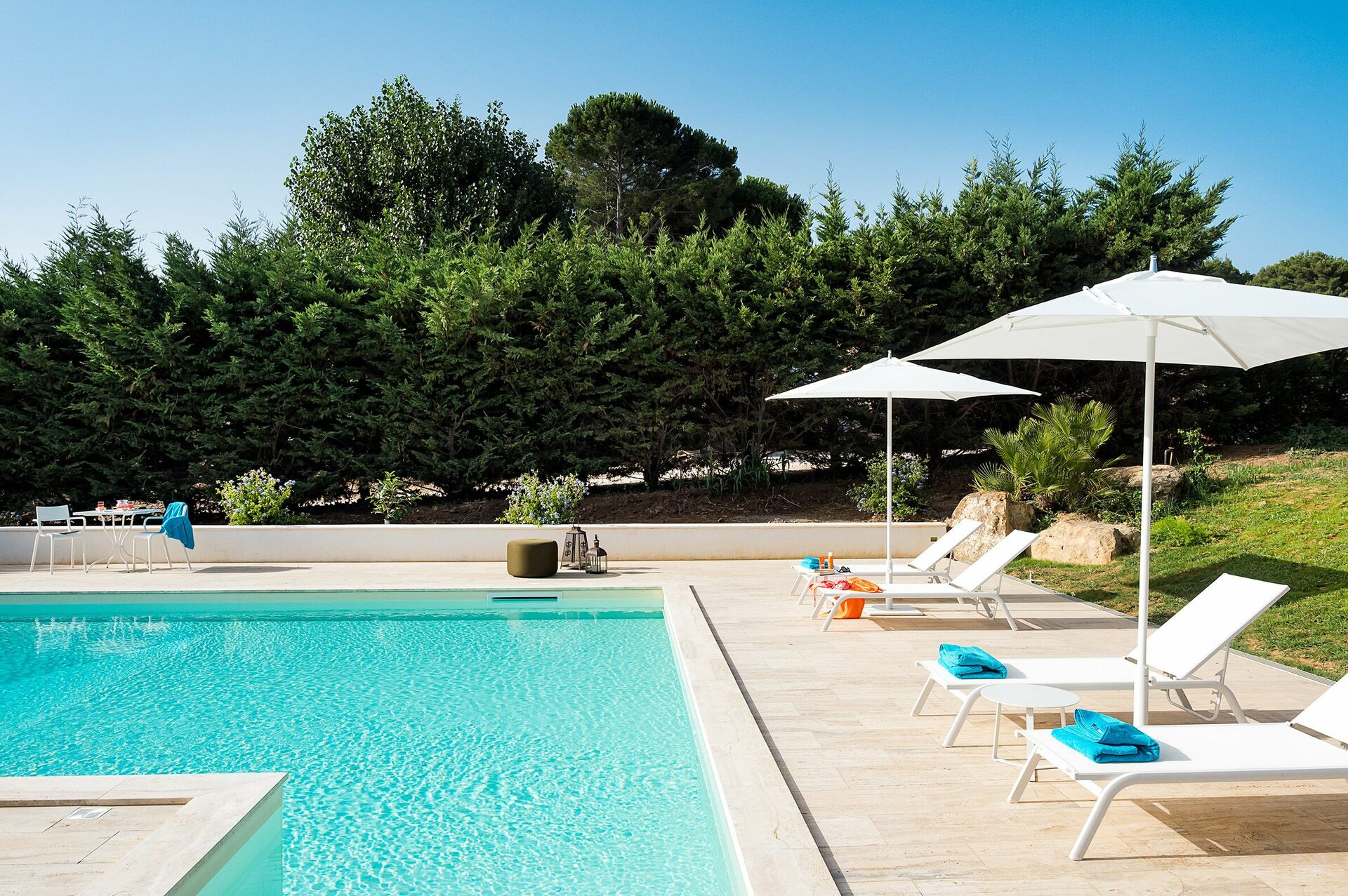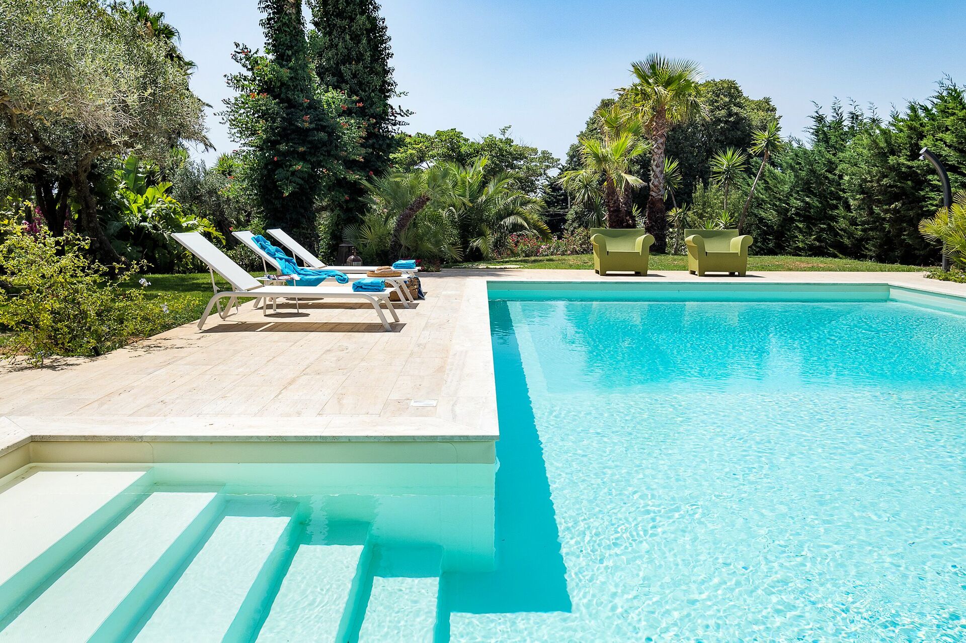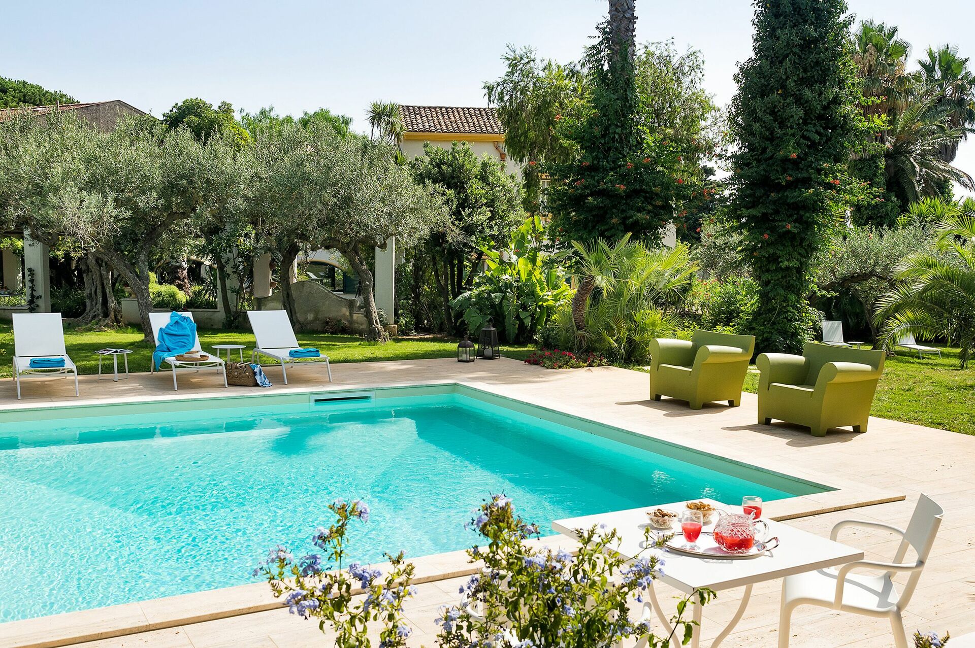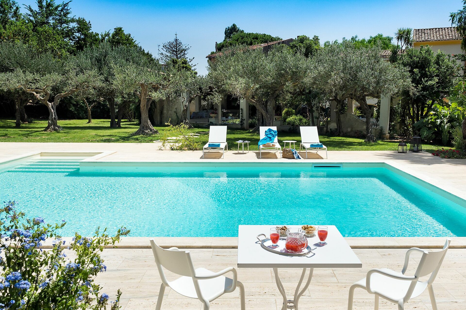 The villa rental is surrounded by a well-tended Mediterranean garden with a splendid pool and boasts spacious terraces, so ideal for dining al fresco and enjoying a relaxing time in the open air.