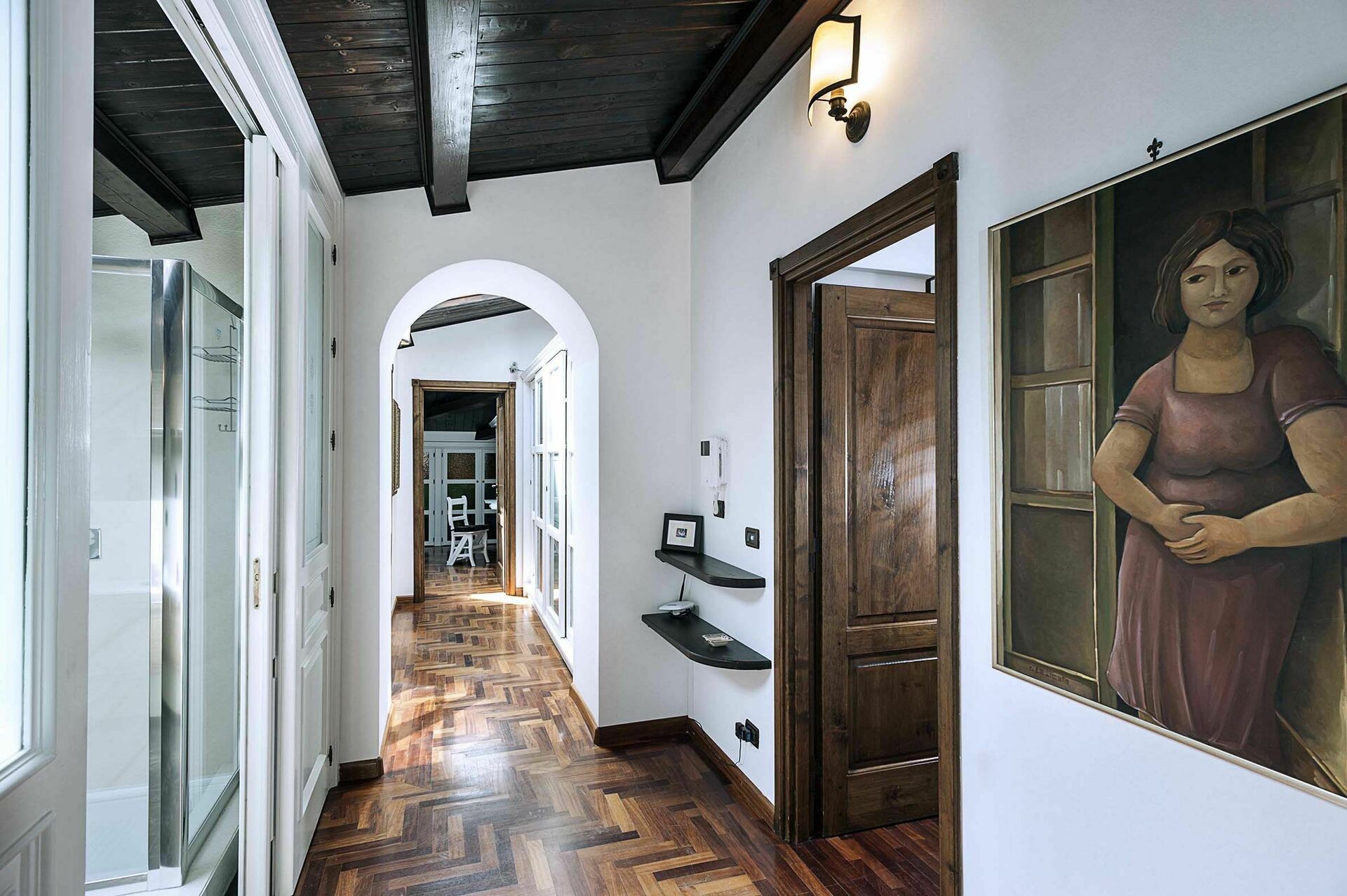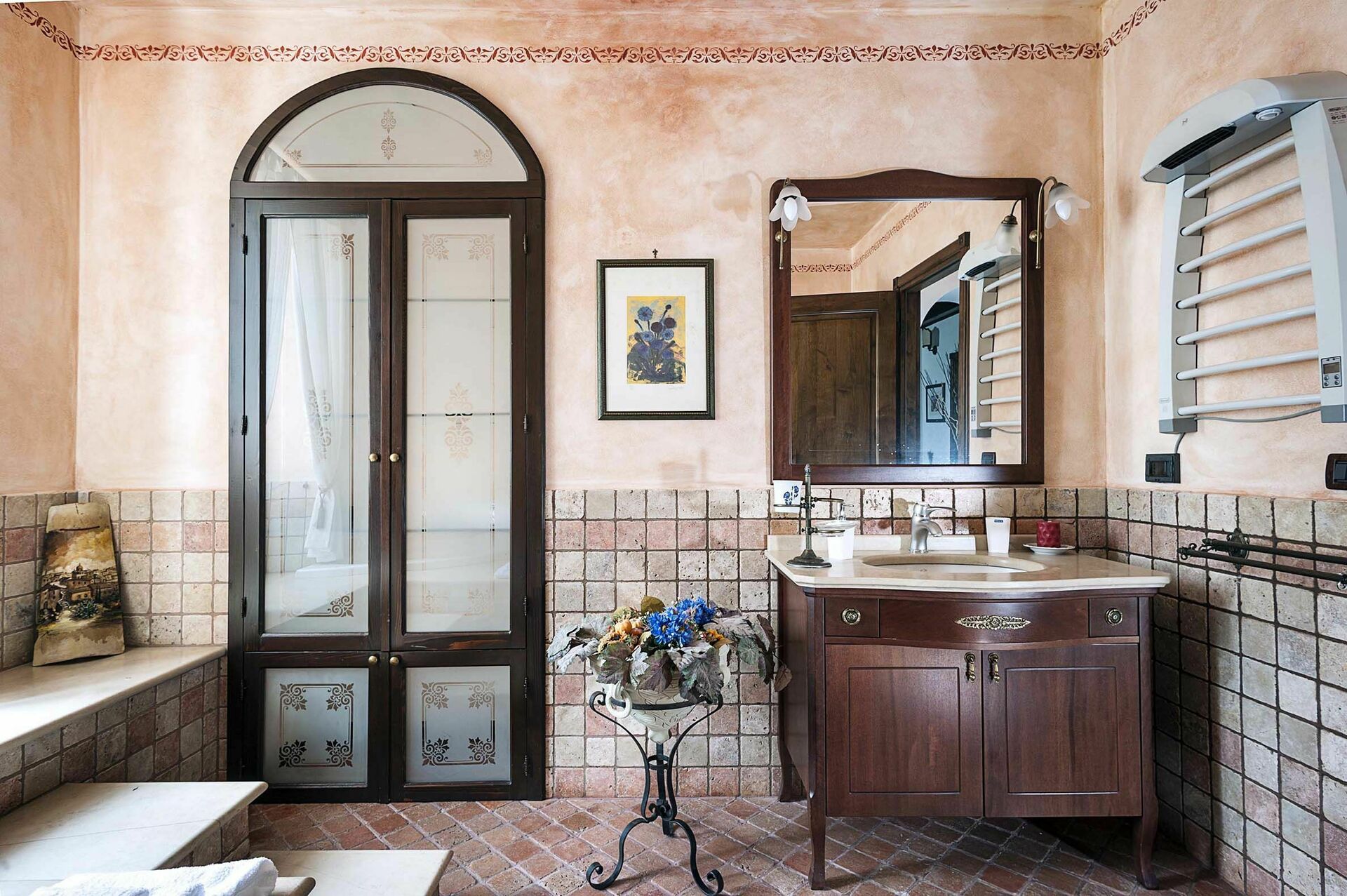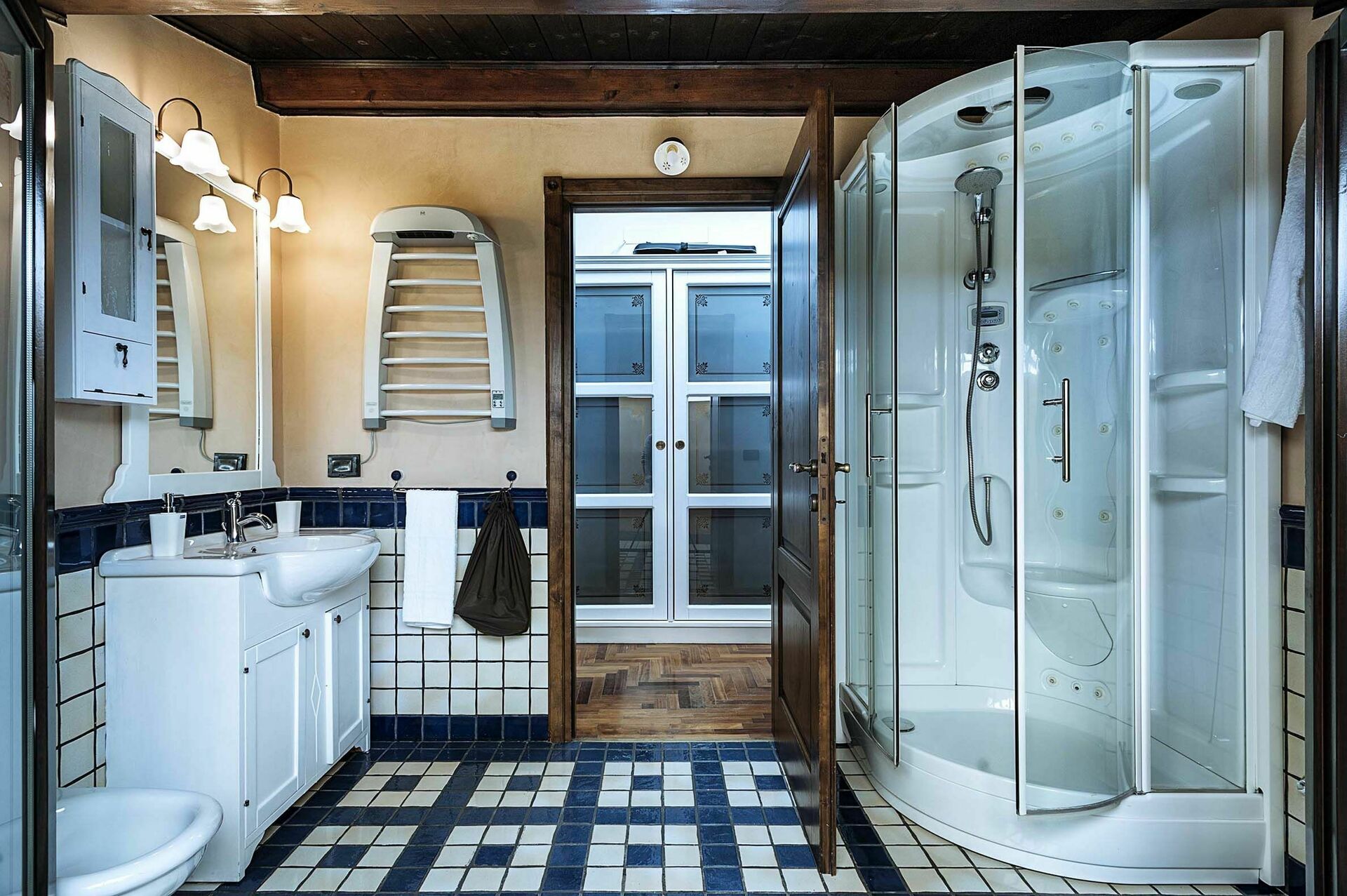 In a separate building, accessible from the outside, ground floor: large room with kitchen and wood oven, laundry room, dressing room with bathroom with shower.