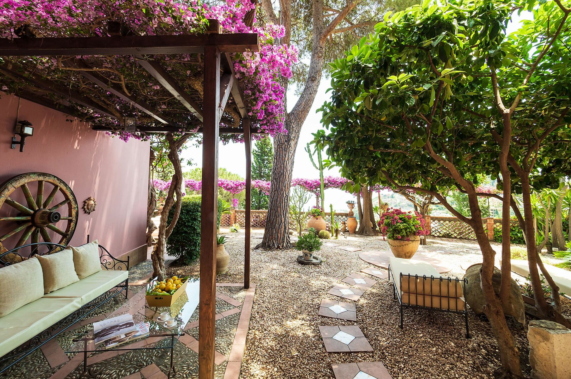 Overlooking the garden and the pool, Villa La Boheme offers several equipped areas which are ideal for outdoor living. Elegantly furnished with great attention to detail, this villa features a beautiful Sicilian style decor with ancient ceramics and antique furniture pieces.