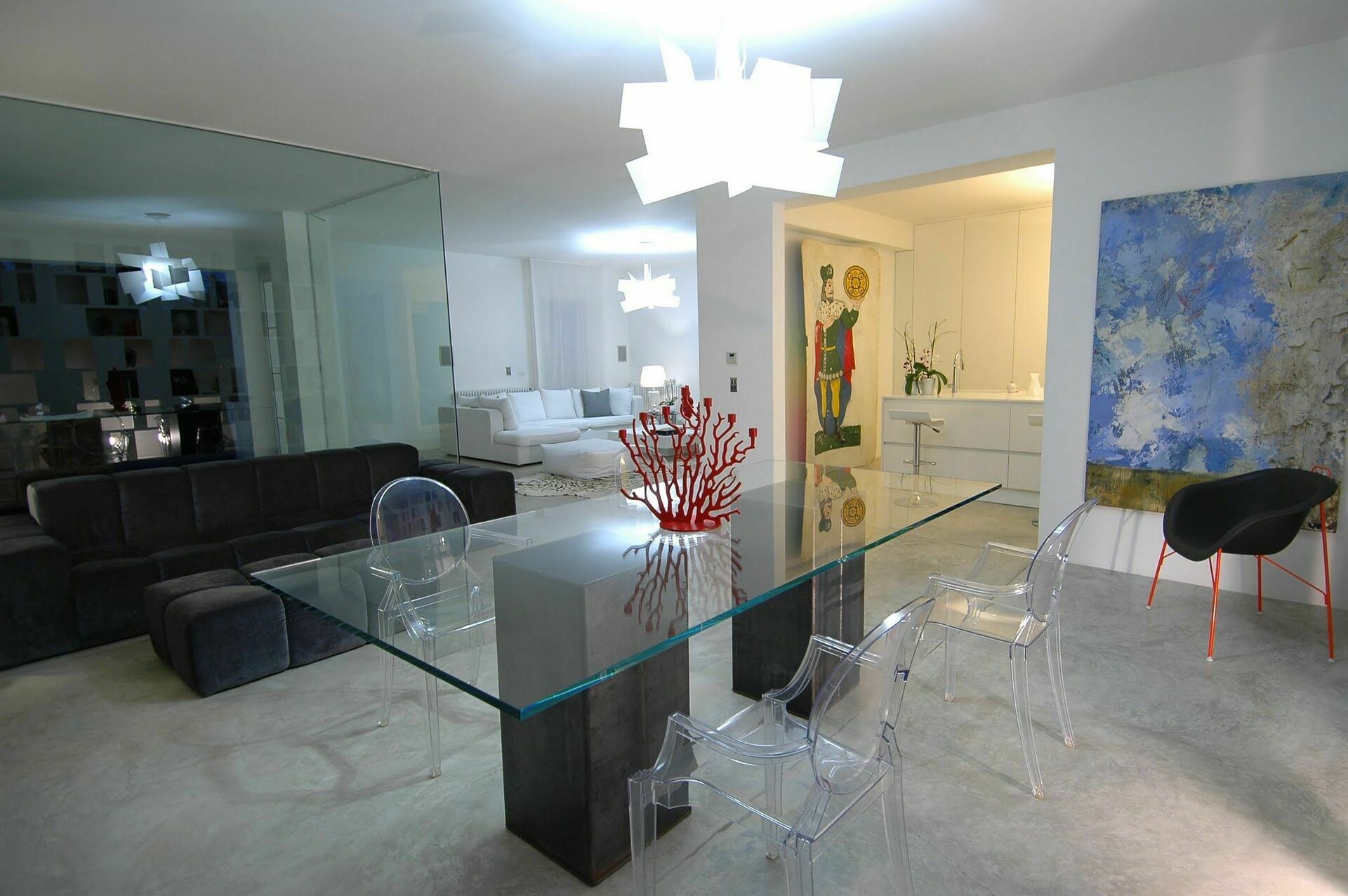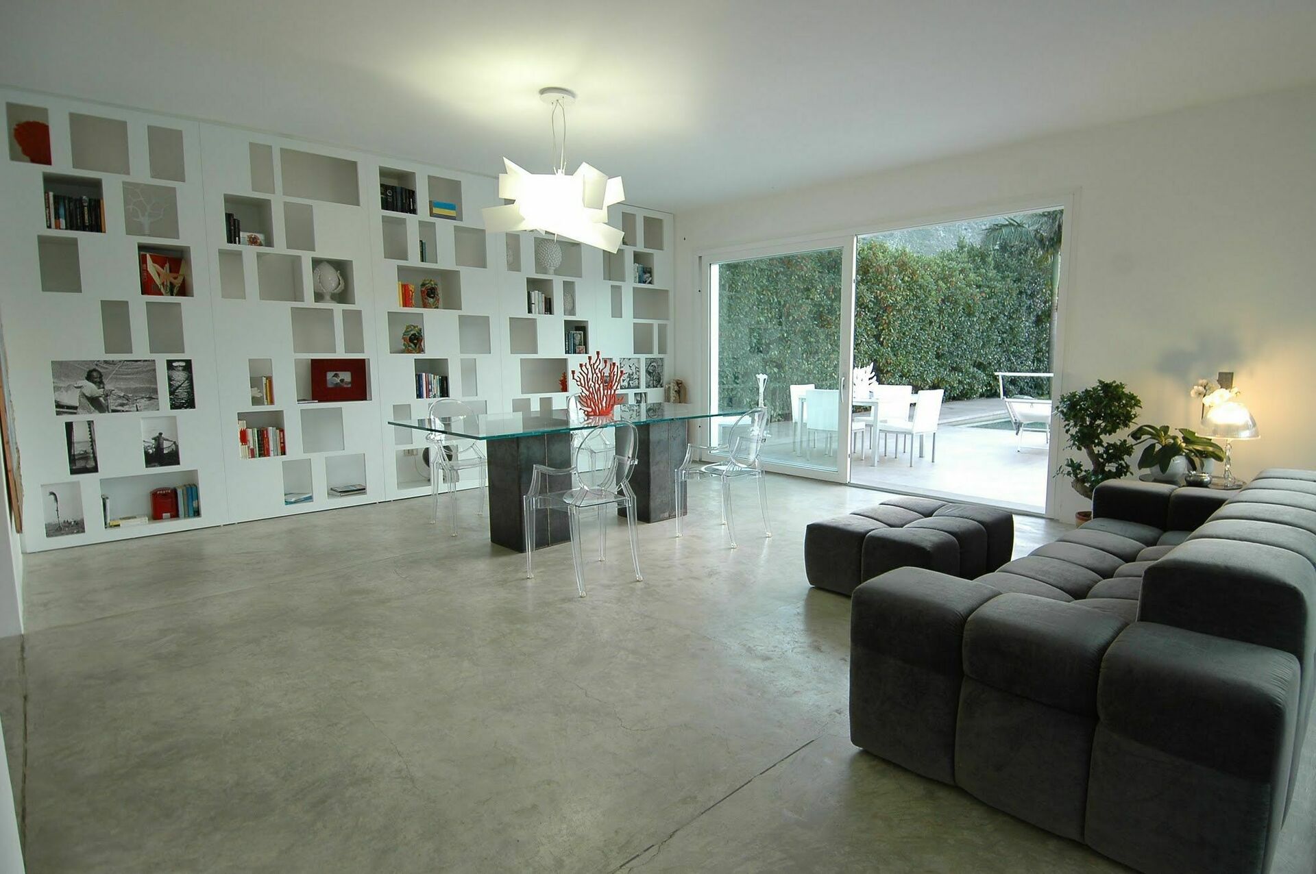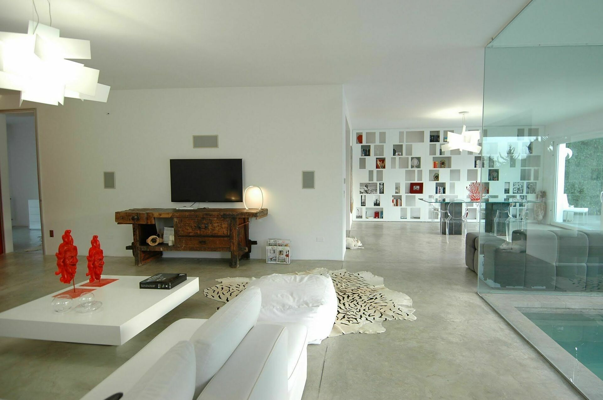 The large living area creats a fluid open-plan space, emphasized by the natural concrete floor and the large windows that redefine the interior space so that it becomes one with the outside. It allows you to enjoy the pool view and it seems as if it extends into the living area.