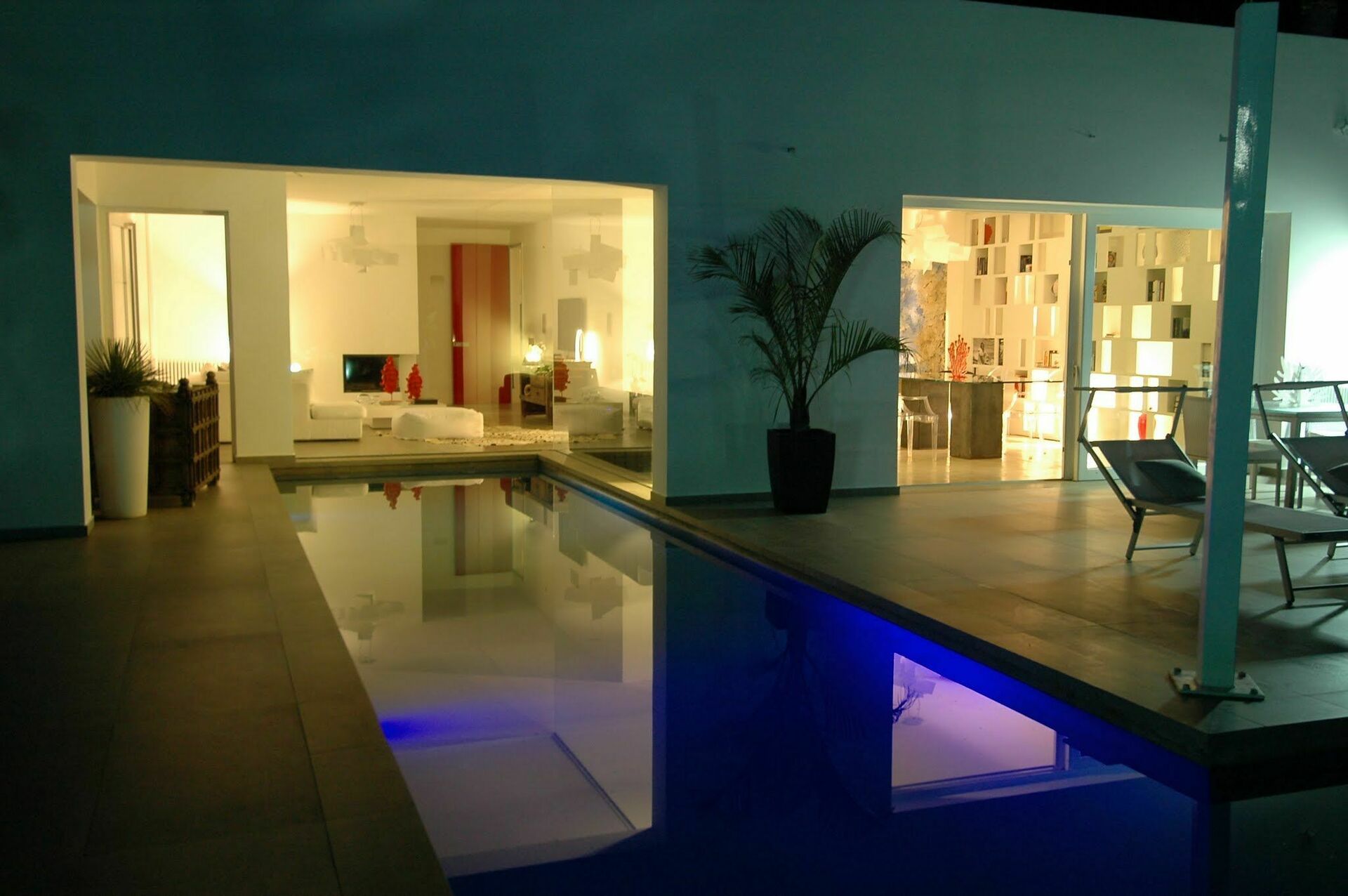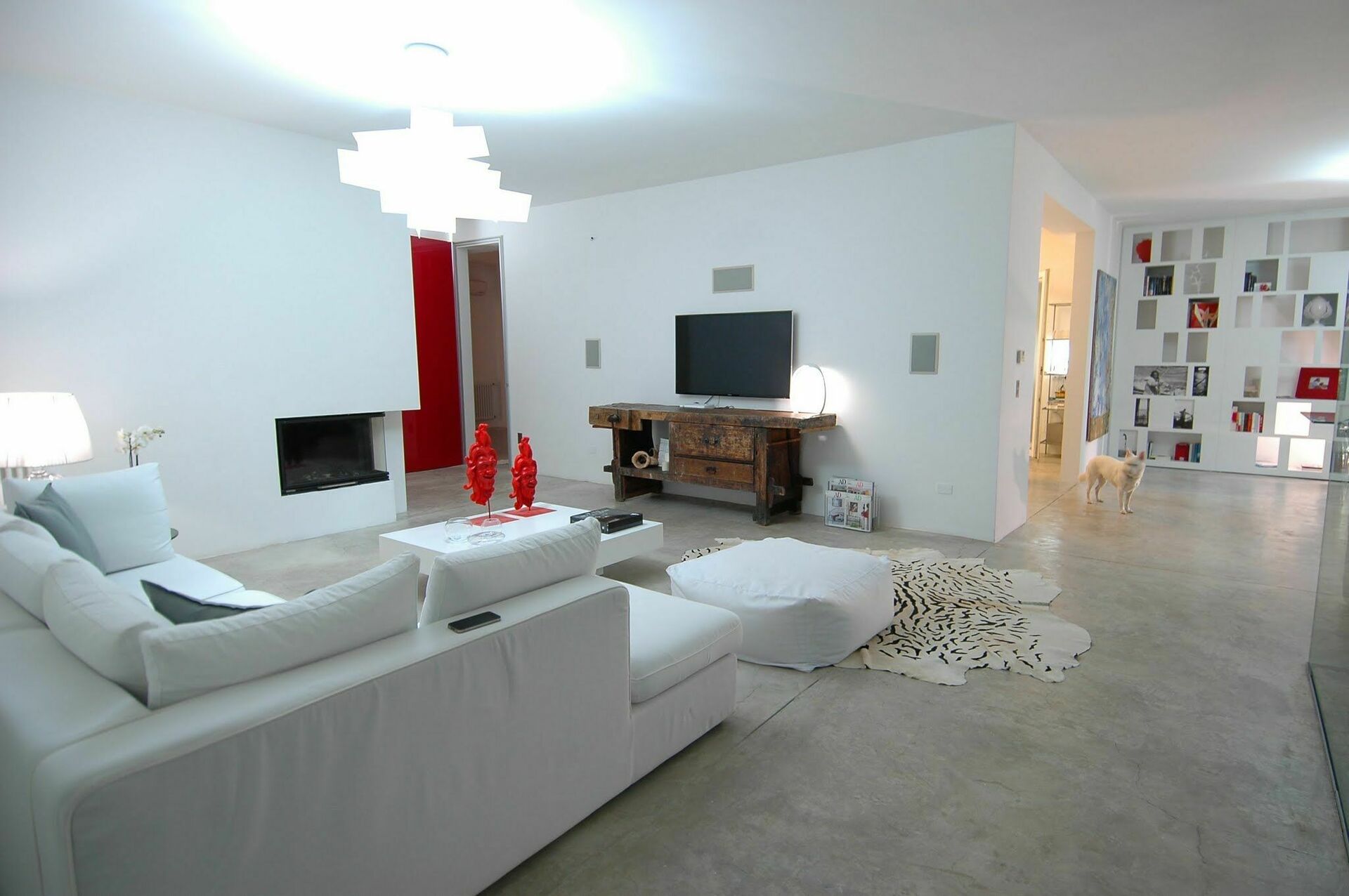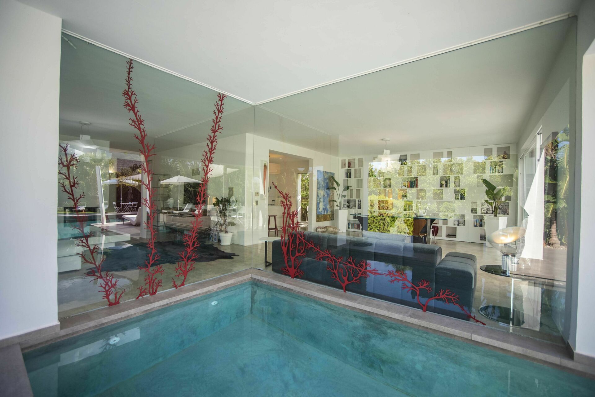 The large living area creats a fluid open-plan space, emphasized by the natural concrete floor and the large windows that redefine the interior space so that it becomes one with the outside. It allows you to enjoy the pool view and it seems as if it extends into the living area.