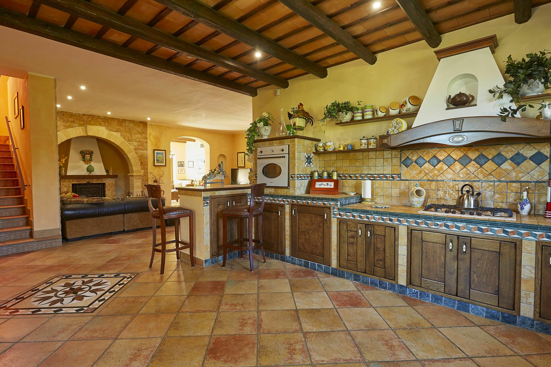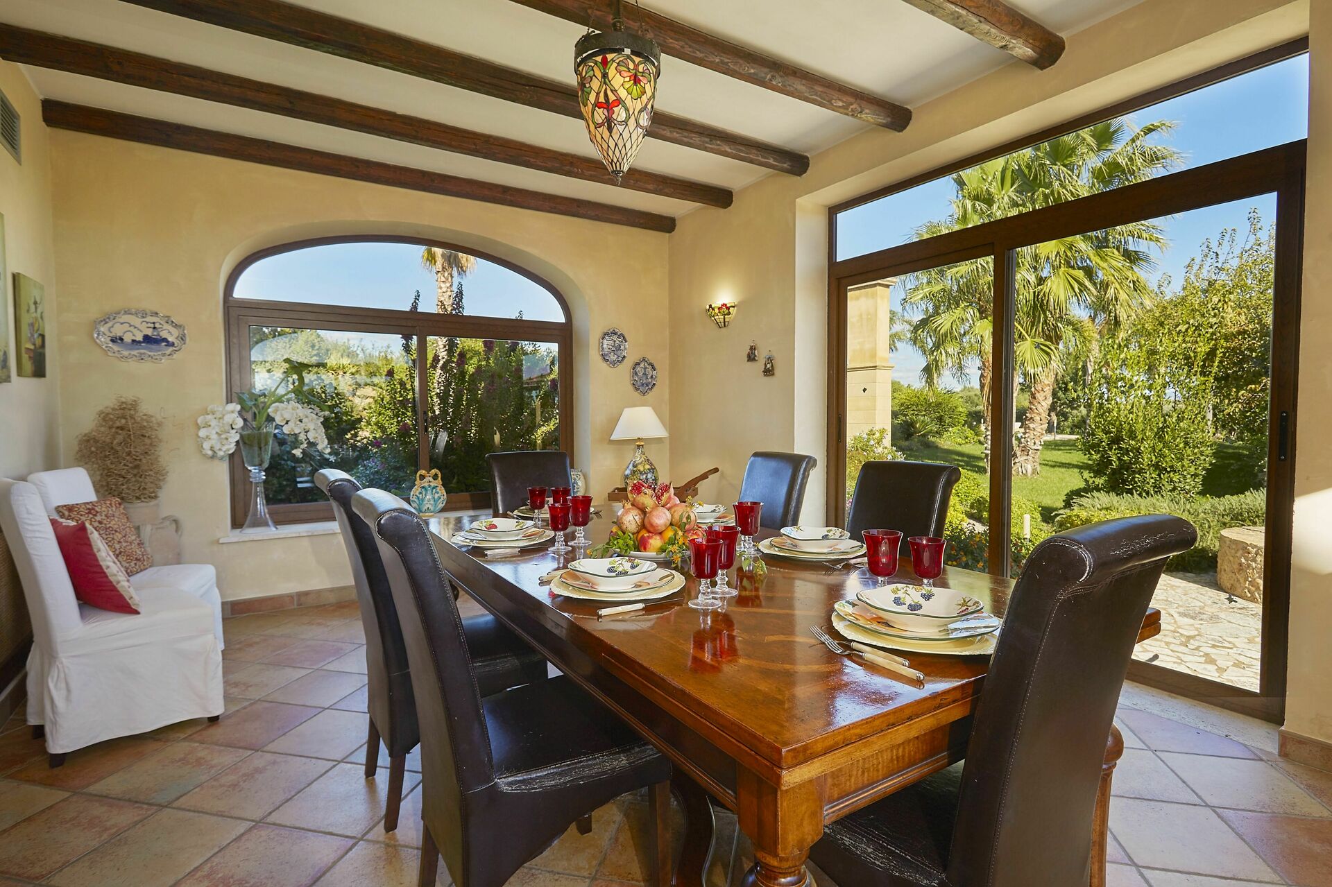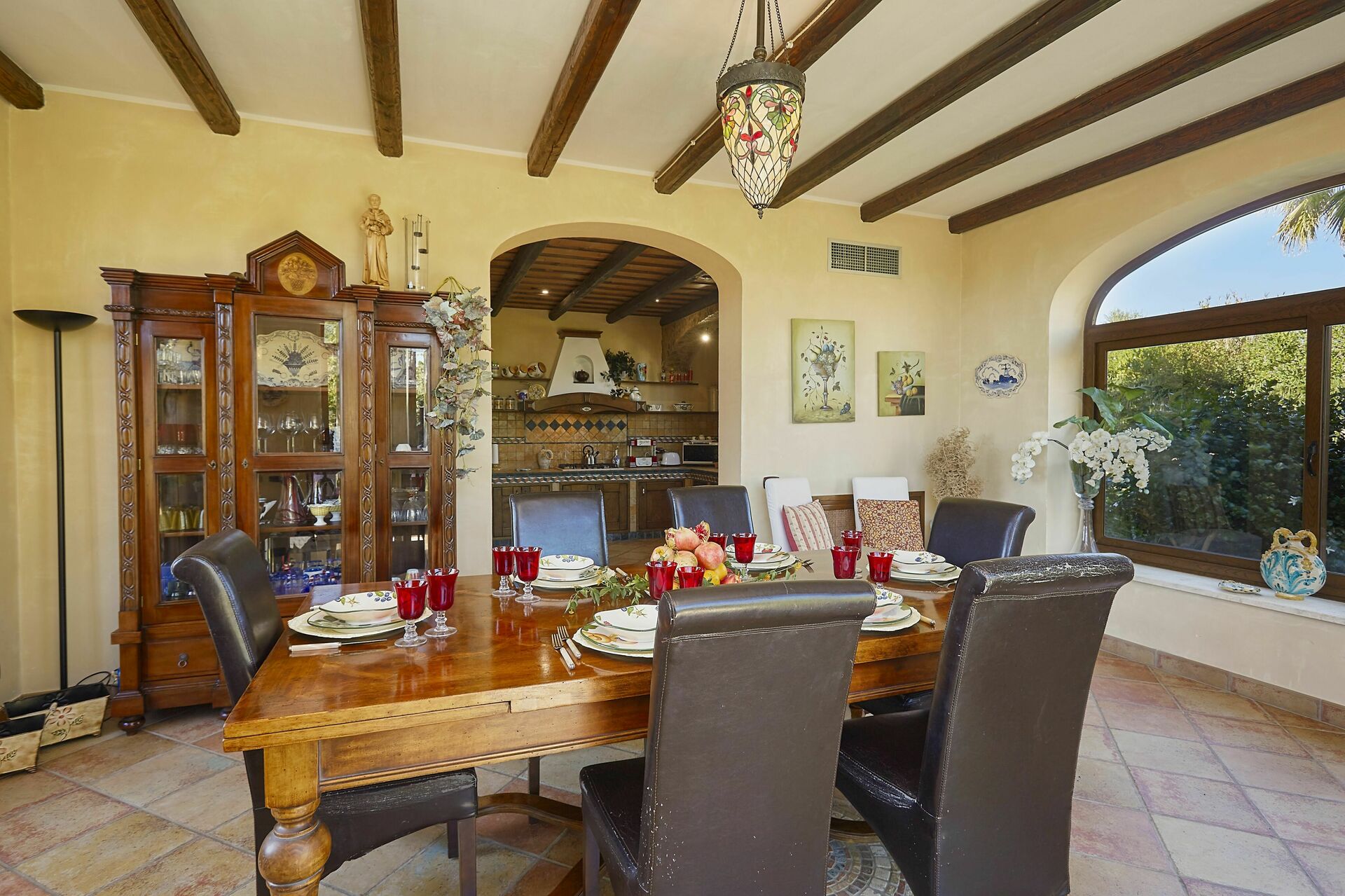 The large kitchen, appointed with attention to the smallest detail, overlooks the dining area and the large windows allow guests to enjoy the beautiful and lush vegetation that surrounds the villa and the wonderful colors of the flowers and plants that grow in the oasis. It should also be remembered that the villa is dipped in a property of 14,000 square meters of land, cultivated with olive groves, vineyards and fruit trees.
