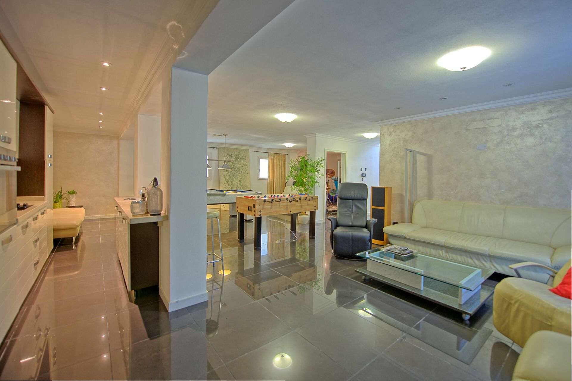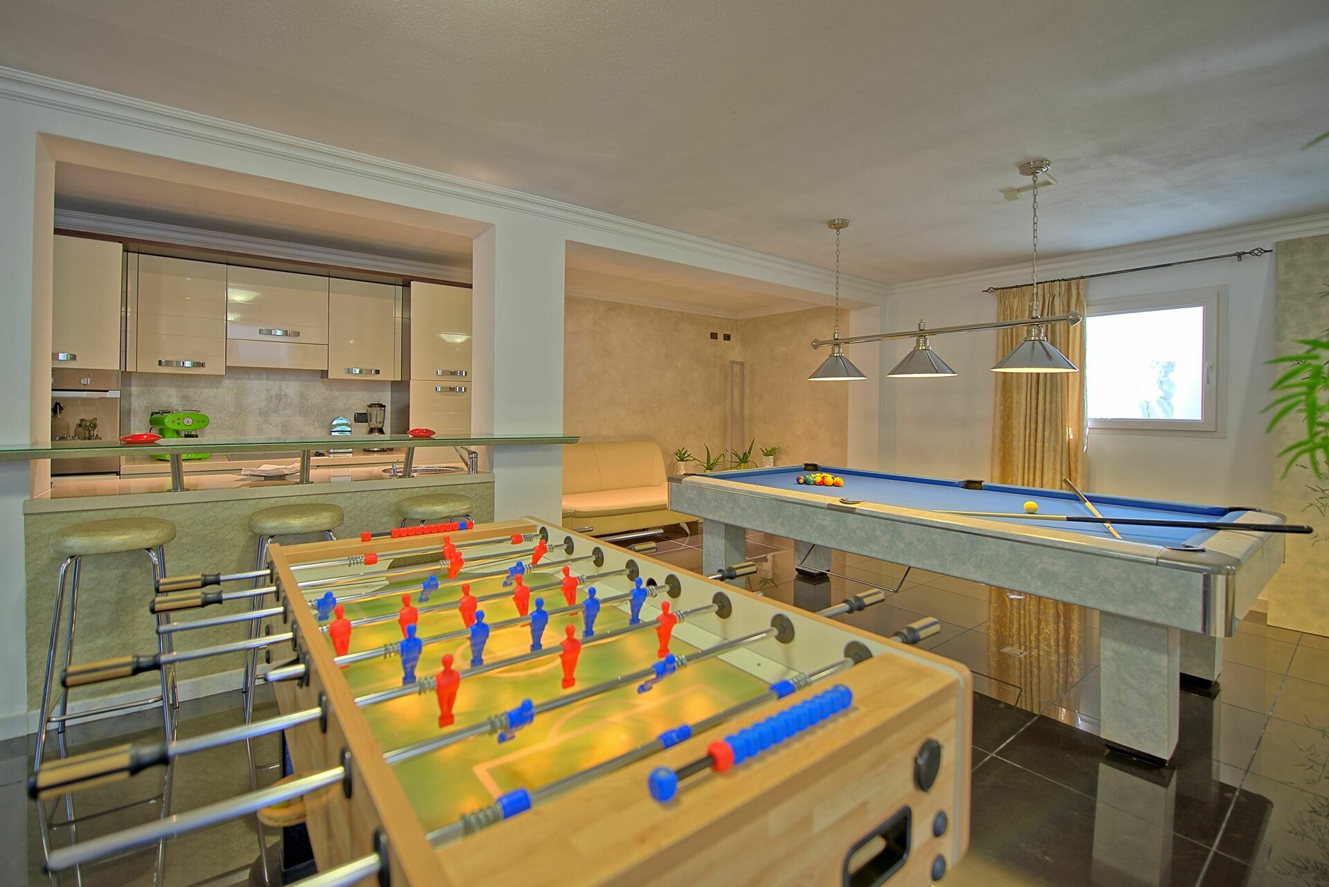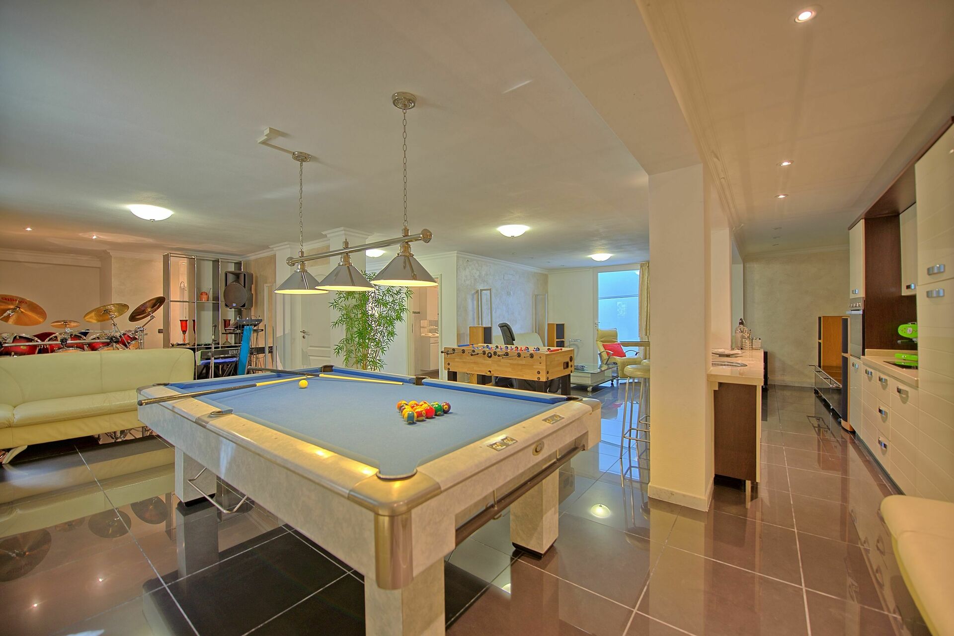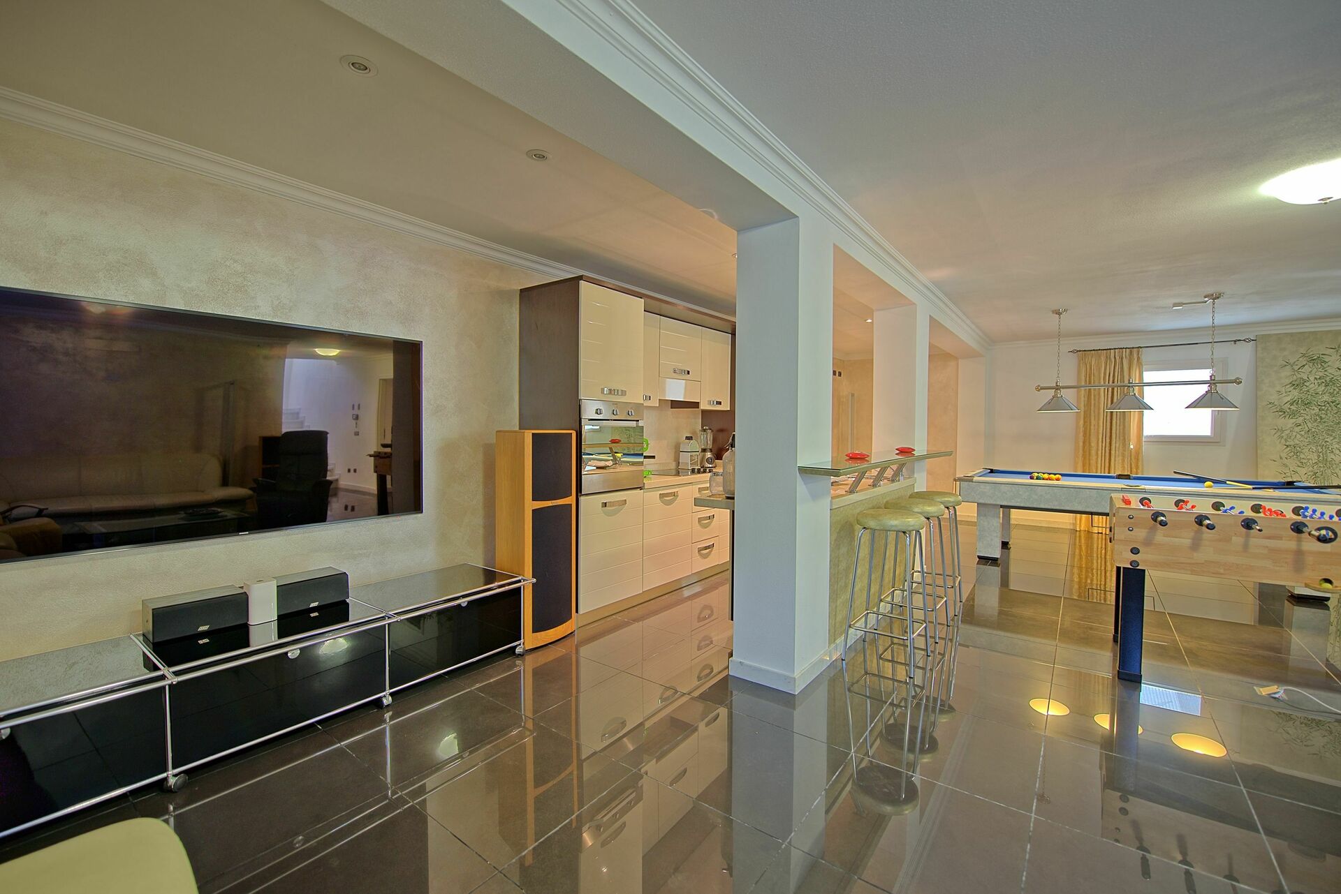 Lower floor (accessible also from outside): living area with kitchenette (oven, fridge-freezer, dishwasher), area furnished with Dolby cinema surround system, foosball table, snooker table, musical instruments (drums, keyboard, microphone), laundry room (washing machine and dryer), bathroom with shower.