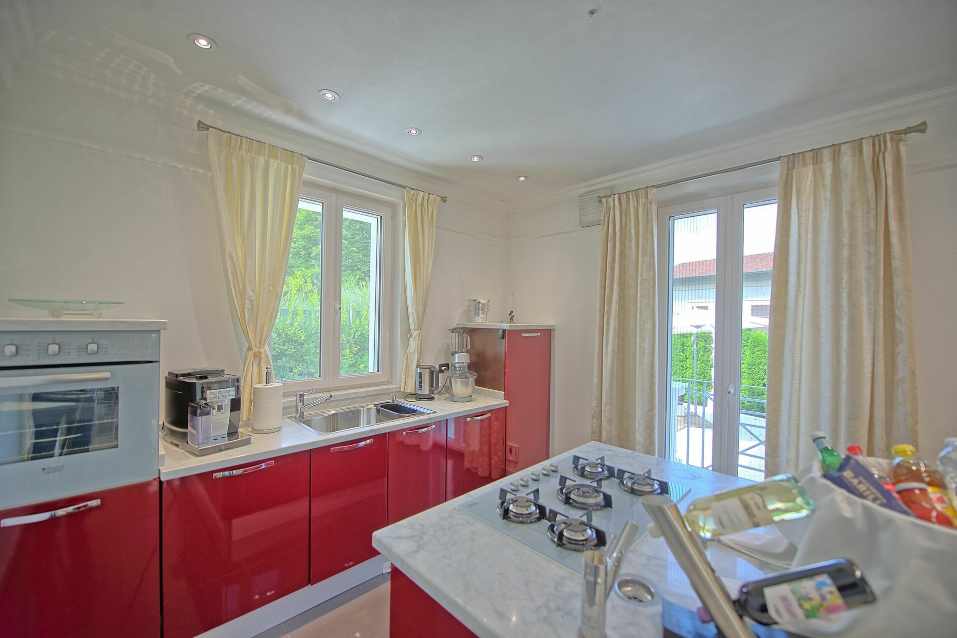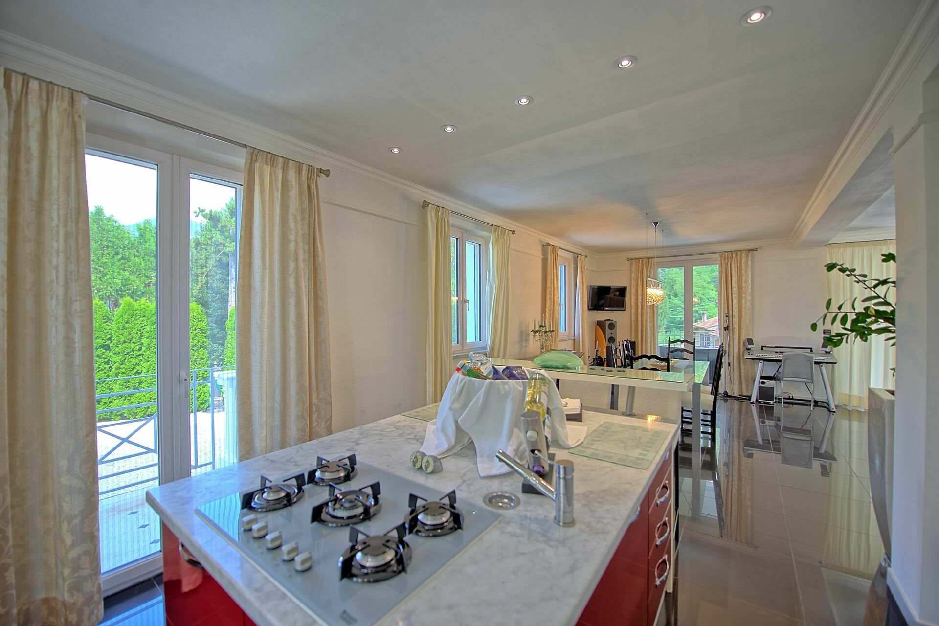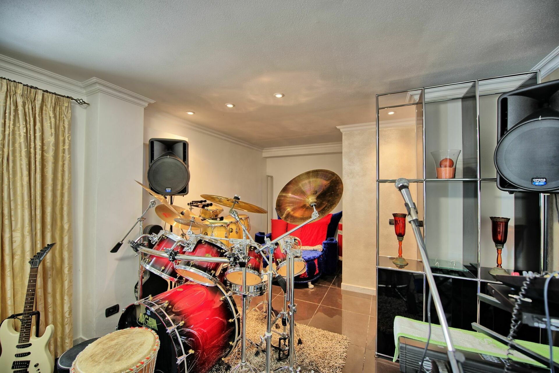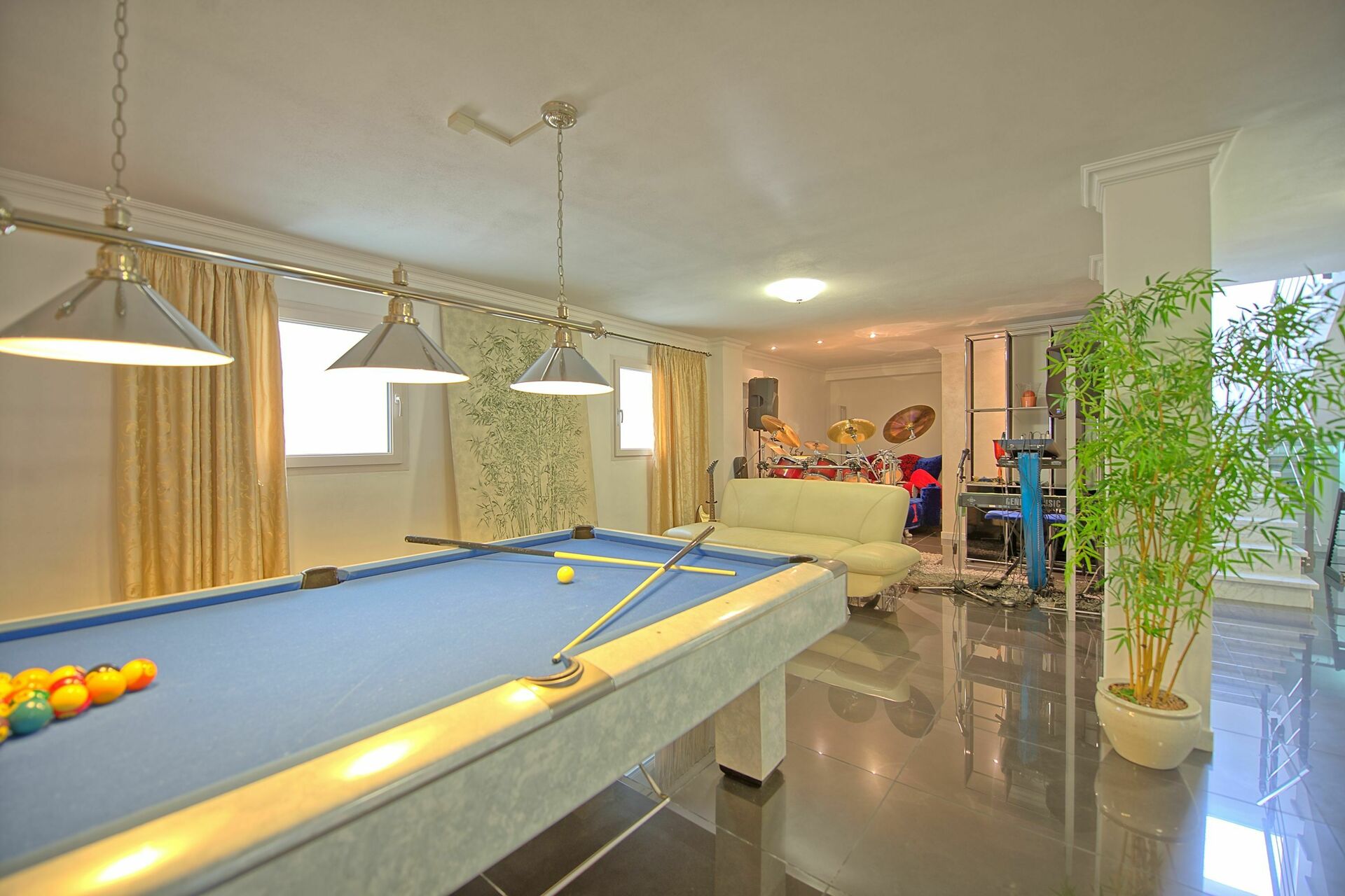 Lower floor (accessible also from outside): living area with kitchenette (oven, fridge-freezer, dishwasher), area furnished with Dolby cinema surround system, foosball table, snooker table, musical instruments (drums, keyboard, microphone), laundry room (washing machine and dryer), bathroom with shower.