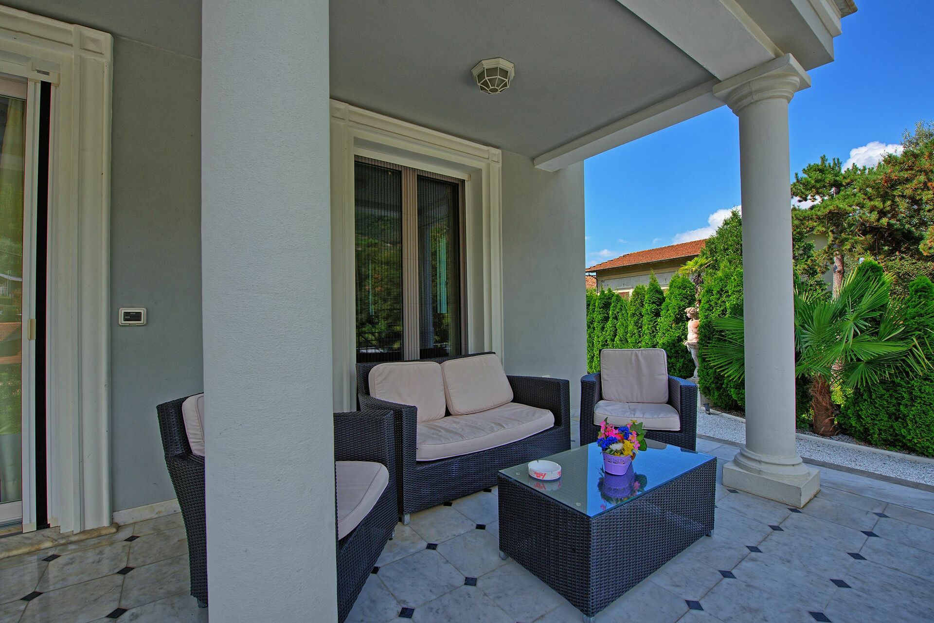 Outside, a perfect garden circles the house, offering a comfortable furnished space (barbecue, armchairs, sofas, tables and chairs for outdoor dining) and a beautiful private swimming pool.