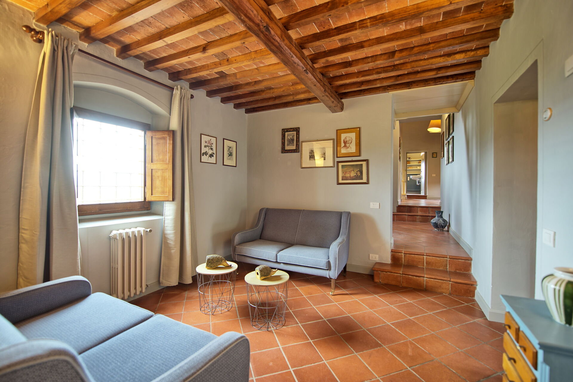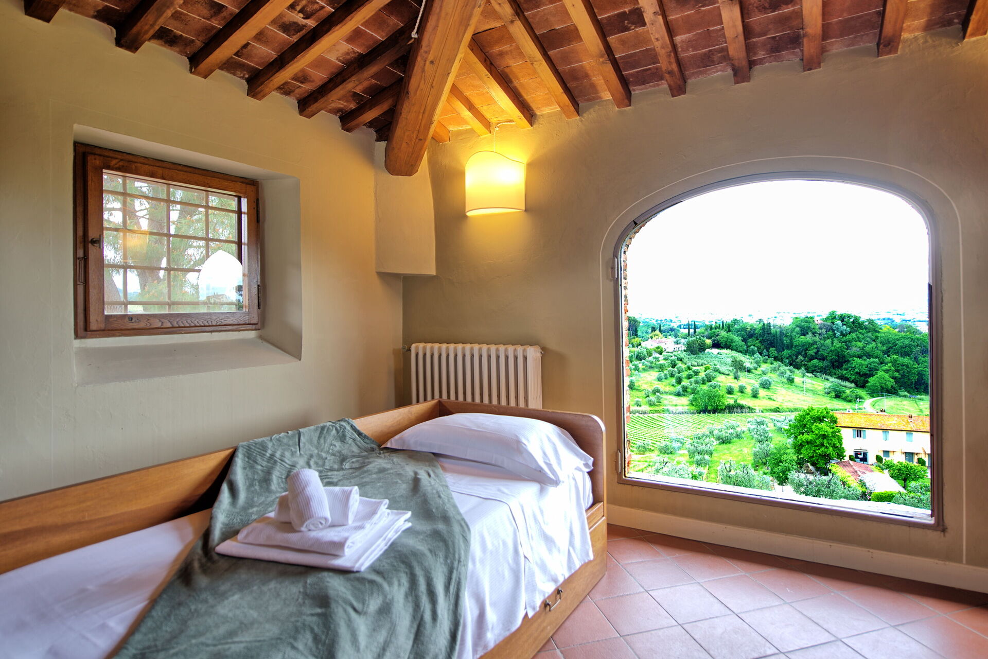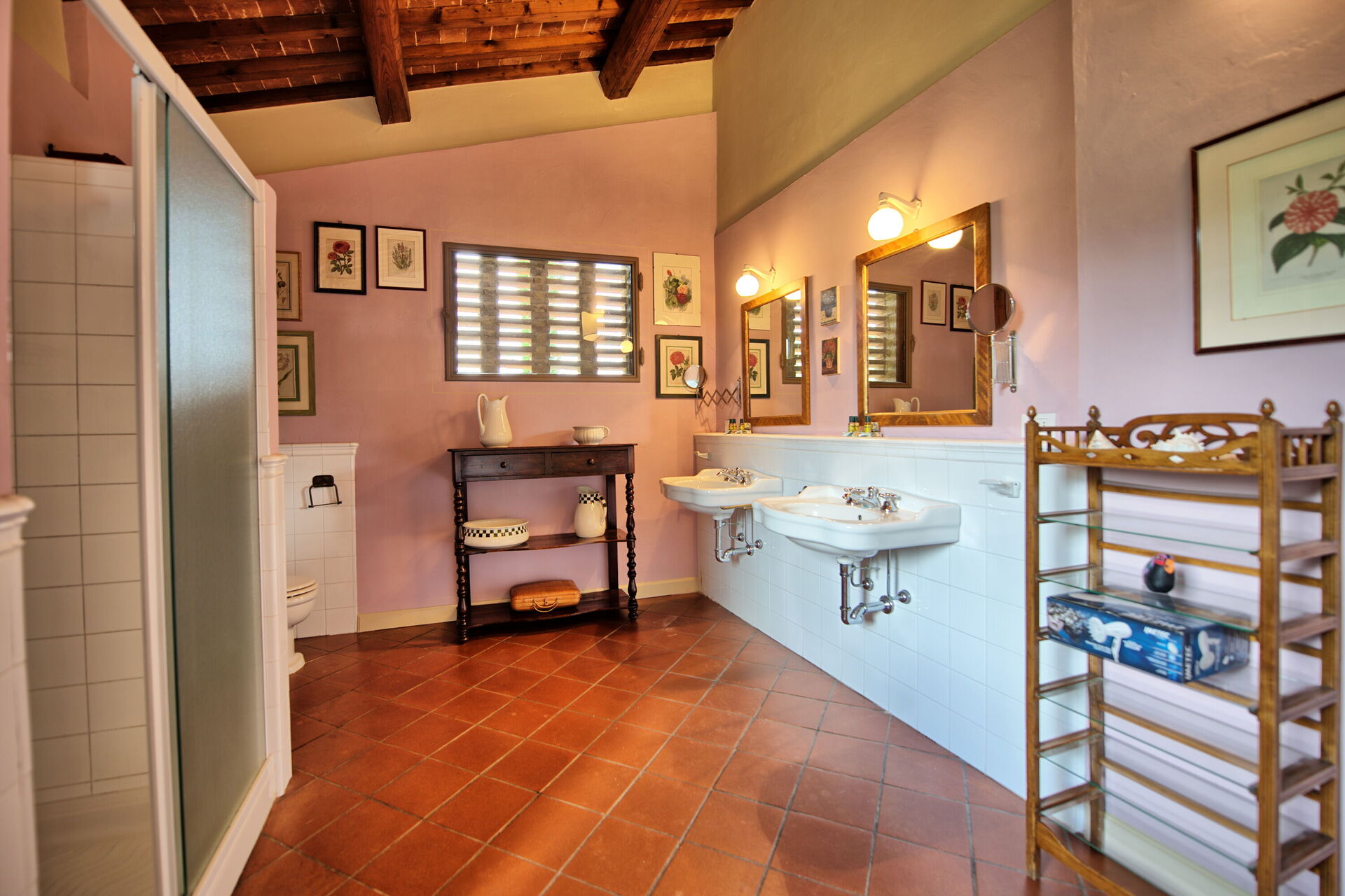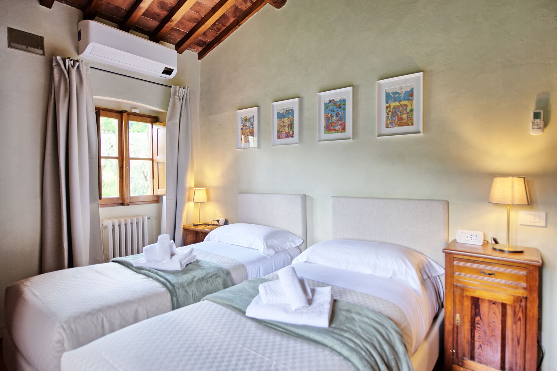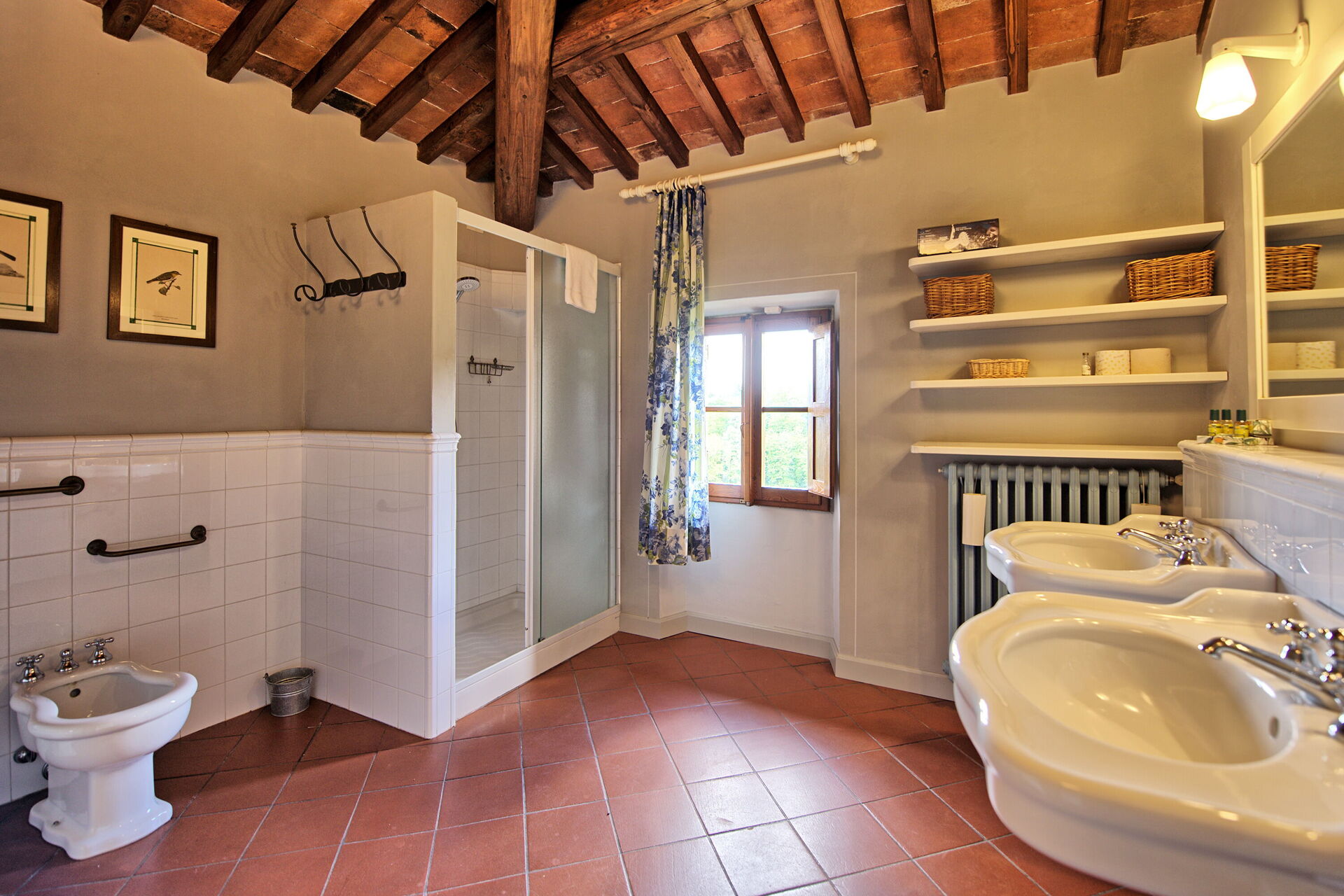 Due to its 5 bedrooms (each one with air conditioning) it can comfortably host up to 10/14 people in an ambience of traditional Tuscan character; refined, intimate and exclusive. Another 4 sleeping spaces are possible with a double sofa bed situated in a small library on the ground floor and by 2 further single beds located on the top floor of the villa on the mezzanine (formerly used as a hayloft).