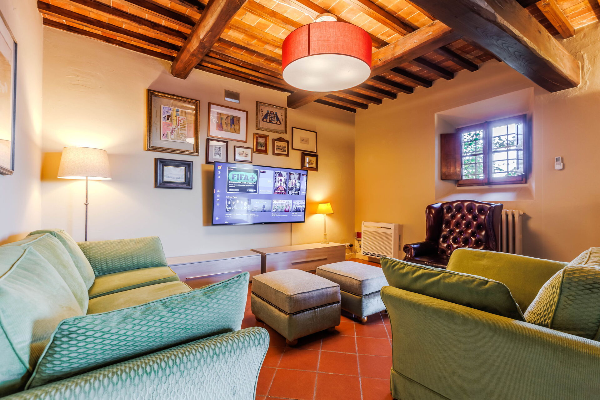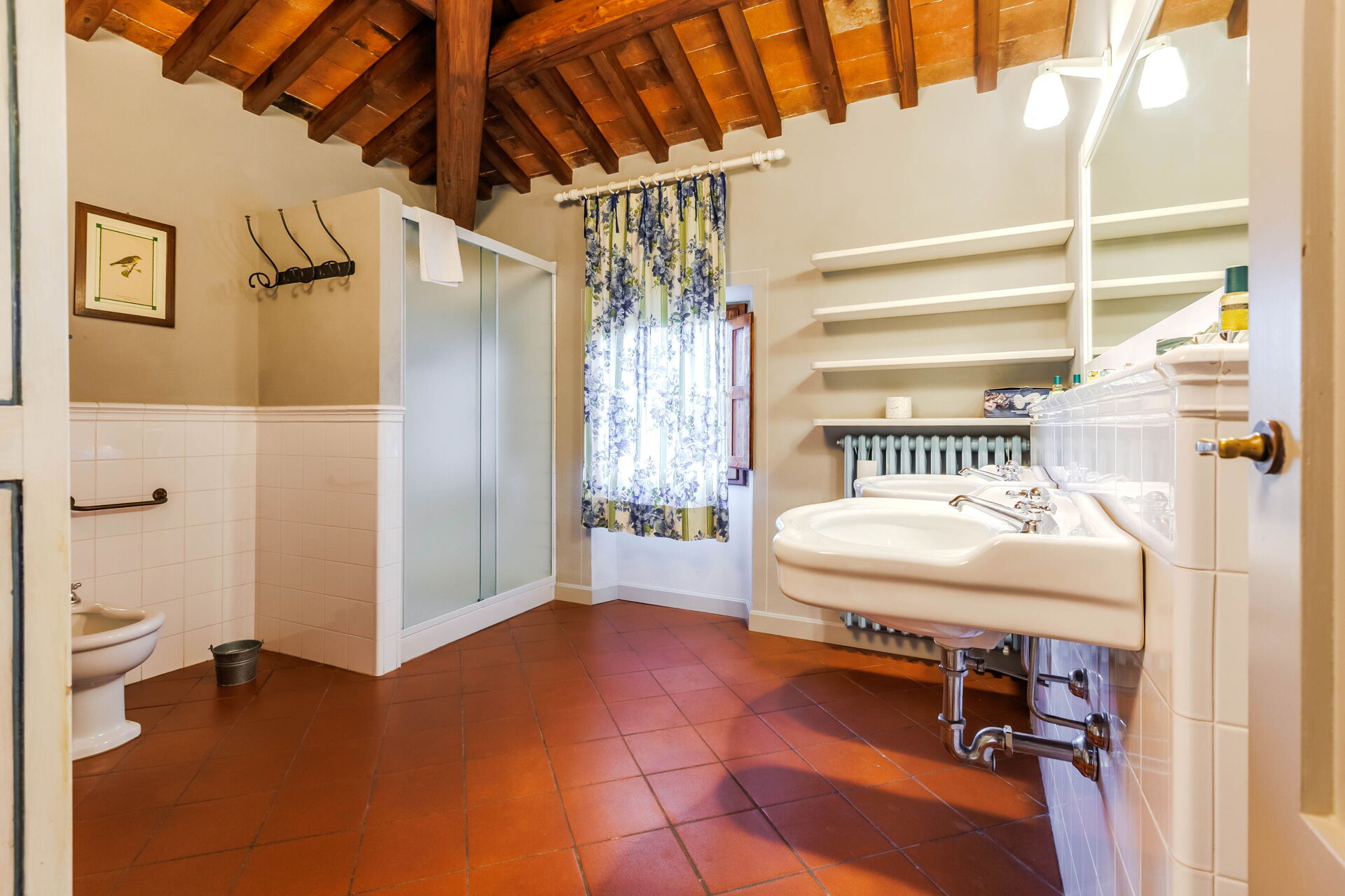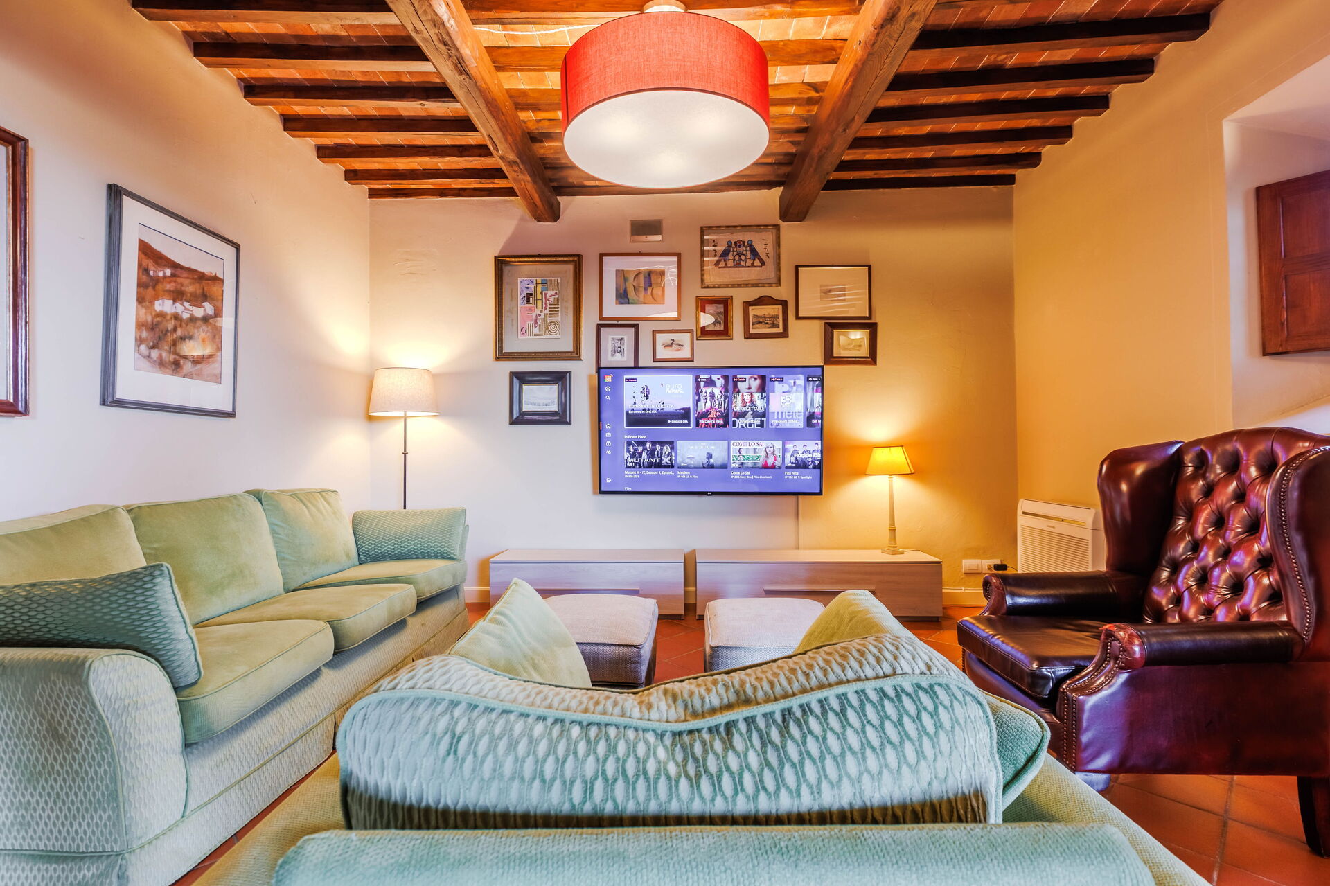 Due to its 5 bedrooms (each one with air conditioning) it can comfortably host up to 10/14 people in an ambience of traditional Tuscan character; refined, intimate and exclusive. Another 4 sleeping spaces are possible with a double sofa bed situated in a small library on the ground floor and by 2 further single beds located on the top floor of the villa on the mezzanine (formerly used as a hayloft).
