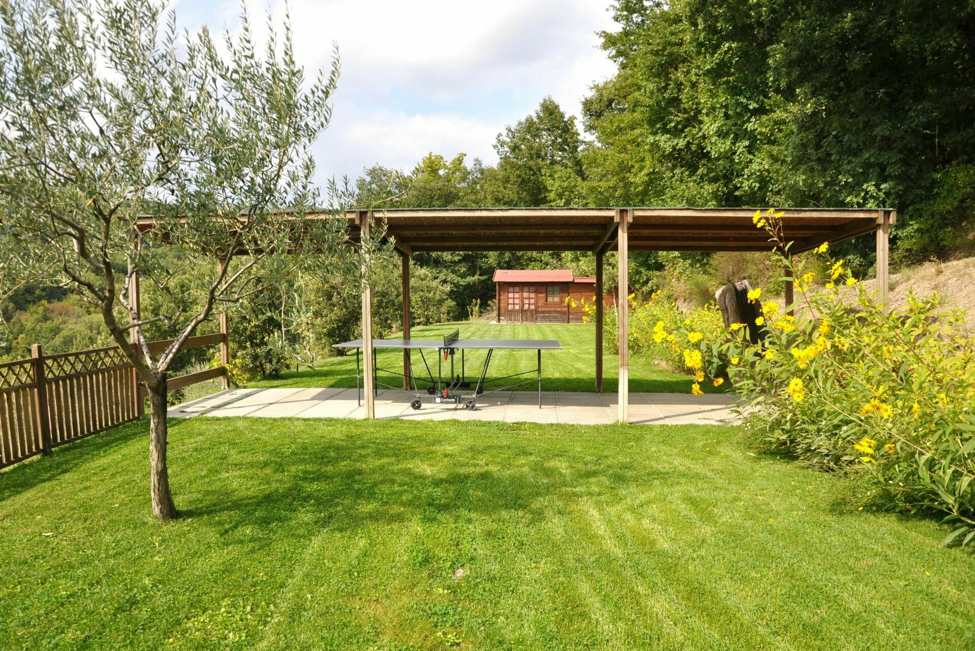 650 sqm garden with gazebo and veranda with 14 seats. Olive trees, woods, river and paths to the oak forest, easy level trekking.
