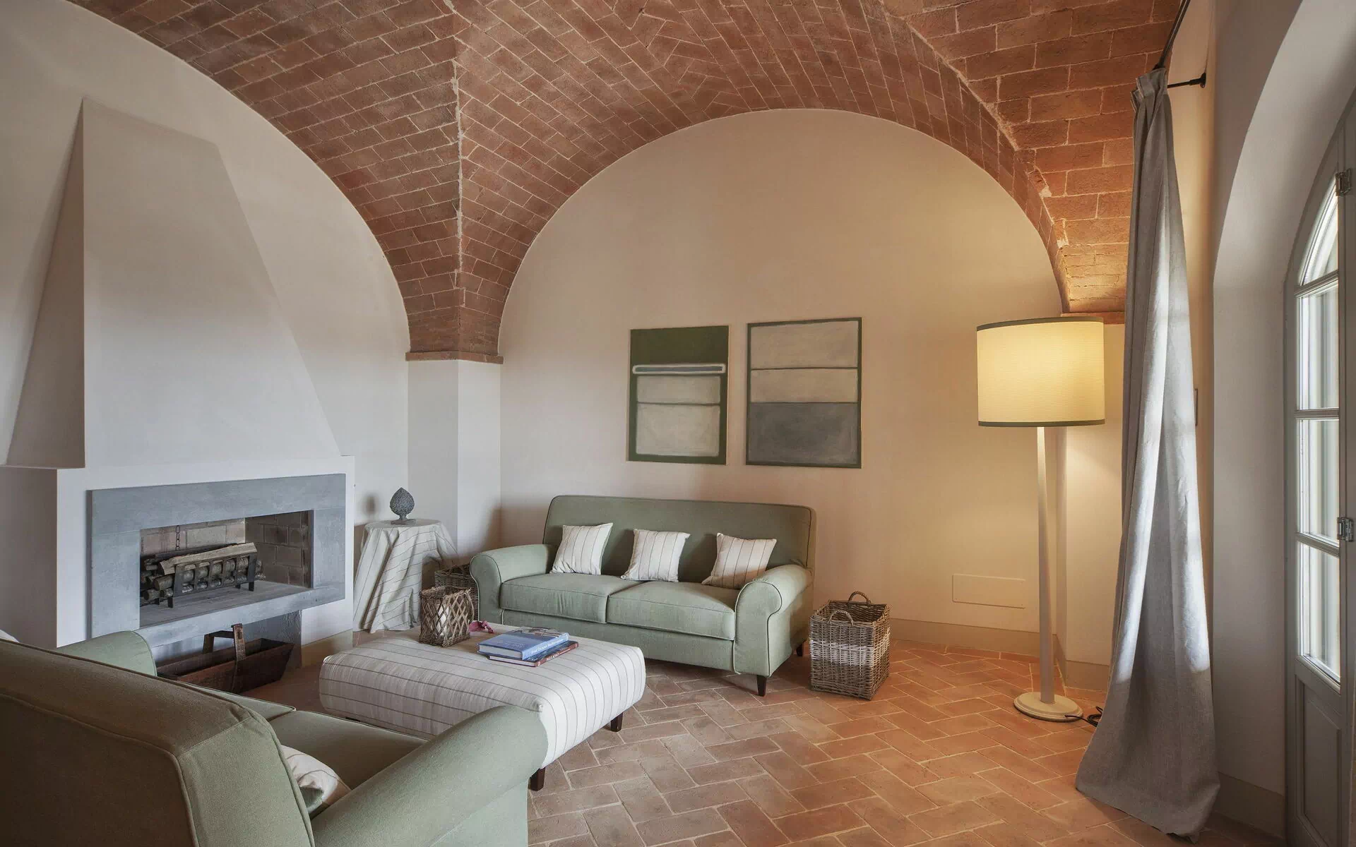 The living room has two comfortable sofas and a beautiful fireplace.