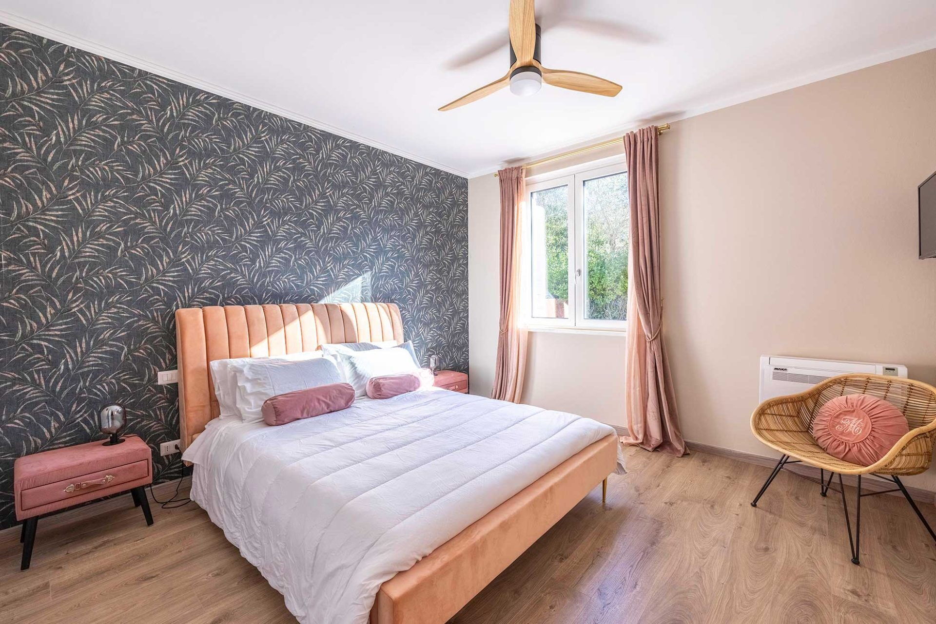 Ground floor : hallway, double bedroom with en suite bathroom with shower, second double bedroom with en suite bathroom and shower (without window). 4 steps down: living area composed of sitting room, dining area and kitchen (fridge with water cooler, oven, microwave, dishwasher, espresso coffee machine, induction hob with 4 plates), WC; access to the covered outside dining area which has been equipped with a wood-fired oven and barbecue.
