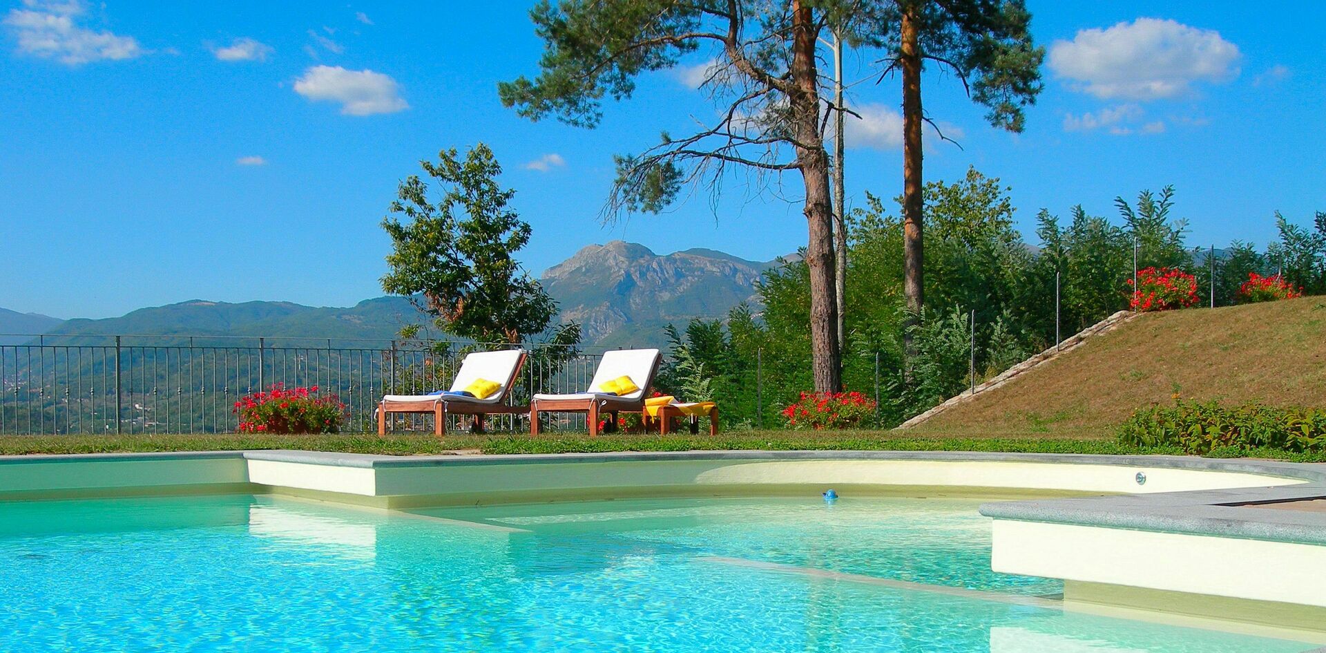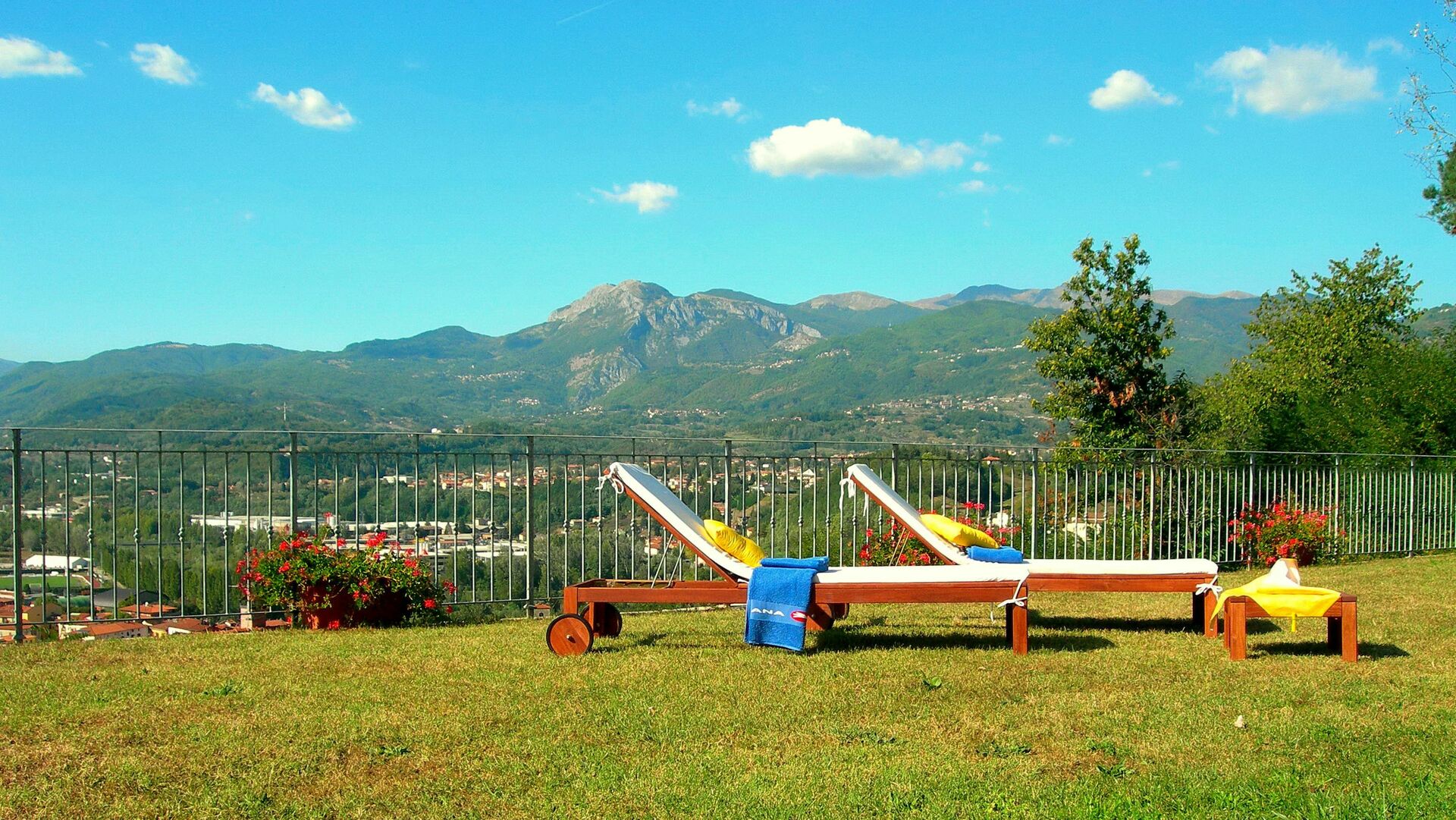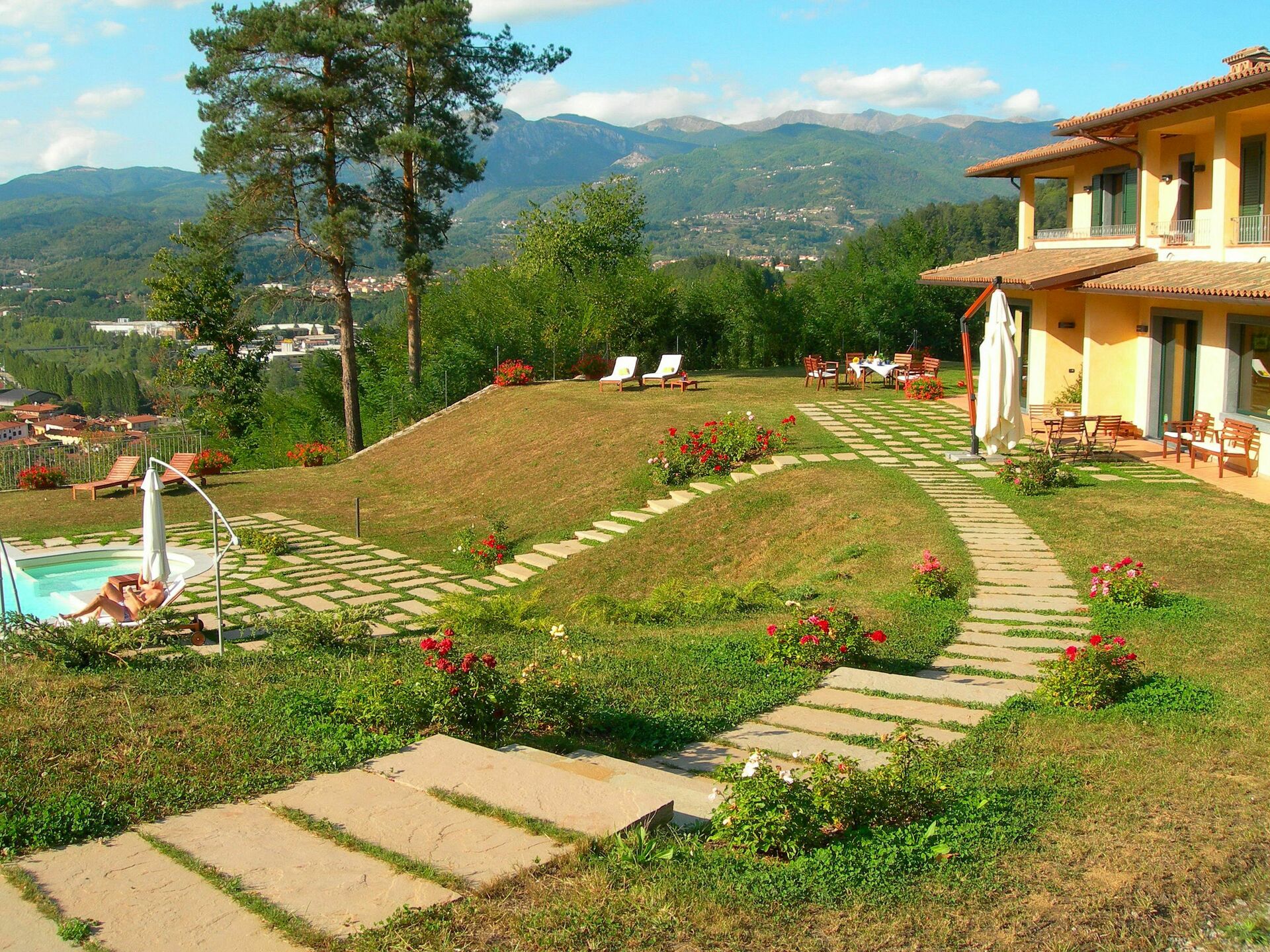 The value of the structure does not derive only from the high quality of the materials and from many comforts, but also from its location: in fact, on an area from where we can enjoy an unique view of the Alpi Apuane (the marble mountains), the Rocca Ariostesca in the centre of Castelnuovo, reachable walking on a shaded road, the Monte Alfonso and its fortress (that is part of the natural park of the Alpi Apuane) and finally the Appennino. In the river Serchio Valley we can see the Villetta bridge, one of the highest rail bridge of Italy. On the left we can admire the Pania della Croce, while on the right the beautiful "Pania di Corfino", a rocky group on which there is the Orecchiella Park, and at the far end the pass of the Radici inside the Appennino Park that, when snowy in winter, is a incredible sight.