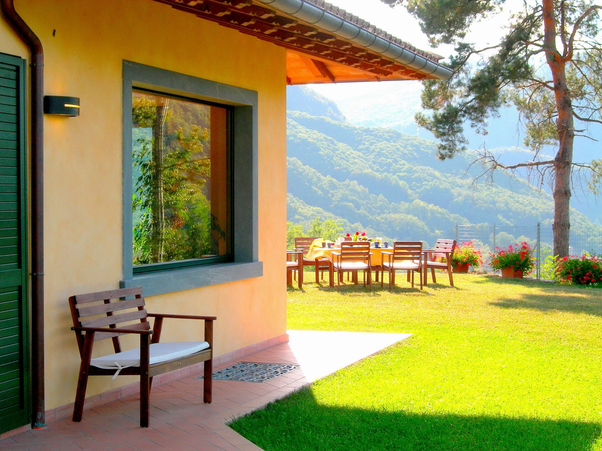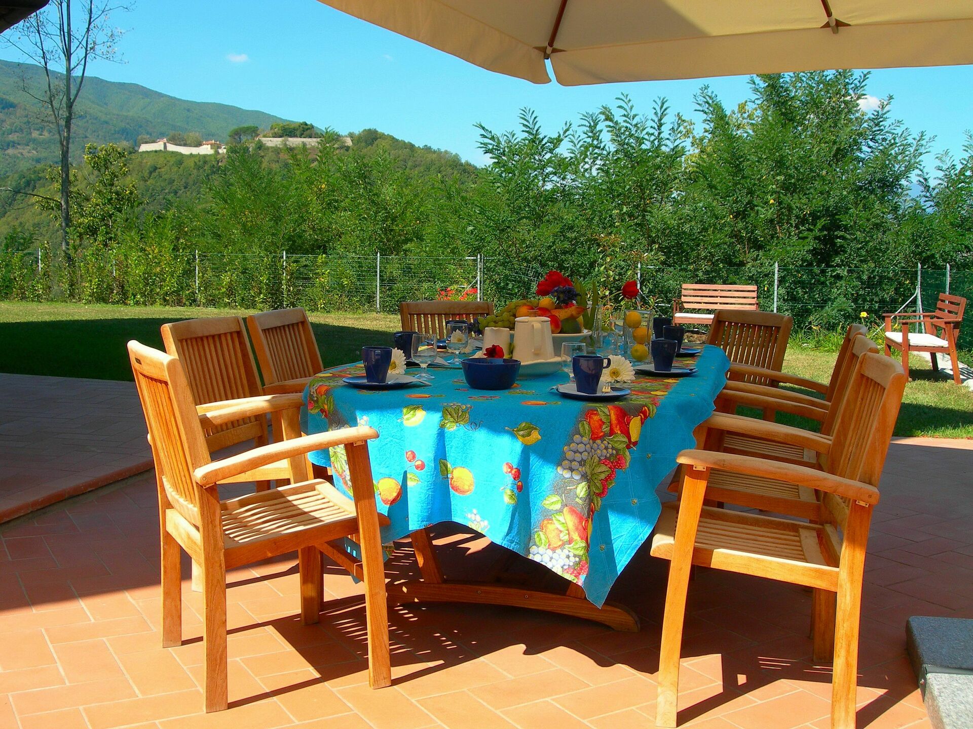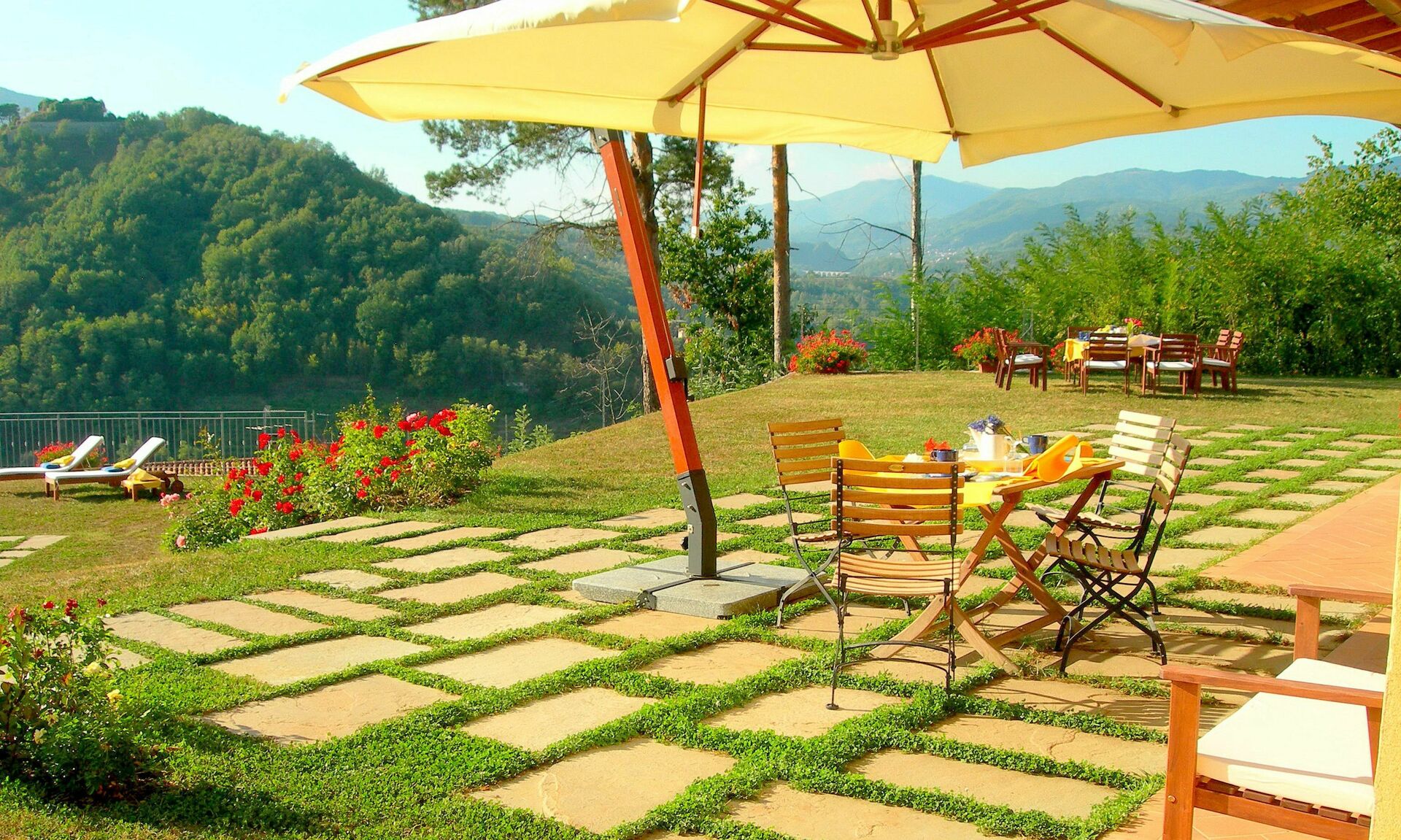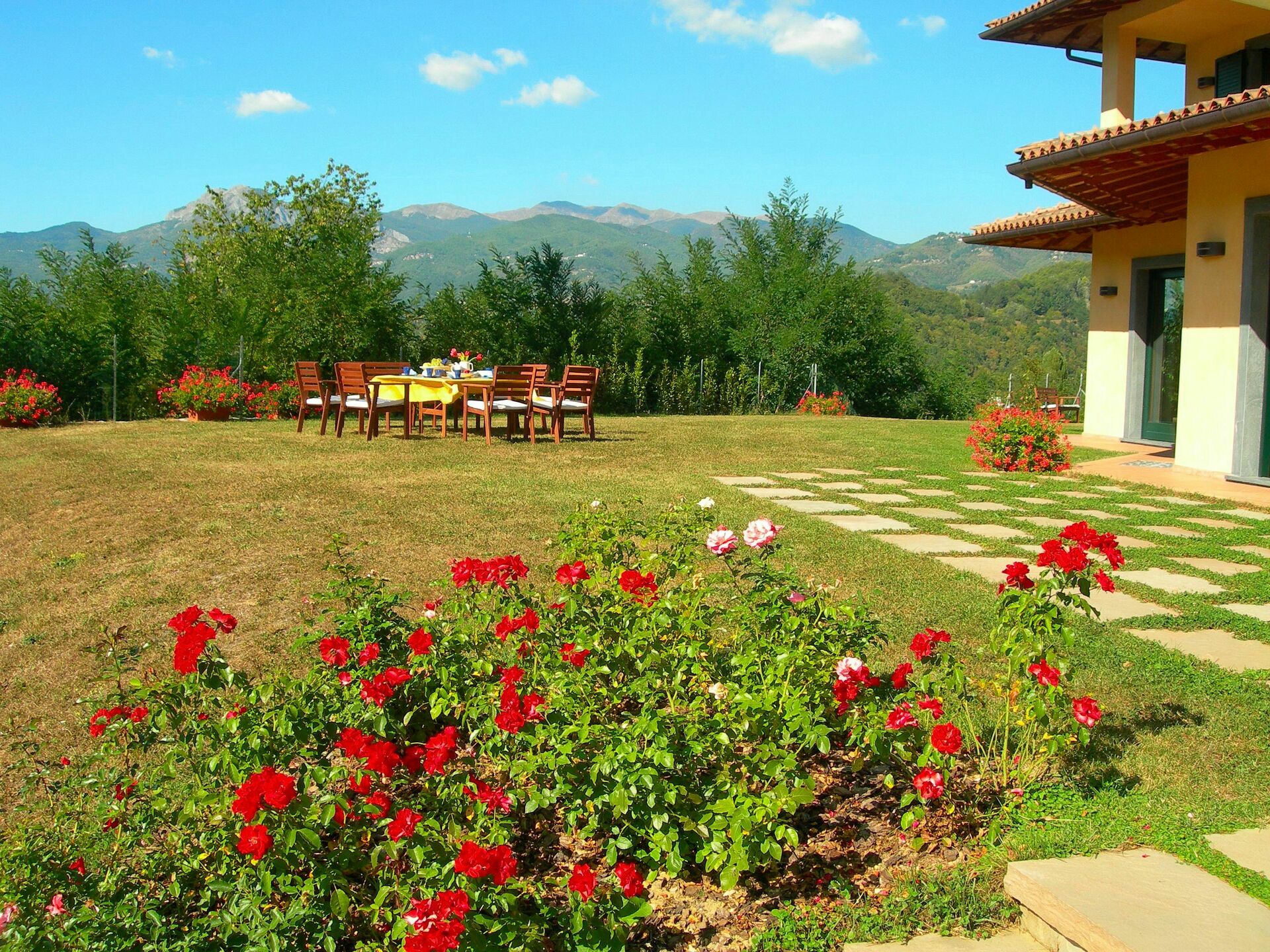 The value of the structure does not derive only from the high quality of the materials and from many comforts, but also from its location: in fact, on an area from where we can enjoy an unique view of the Alpi Apuane (the marble mountains), the Rocca Ariostesca in the centre of Castelnuovo, reachable walking on a shaded road, the Monte Alfonso and its fortress (that is part of the natural park of the Alpi Apuane) and finally the Appennino. In the river Serchio Valley we can see the Villetta bridge, one of the highest rail bridge of Italy. On the left we can admire the Pania della Croce, while on the right the beautiful "Pania di Corfino", a rocky group on which there is the Orecchiella Park, and at the far end the pass of the Radici inside the Appennino Park that, when snowy in winter, is a incredible sight.