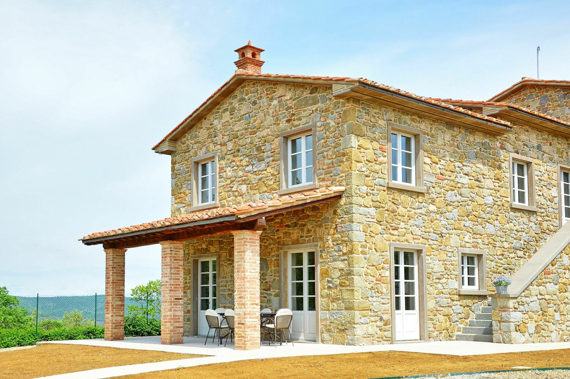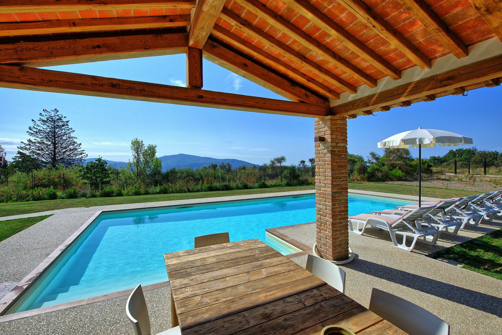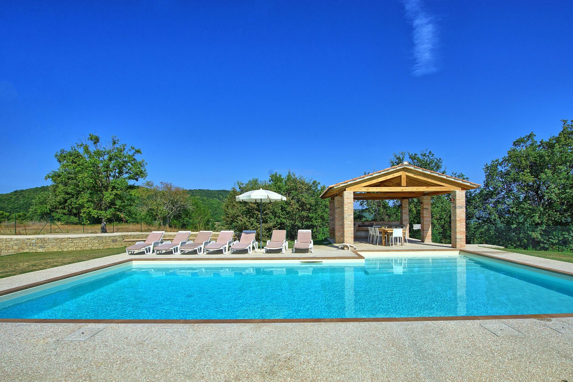 Beautiful holiday villa for rent with a private swimming pool in Tuscany, close to Castiglion Fiorentino, between the historic cities of Cortona and Arezzo. The property finished construction in 2018 and offers a very comfortable interior along with beautiful outside spaces.