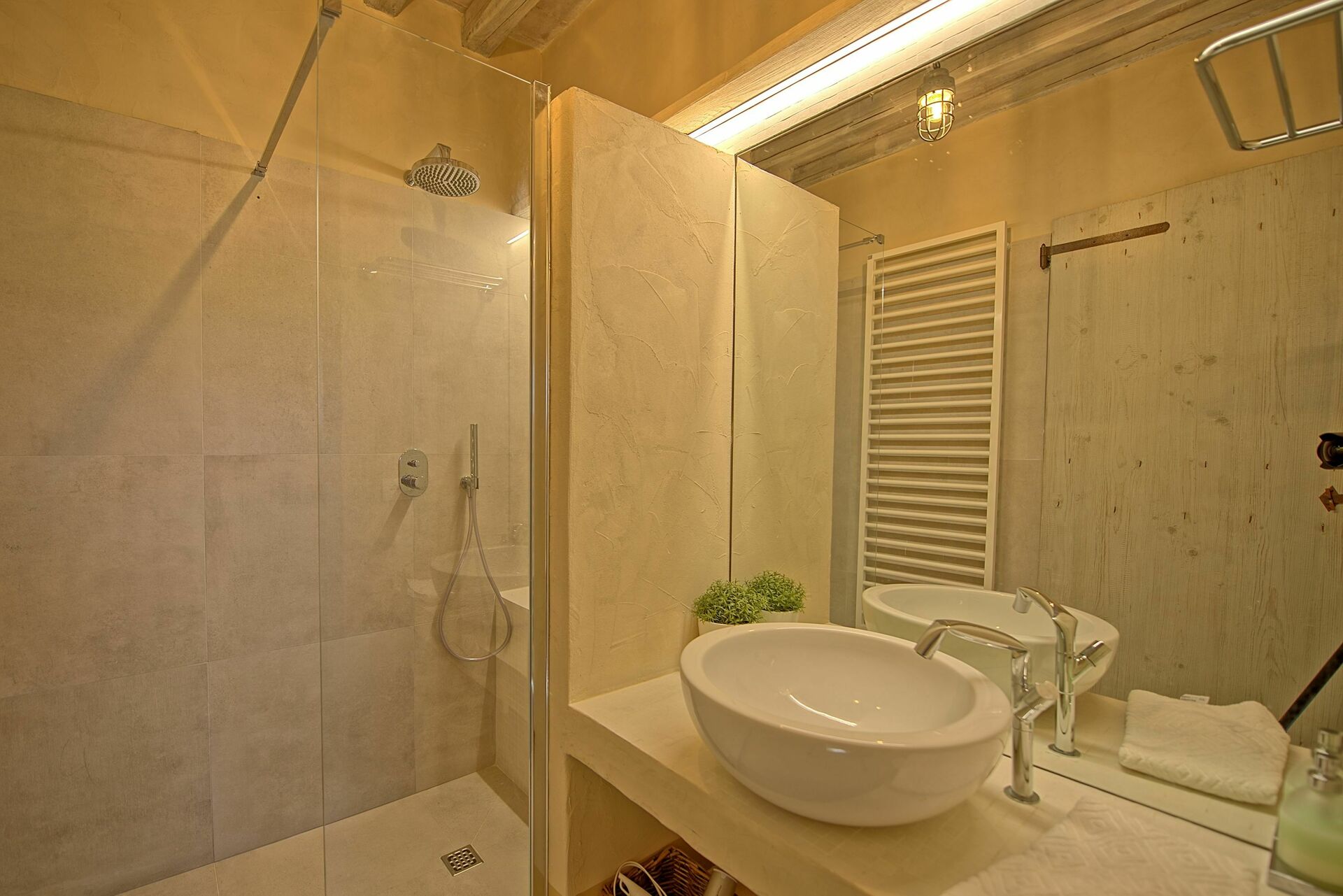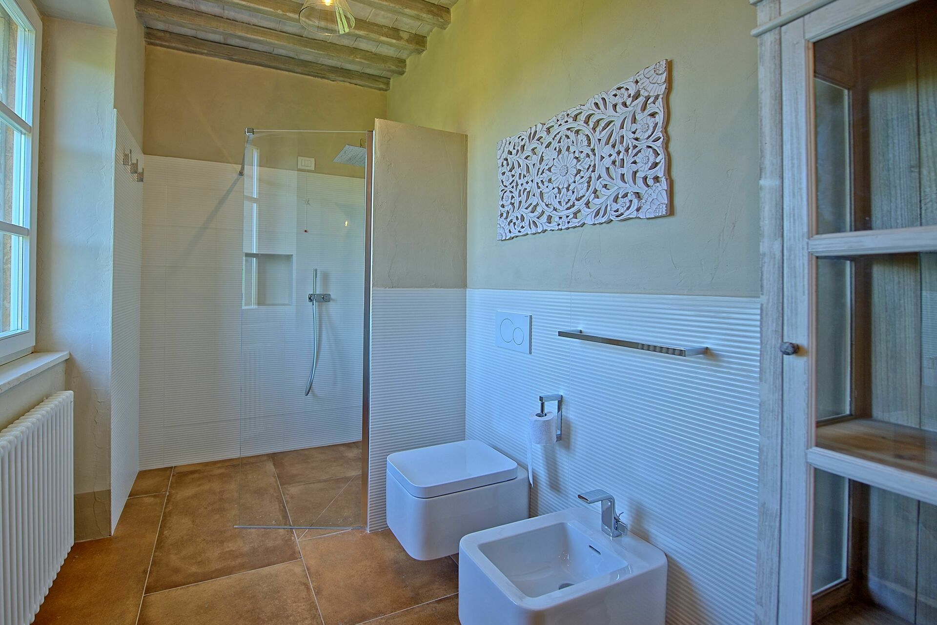 First floor: double bedroom with private bathroom with shower and hydro-massage bath, double bedroom (upon request the bed can be divided into 2 single beds), bathroom with shower, double bedroom with private bathroom with shower.