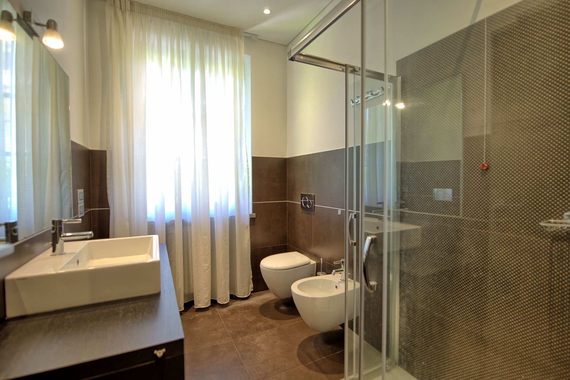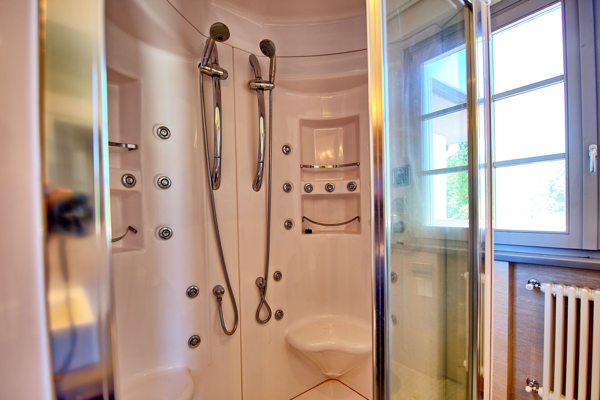 First floor: living room with TV; kitchen (oven, freezer, dishwasher); large double bedroom with double sofa bed (suitable for 2 children), terrace access and private bathroom with massage/steam shower; 2 double bedrooms ; bathroom with whirlpool bathtub and shower; double bedroom; bathroom with shower.