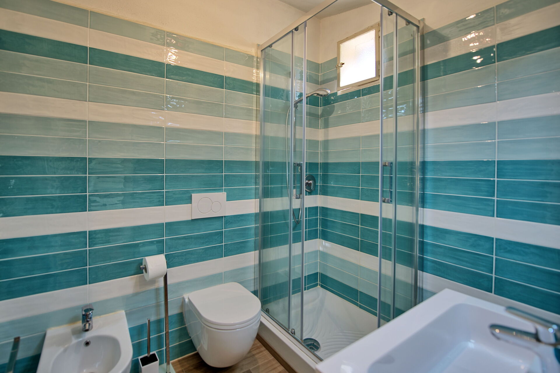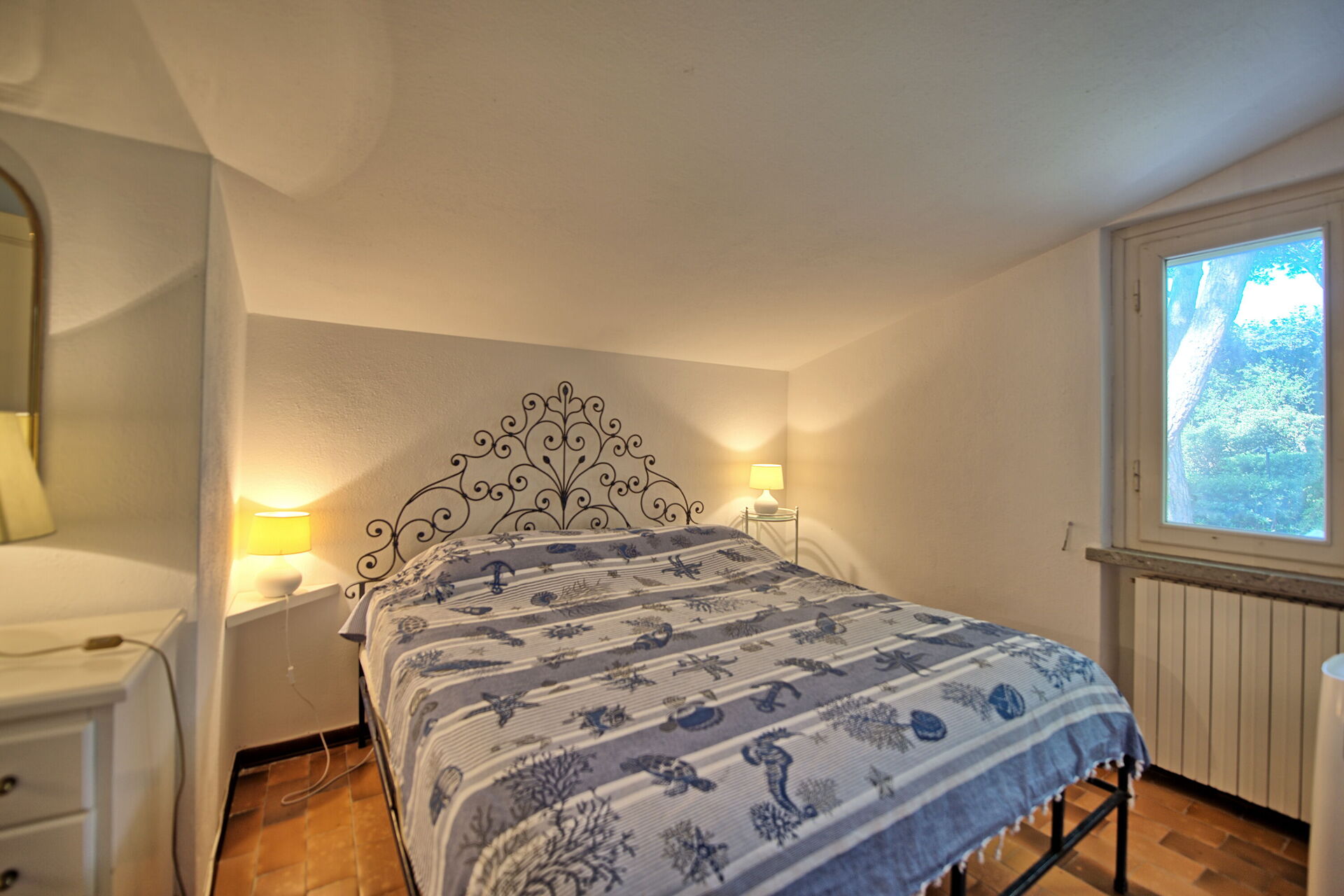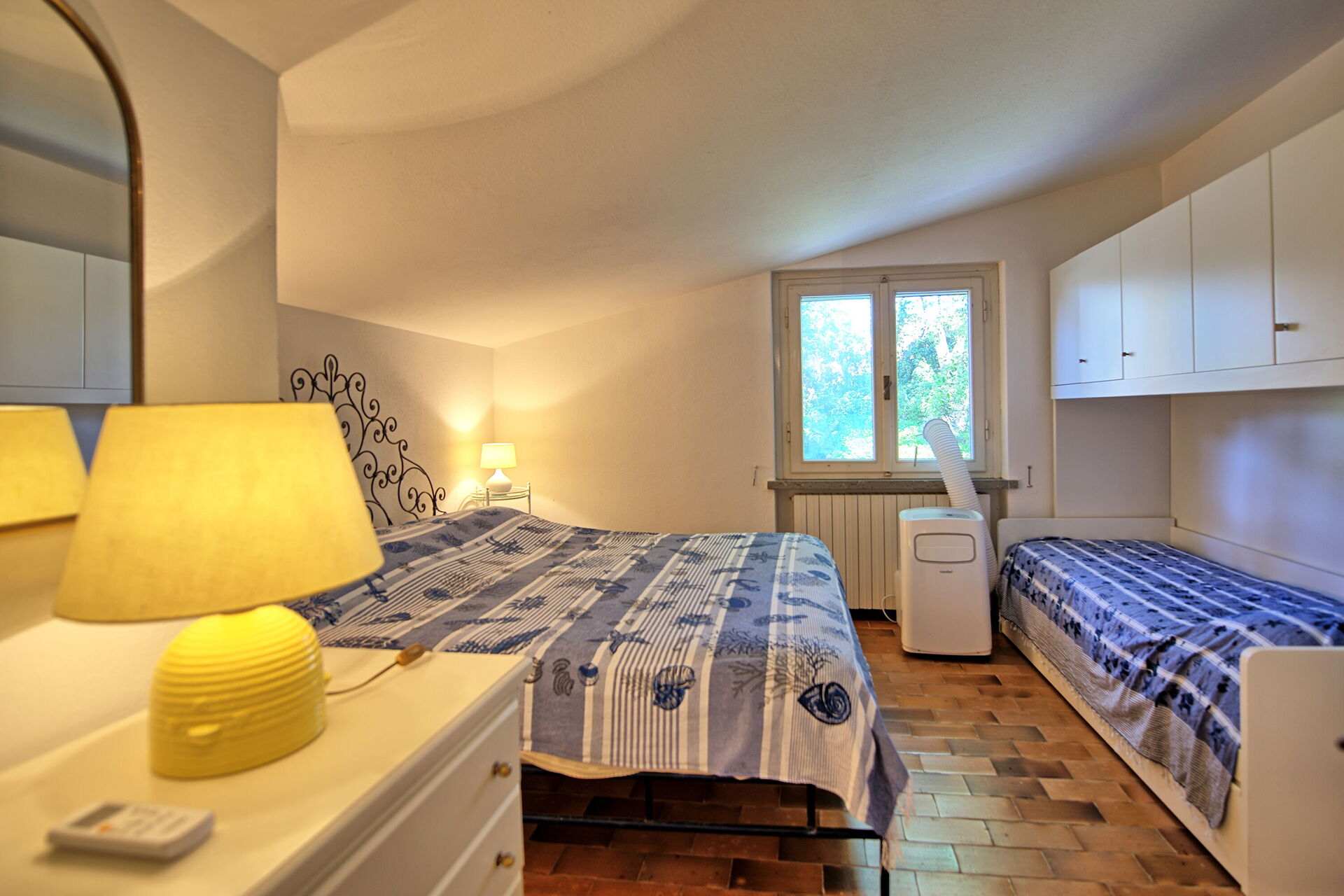 First floor: bedroom with double bed and single bed (portable air conditioning), bathroom with shower
