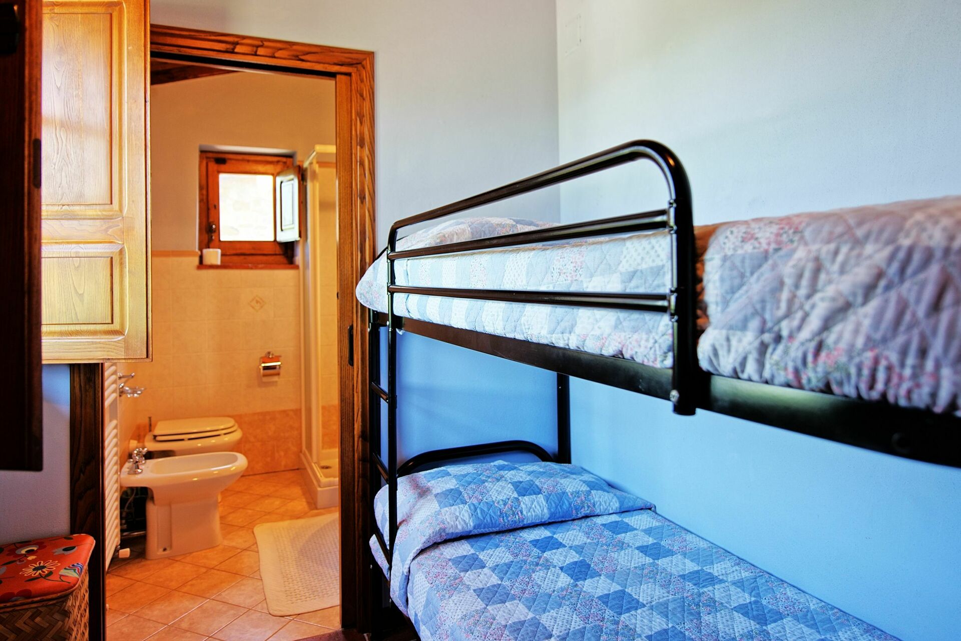 1 room with 1 double bed with access to another bedroom (bunk-beds, ok for 2 children) and from there 1 bathroom with shower