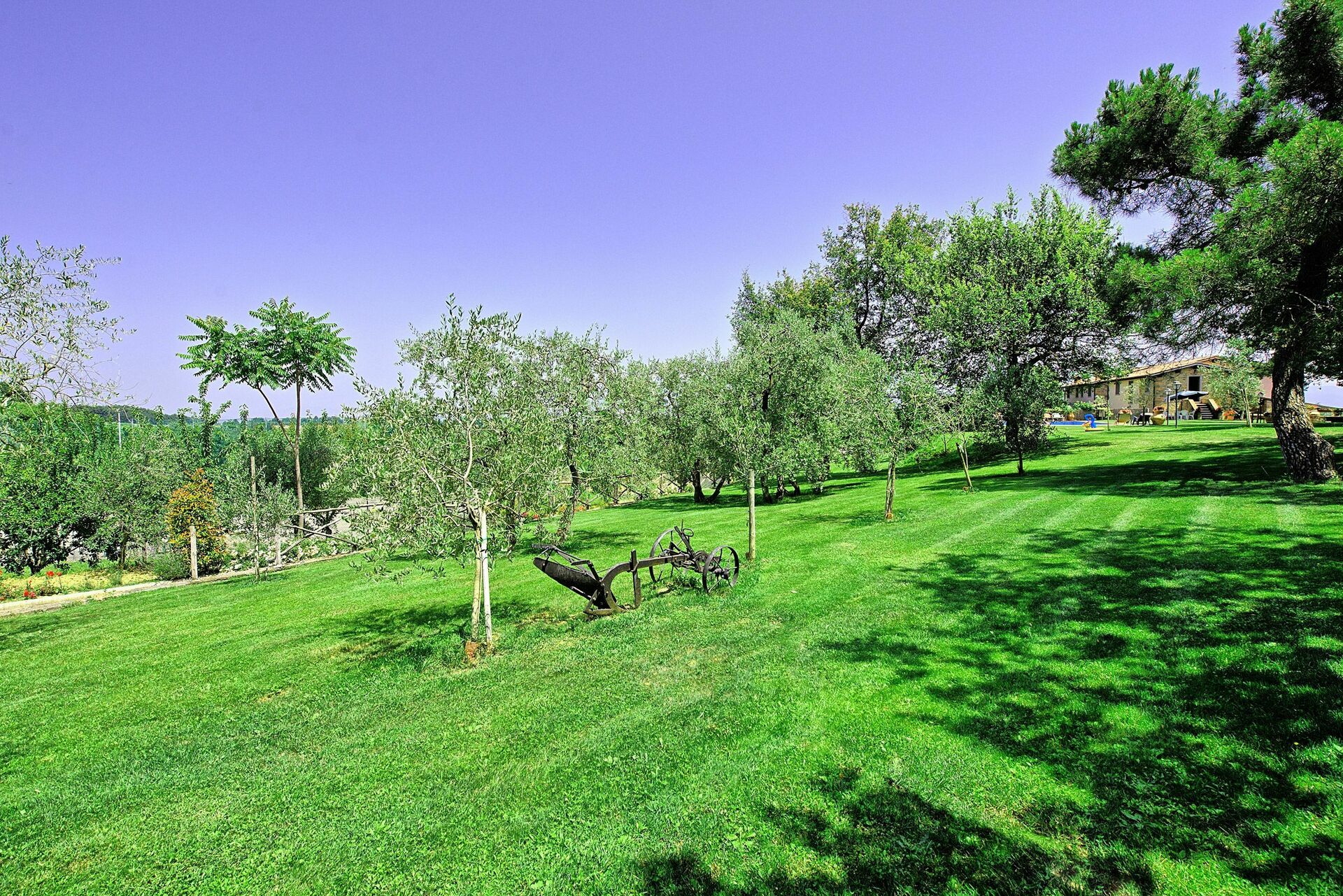 The house is surrounded by a wide and inviting fenced garden entered by an automatic gate, with wide spaces of inviting meadows.