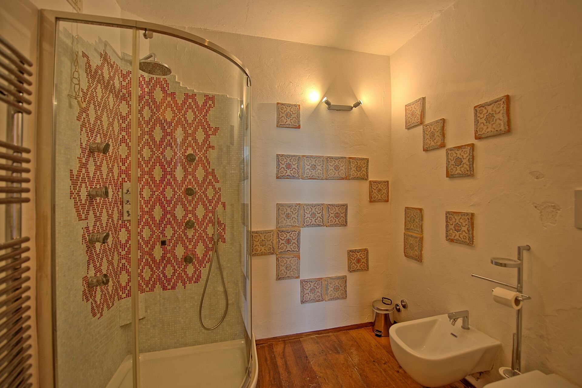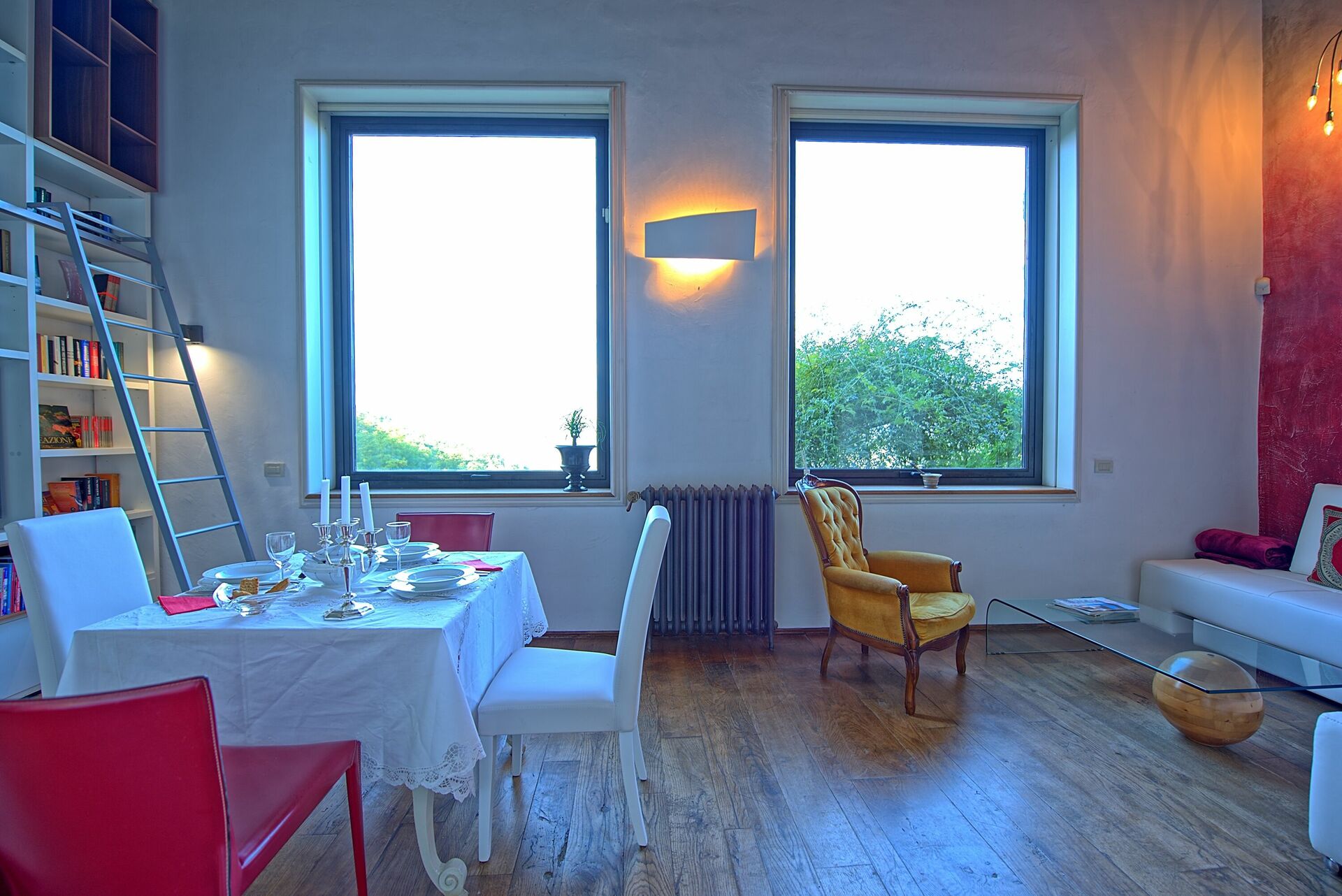 First floor: A spiral staircase leads from the living room to the main double bedroom, which is open to the space below and includes air conditioning and a private bathroom with a bathtub. The second double bedroom can be accessed through the main bedroom or directly from outside. When the double doors between them are closed, both rooms become completely private. This second bedroom also includes a double sofa bed, a small kitchenette with a table, and a compact half bath with a toilet and sink.