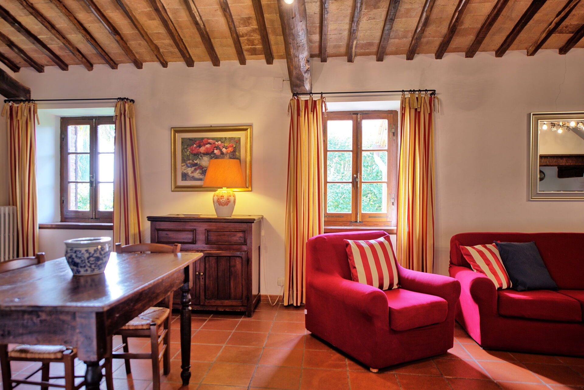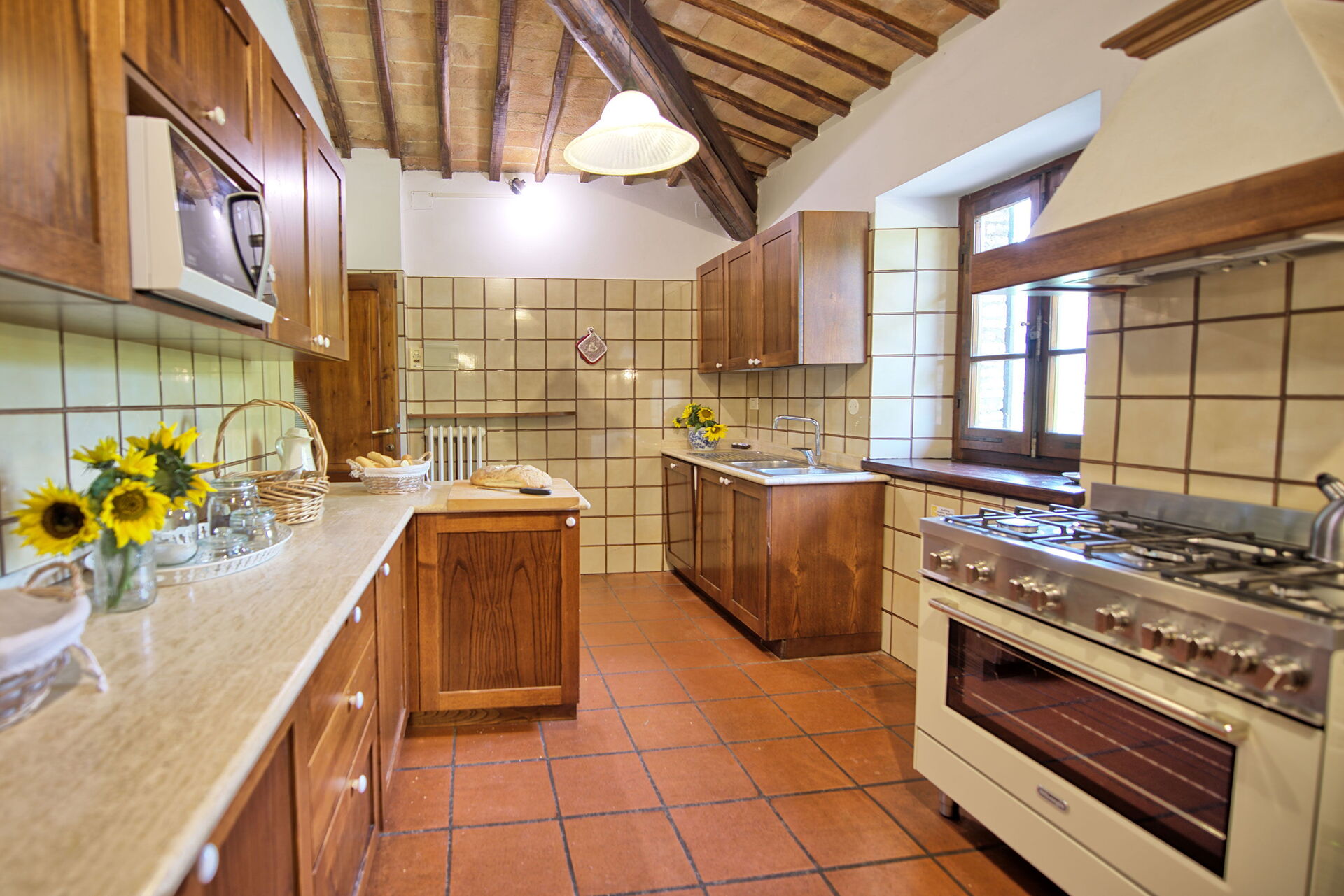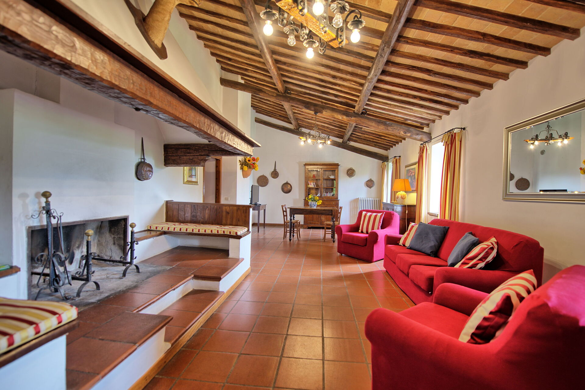 The stone house offers splendid 360° views of the Tuscan countryside. It has been painstakingly renovated, preserving original details like large fireplaces, terra cotta floors and wooden-beamed ceilings.