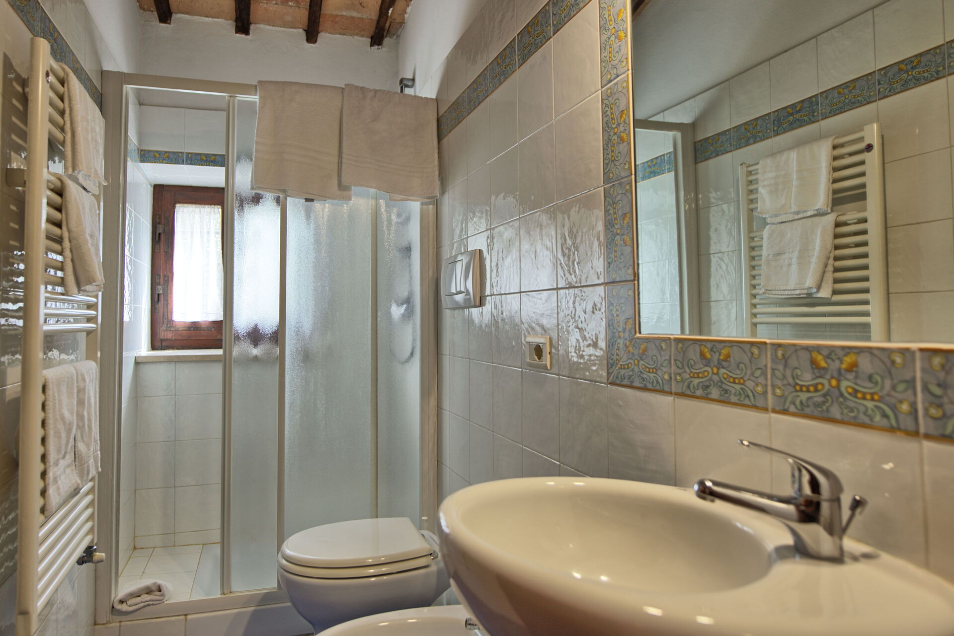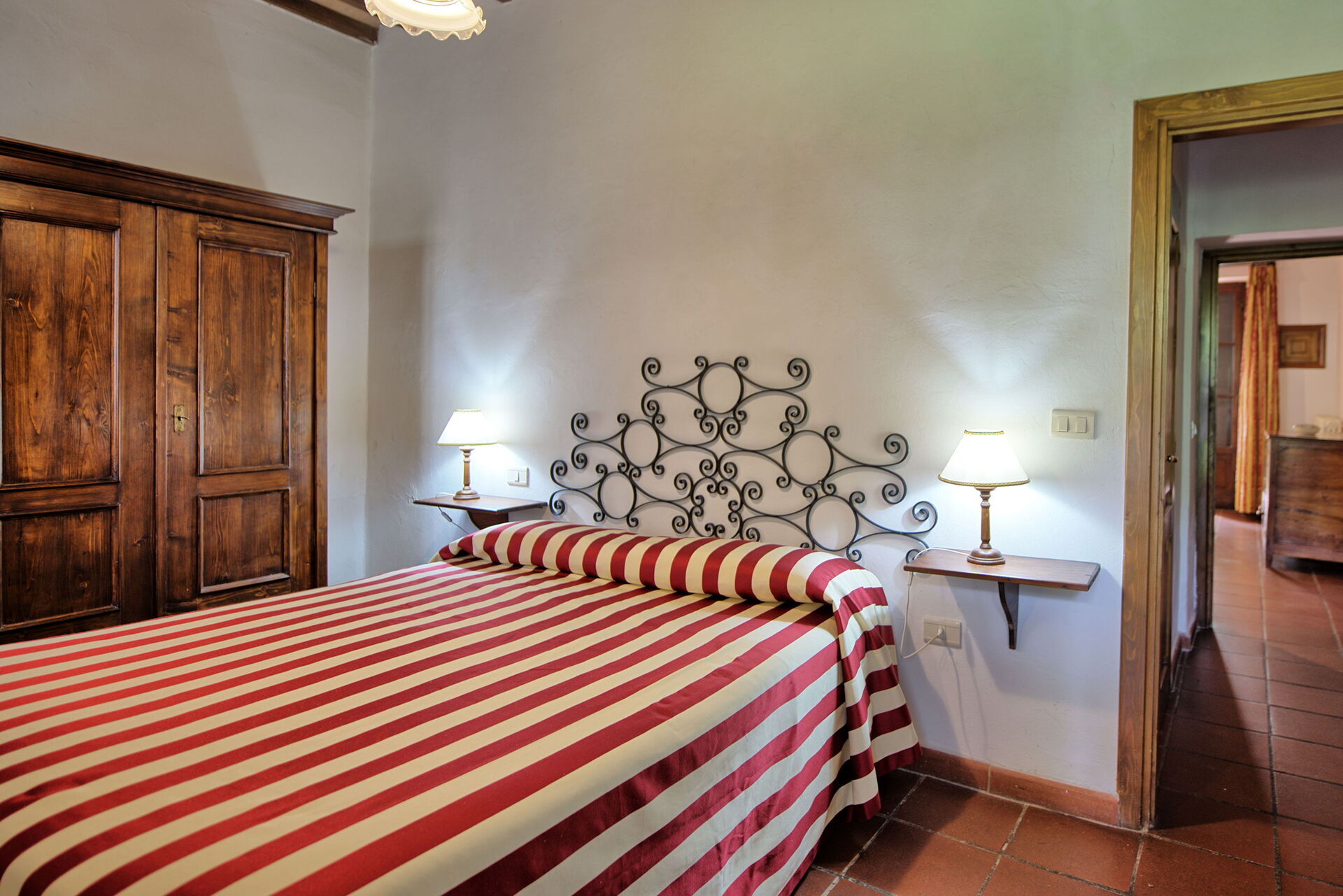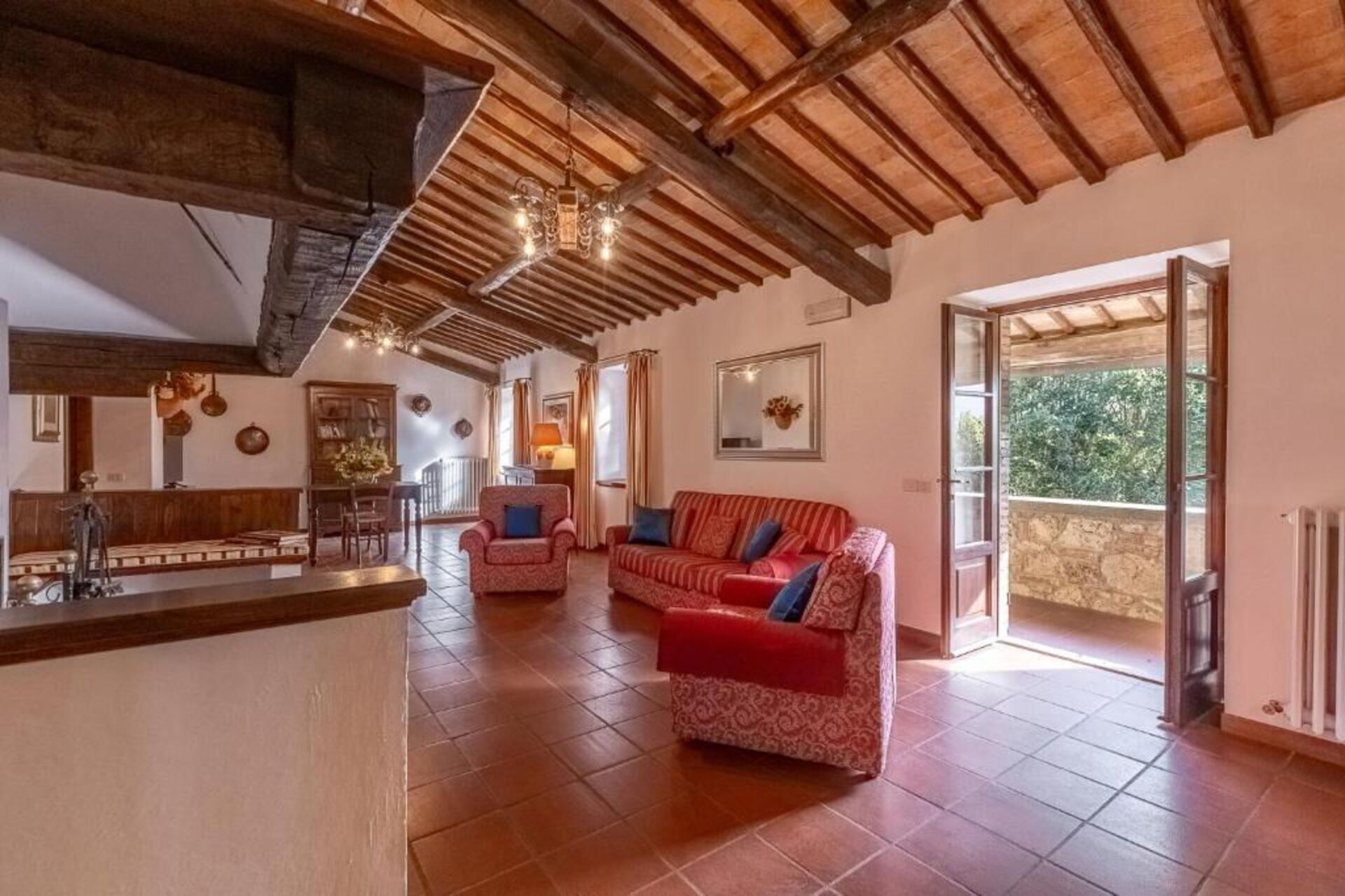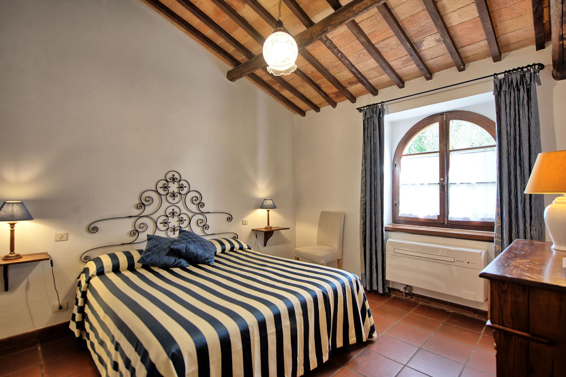 The stone house offers splendid 360° views of the Tuscan countryside. It has been painstakingly renovated, preserving original details like large fireplaces, terra cotta floors and wooden-beamed ceilings.