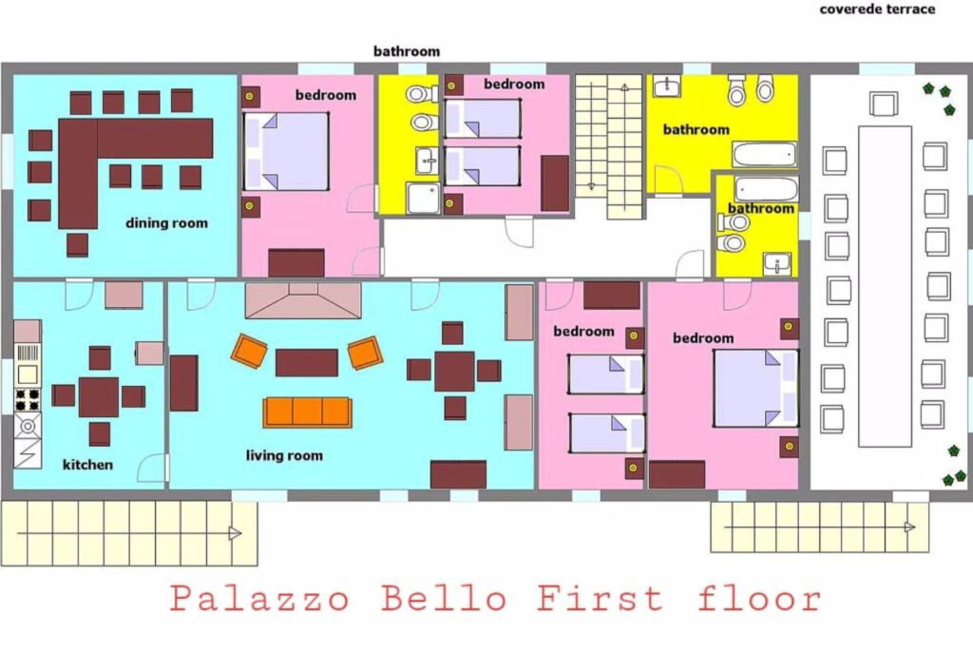 The property is perfect for large groups wishing to spend a vacation all together without sacrificing any privacy: Palazzo Bello is divided into 4 apartments and offers a total of 10 bedrooms to comfortably accommodate up to 20 people. On the first floor there is a large hall where the entire group can gather and eat all together. There is also a large outdoor veranda that can accommodate guests outside.