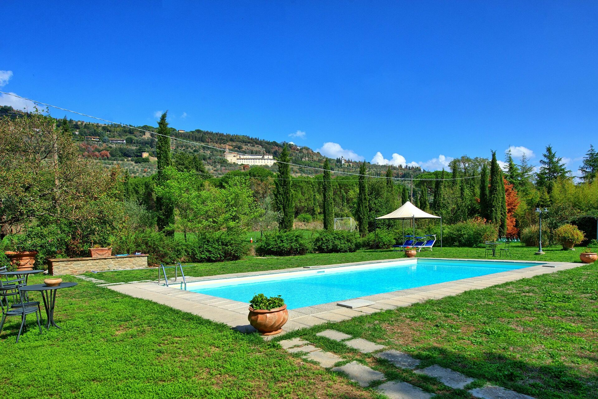 Beautiful villa in stunning rural setting walkable to amenities and a short drive / bus from Cortona. Gorgeous pool area. Cooking facilities very basic with ancient appliances. Bathrooms dated but clean. Fantastic characterful property in lovely setting but facilities dated.