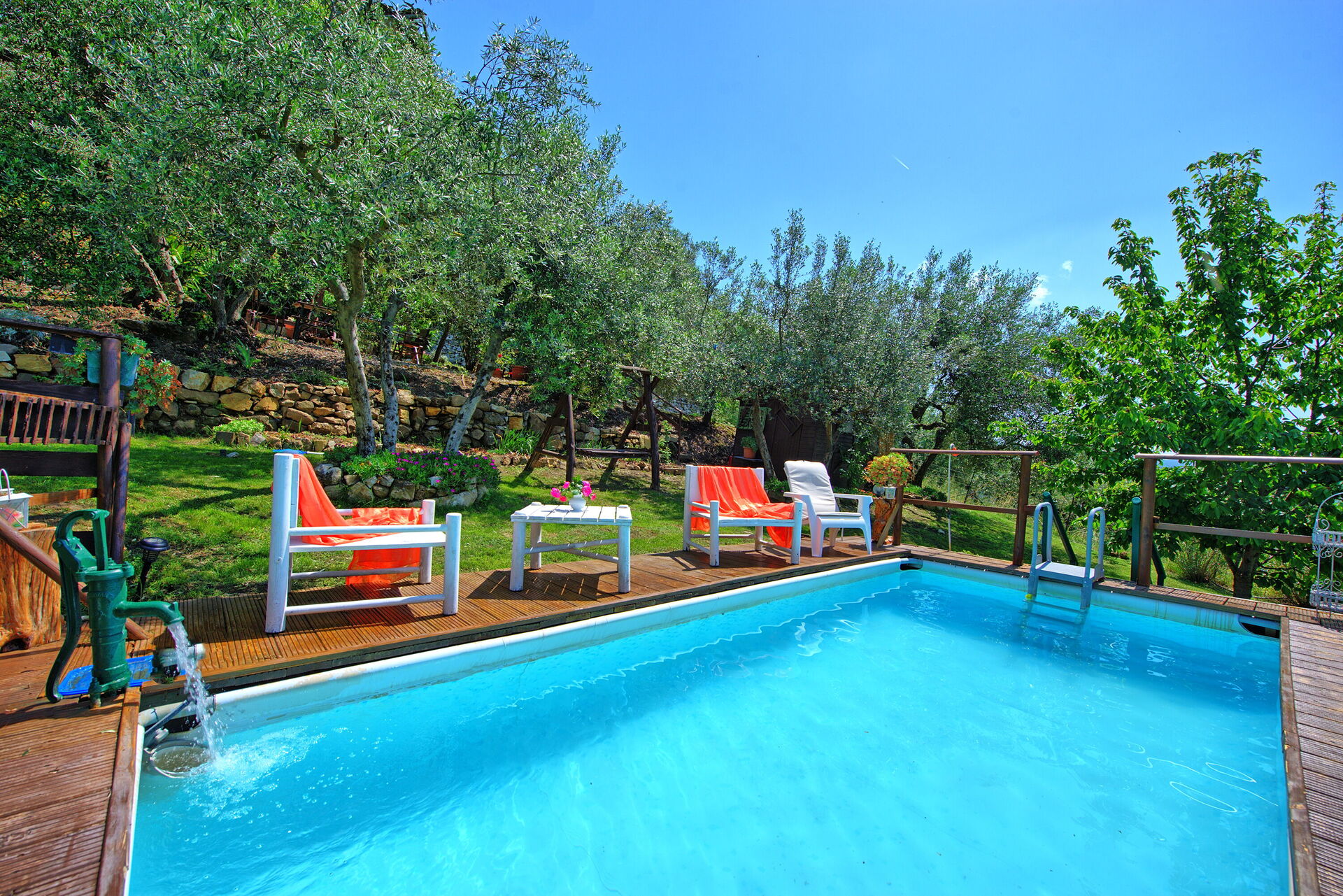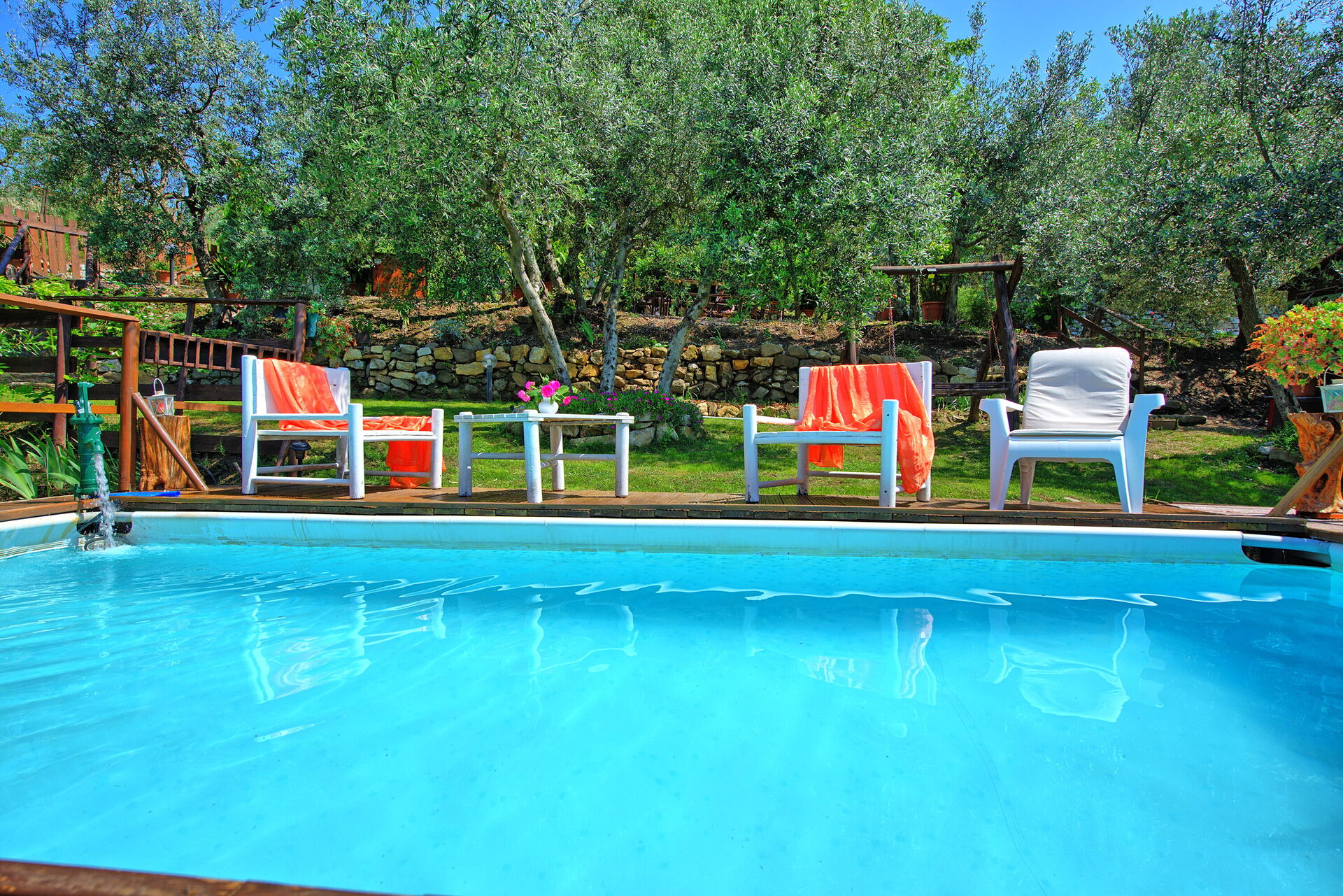 The holiday house, cozy and welcoming, has been recently restored. It also offers a tiny terrace furnished with table and chairs perfect to enjoy an al-fresco meal overlooking Duddova’s alleys. Around 100m from the vacation rental, the owner has created a private area, reserved to the exclusive use of the guests staying in La Ruota, provided with garden furniture and a pleasant private swimming pool (above ground).