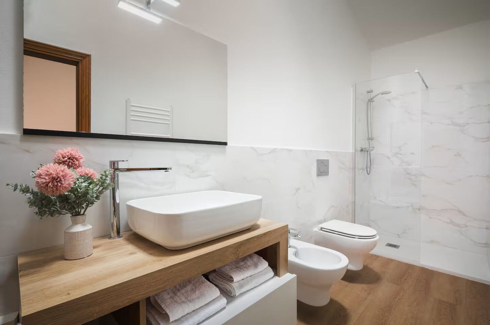 Ground floor: kitchen, pellet fireplace, double bedroom, bedroom with 2 single beds, 2 bathrooms with shower.