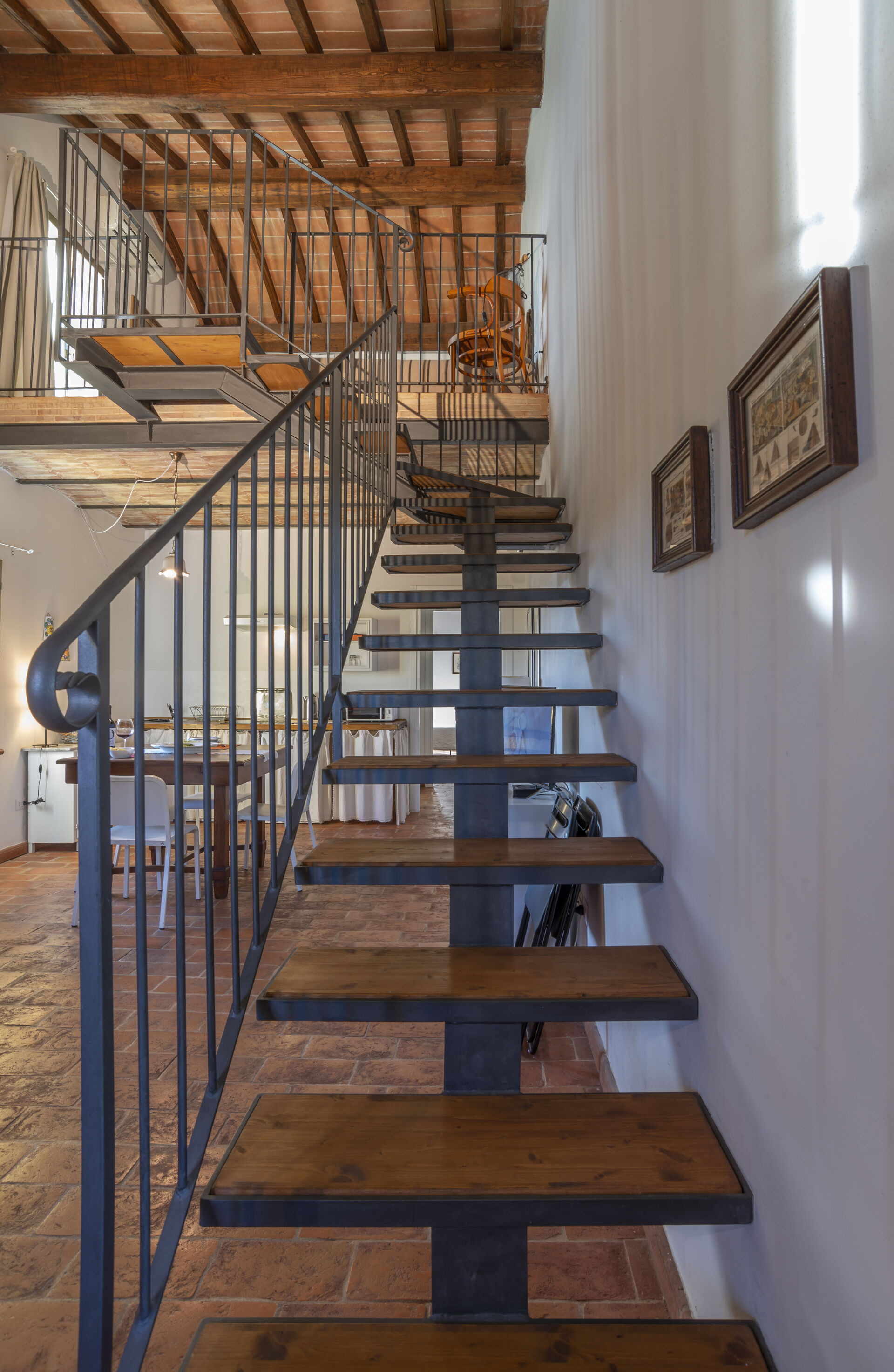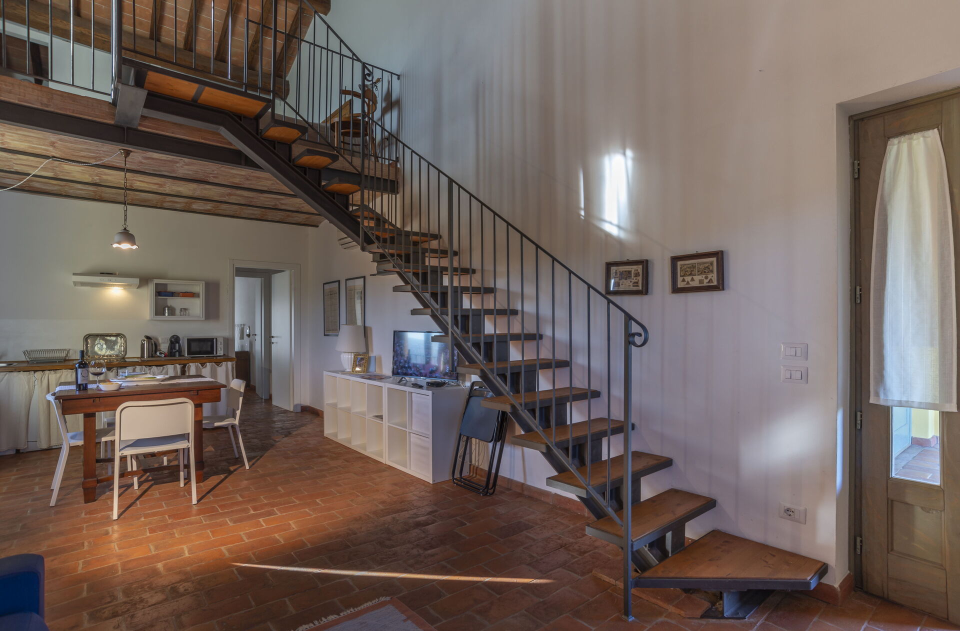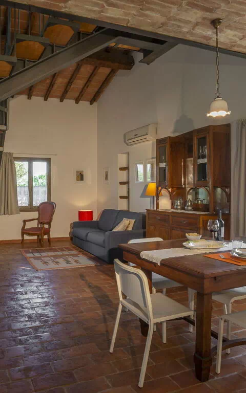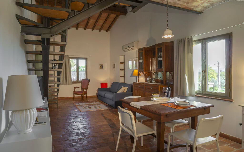 First floor: spacious living area with a living room (with an extra double sofa bed available upon request) and access to a loft with a double bed (convertible to 2 single beds upon request), a single bed and a bathroom with shower; dining area with kitchen (dishwasher, refrigerator, induction cooktop, microwave, coffee maker, fan), double bedroom, bathroom with shower.