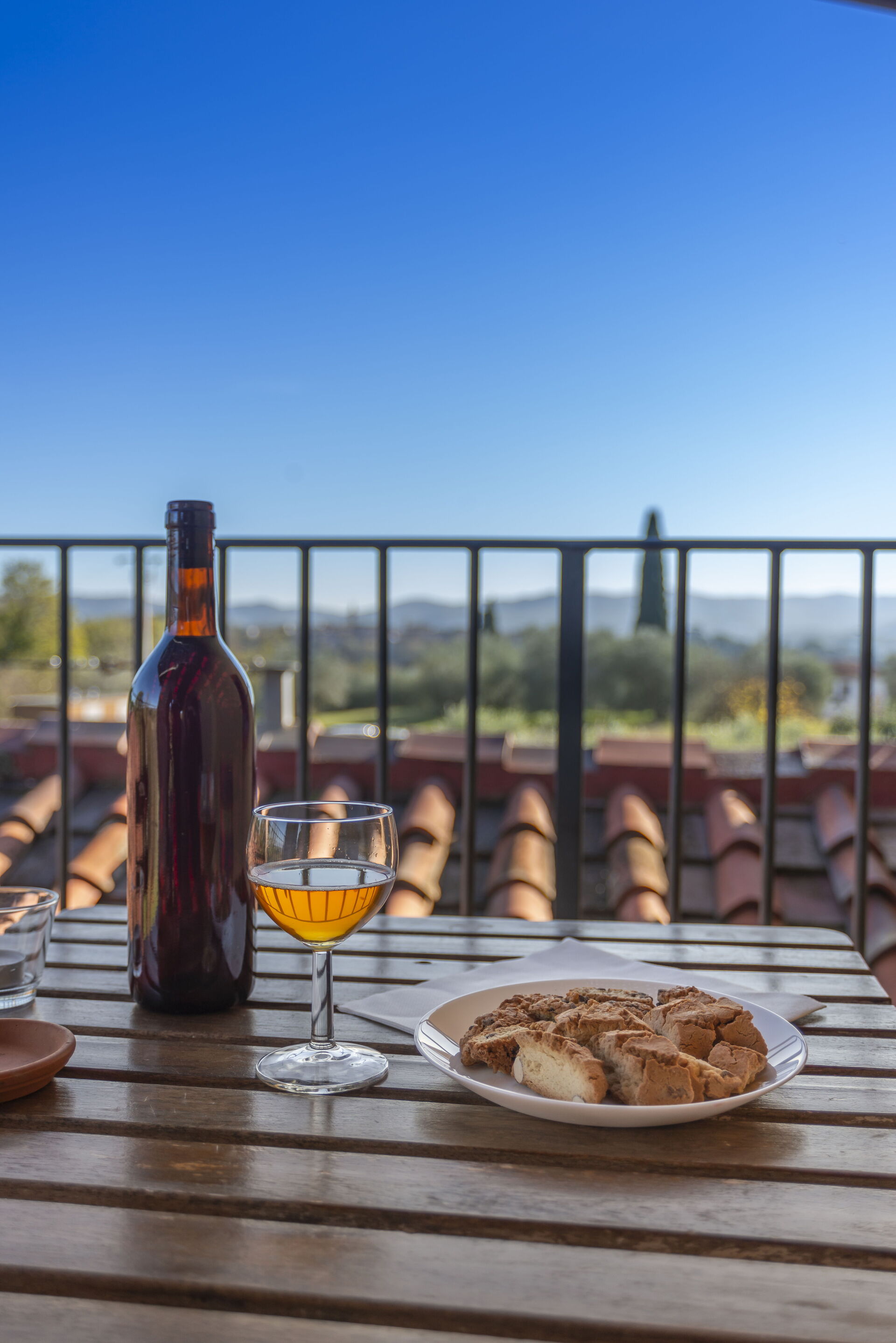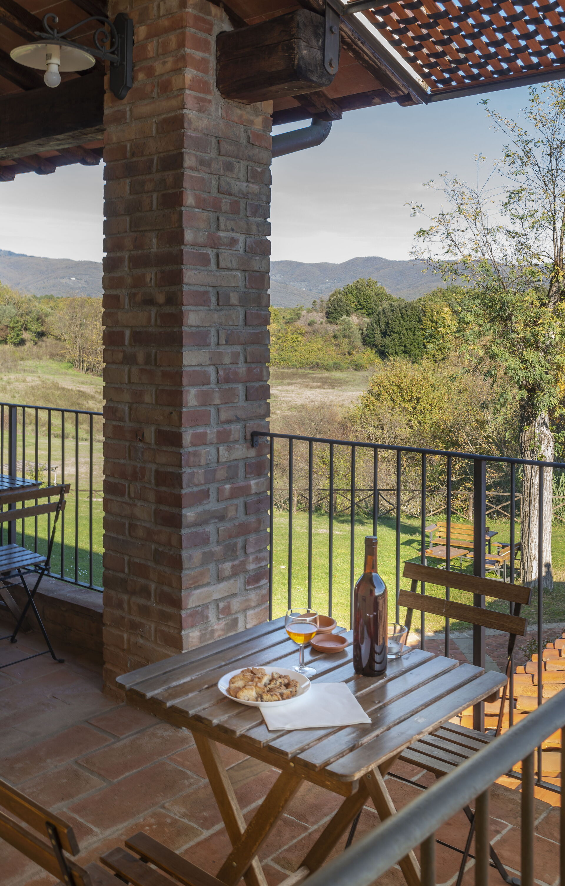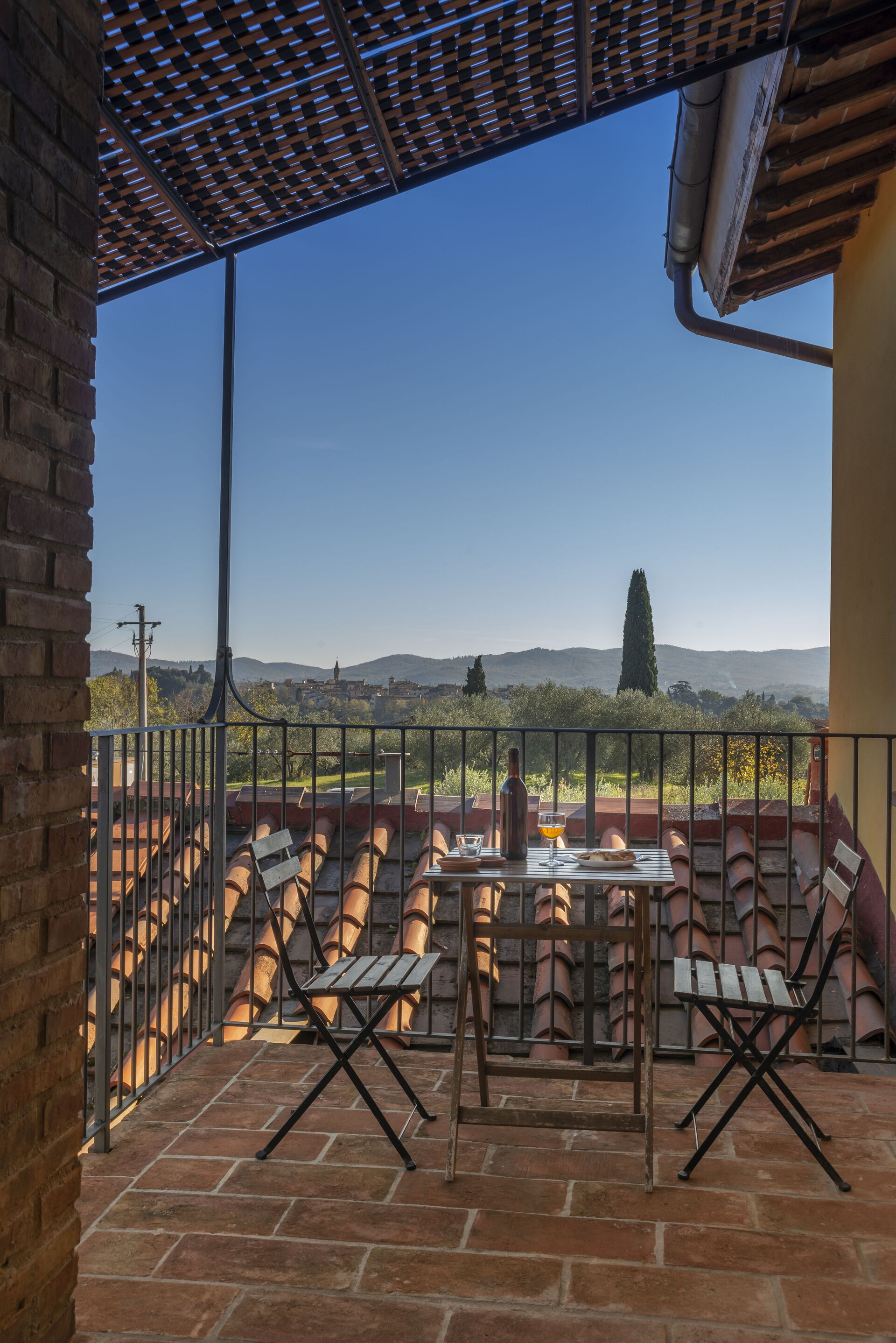Private, furnished outdoor space in a loggia, with table and chairs.