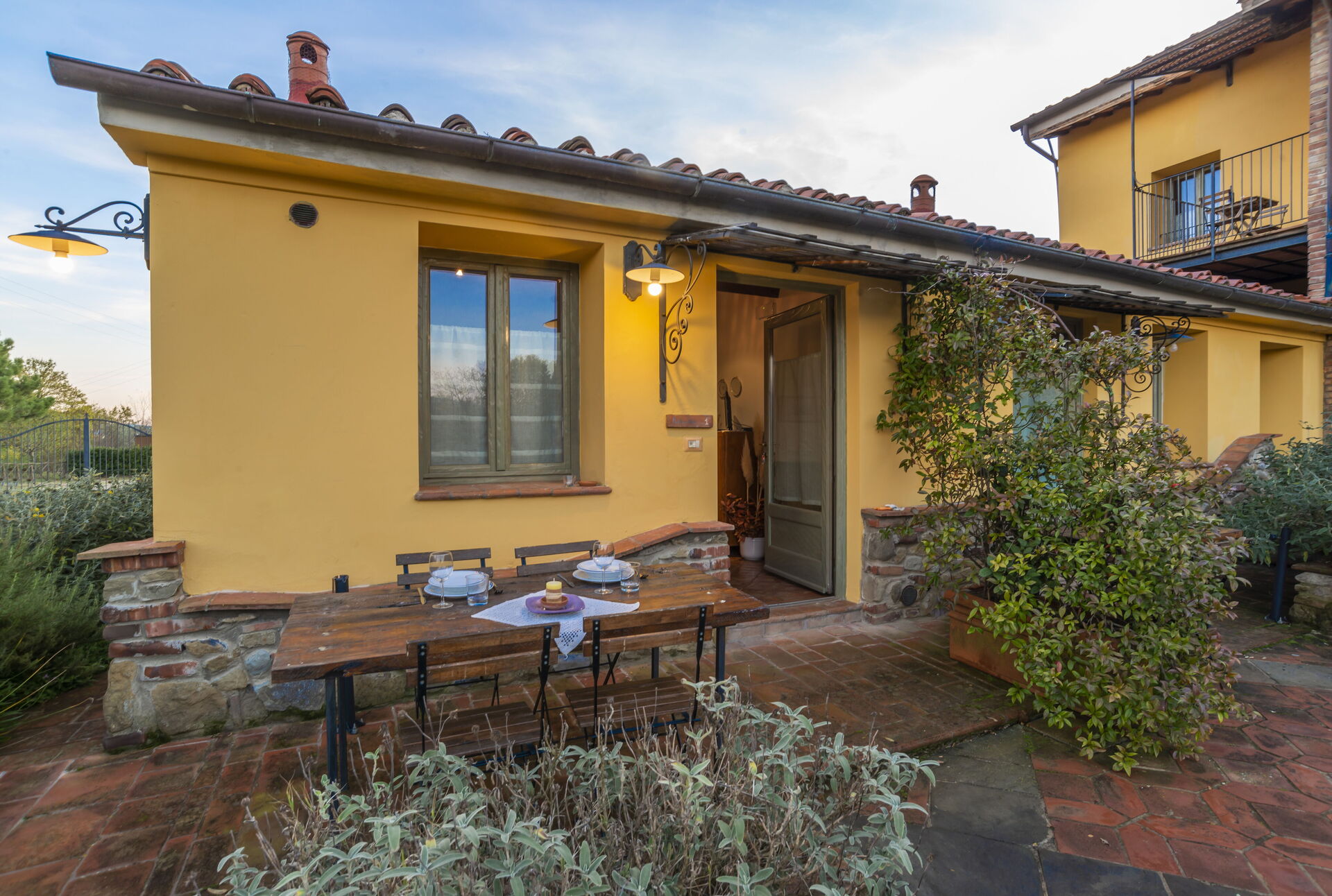 Private, furnished outdoor space with table and chairs.