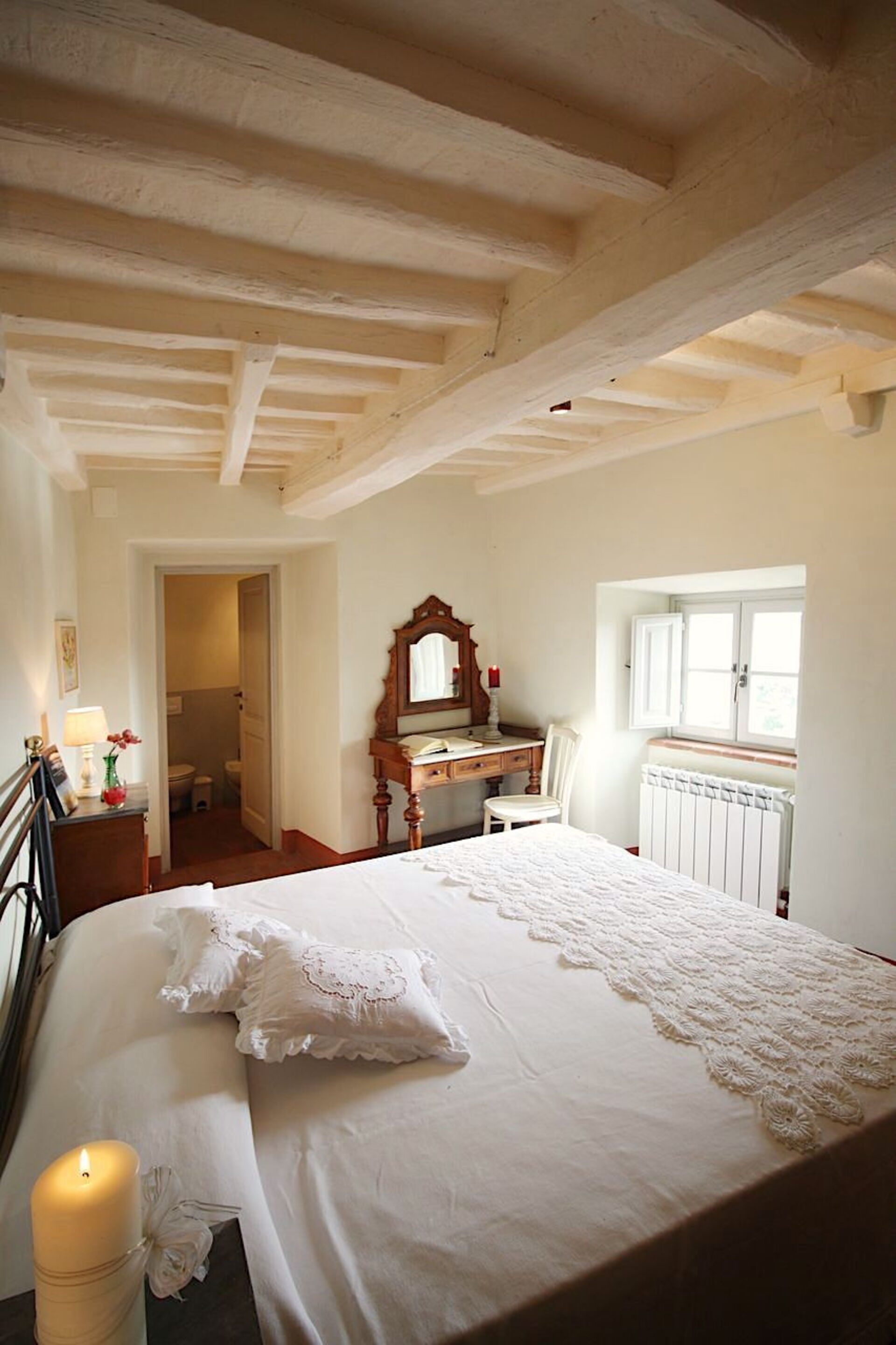 The estate features a large, meticulously maintained garden and a stunning private pool with sun loungers—an idyllic setting for soaking up the sun or cooling off on warm summer days while admiring the breathtaking Tuscan landscape. A barbecue area, a small outdoor kitchen, and a charming veranda provide the perfect space for al fresco dining.