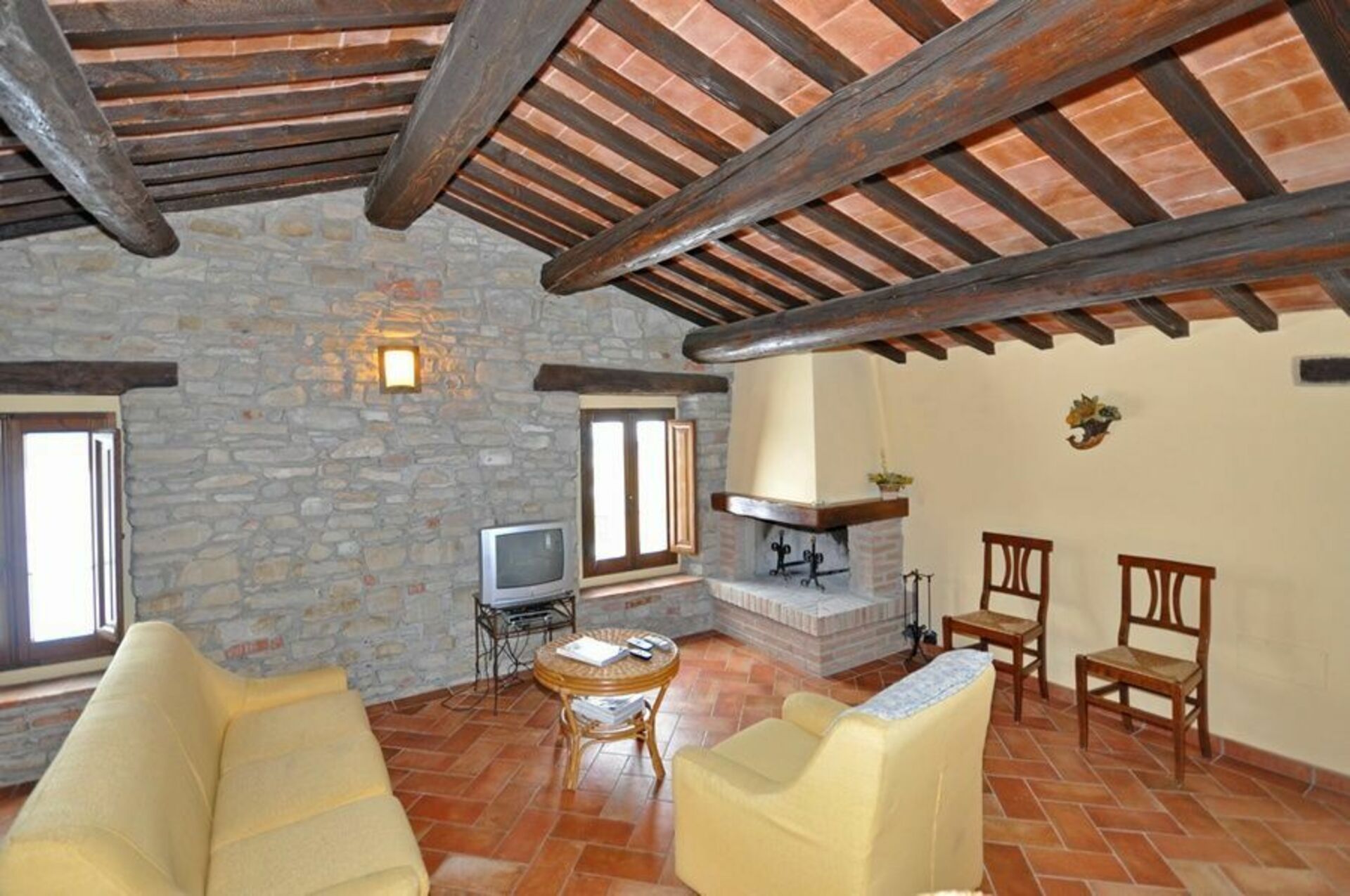 First floor: living room (satellite TV) with fireplace, dining area and kitchen corner (oven, small freezer), double bedroom, bedroom with 2 single beds, bathroom with shower.