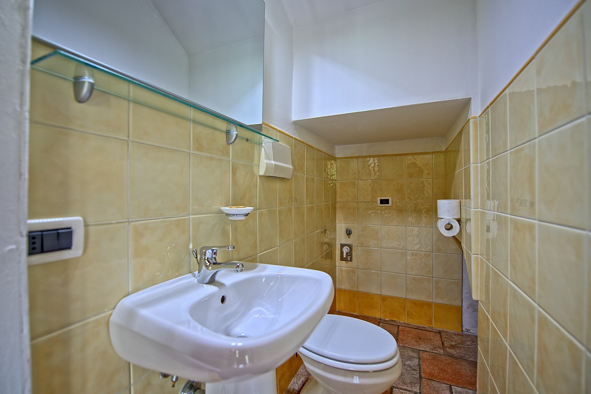 Ground floor: Entrance to living room (TV) with fireplace, dining area and kitchen corner (freezer, microwave, dishwasher), WC.