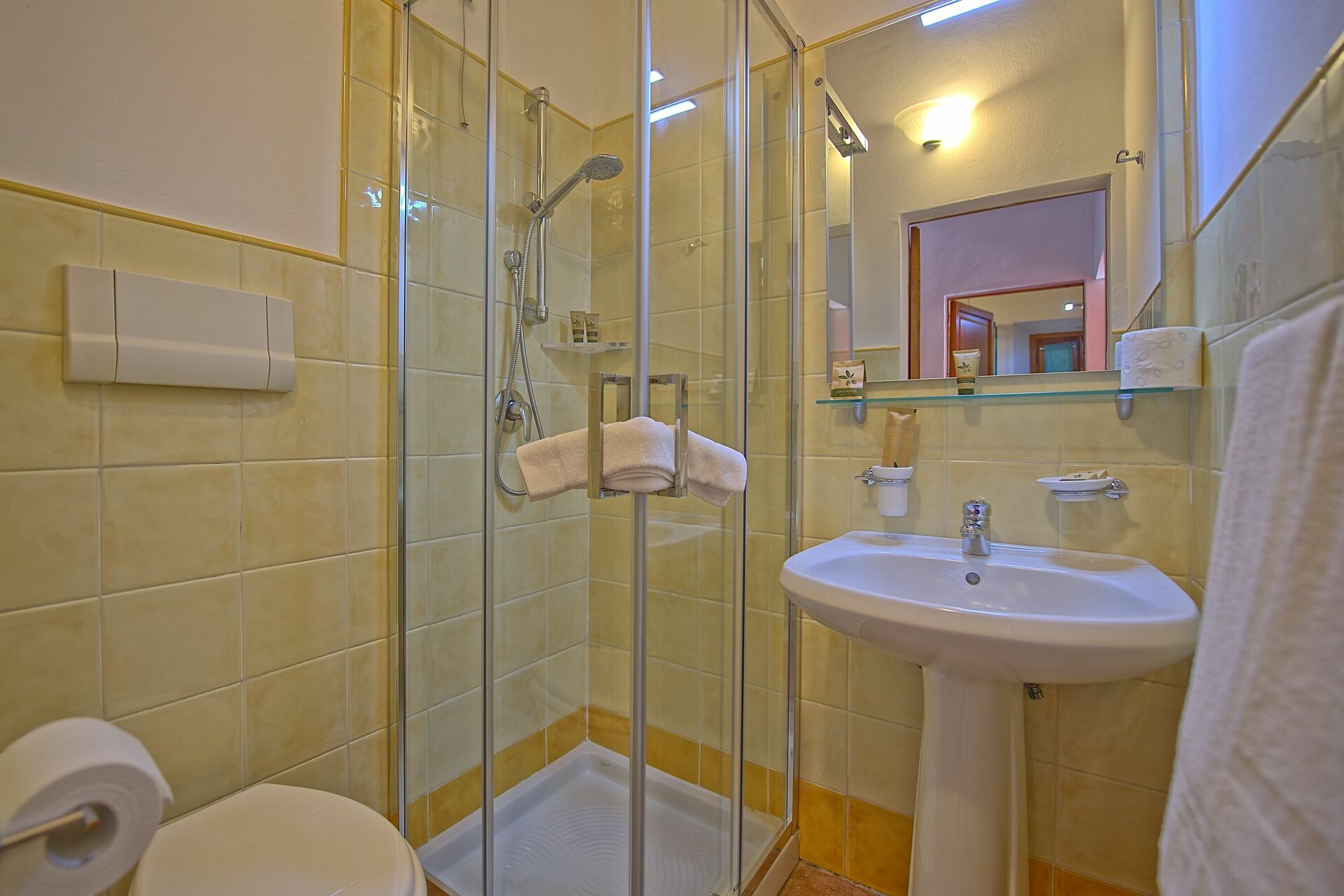 Ground floor: Entrance to living room (TV) with fireplace, dining area and kitchen corner (dishwasher, freezer, microwave), double bedroom, bathroom with shower, bedroom with a single bed, bathroom with shower (no bidet).