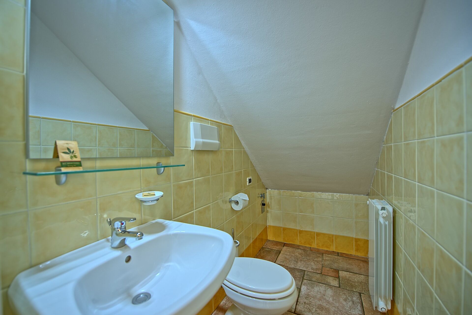 Ground floor: entrance to living room (TV) with fireplace, dining area and kitchen corner (freezer, microwave, dishwasher), WC, bedroom with a single bed and access to the outside, double bedroom with access to the outside, bathroom with shower.