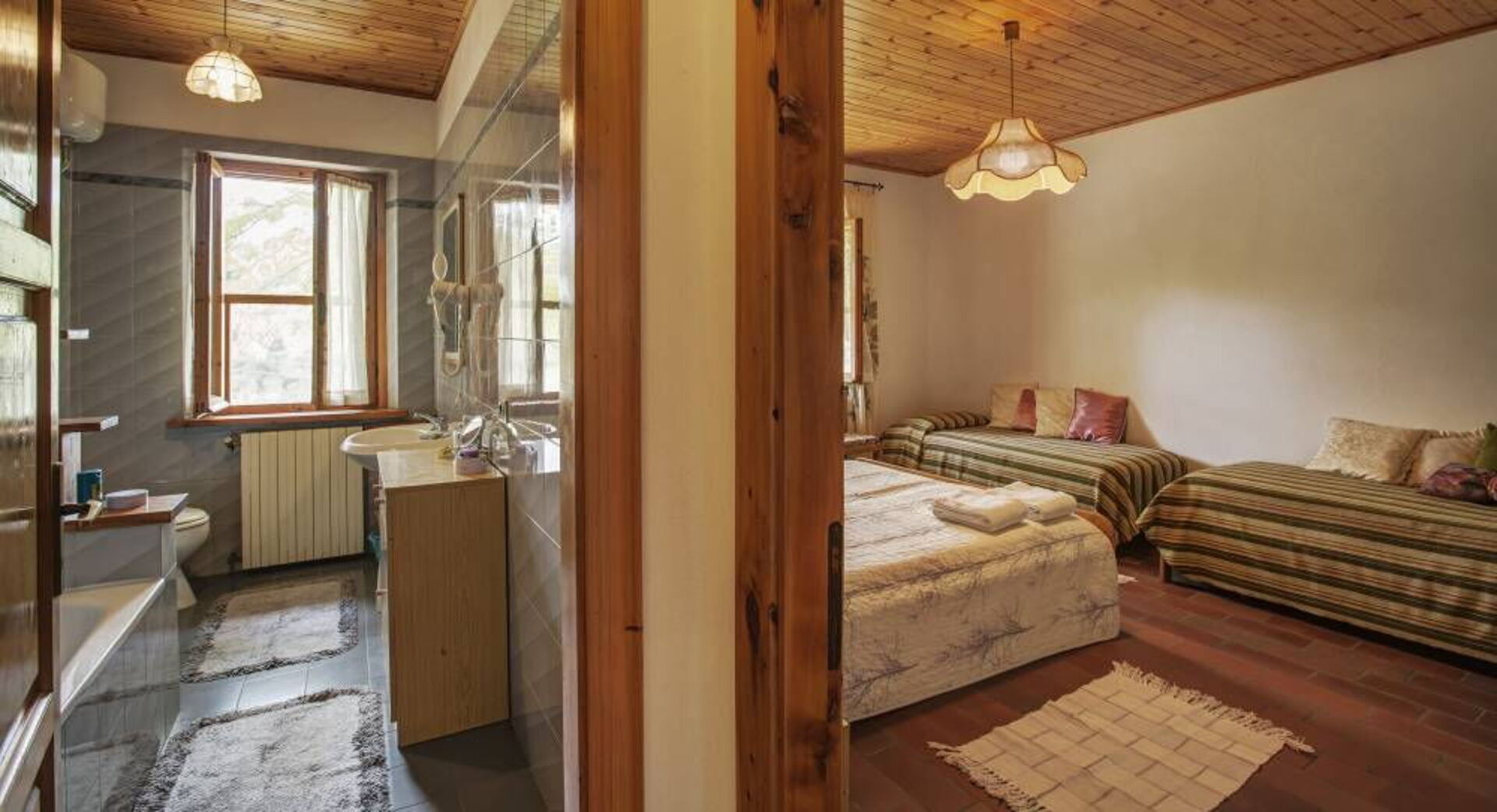 First floor: living area with living room with fireplace and dining area with kitchen (dishwasher, oven, toaster, espresso maker, American coffee maker), double bedroom, bedroom with double bed and 2 single beds, bathroom with bathtub